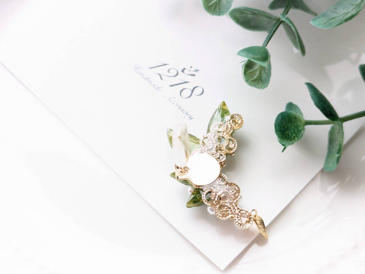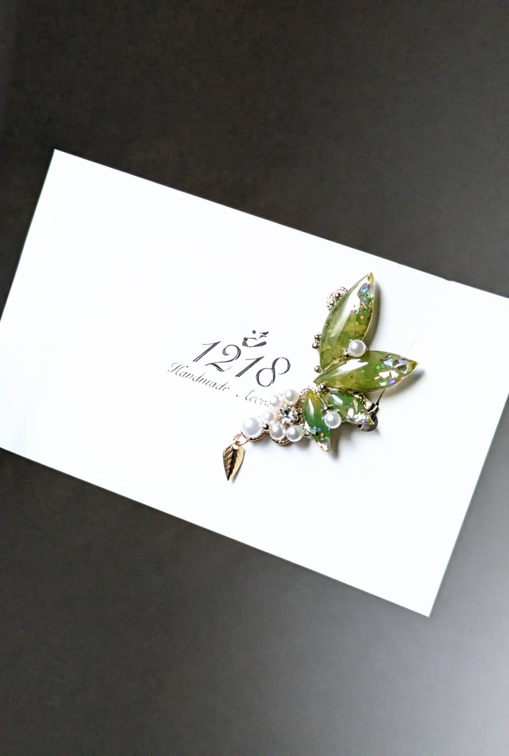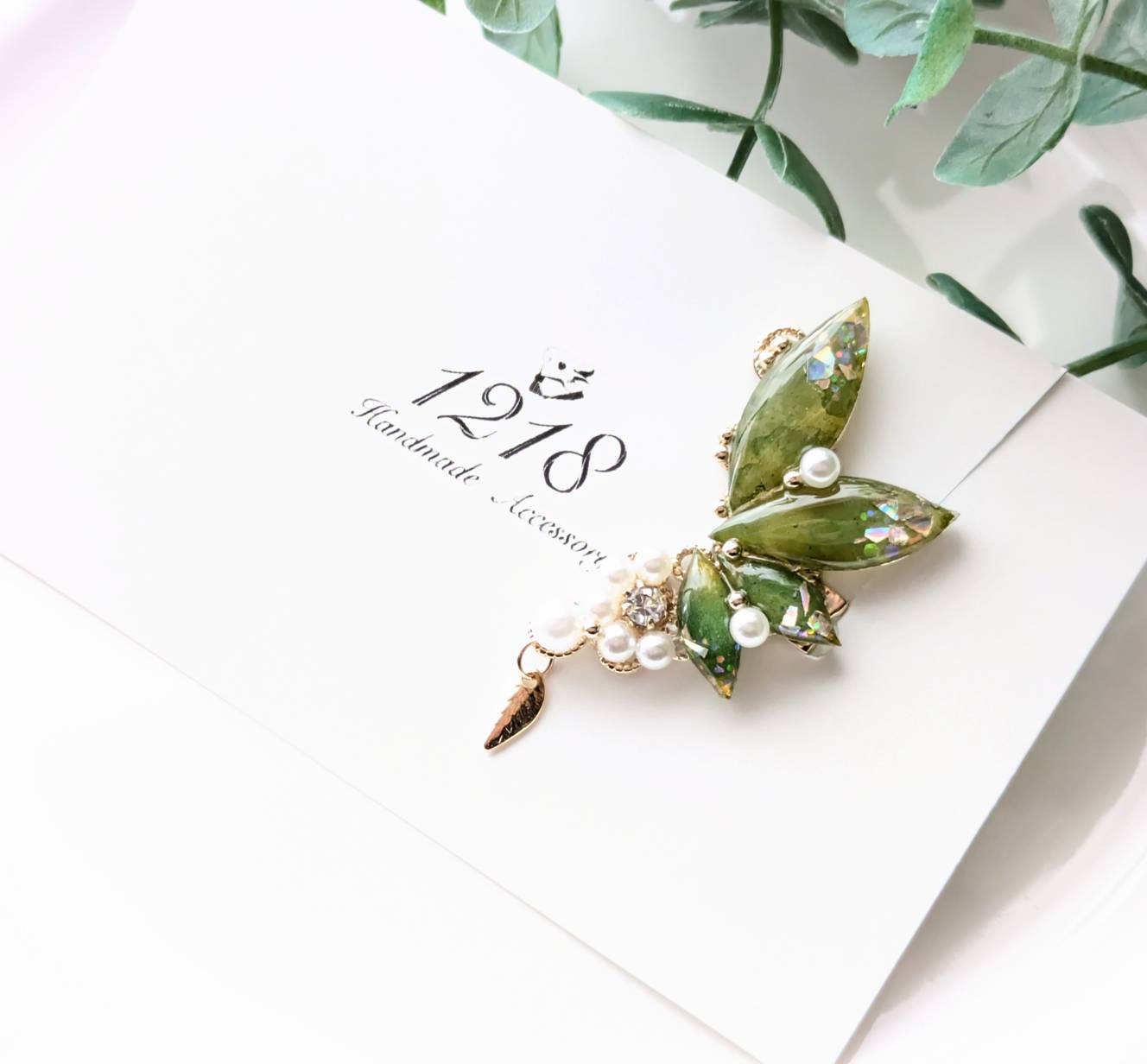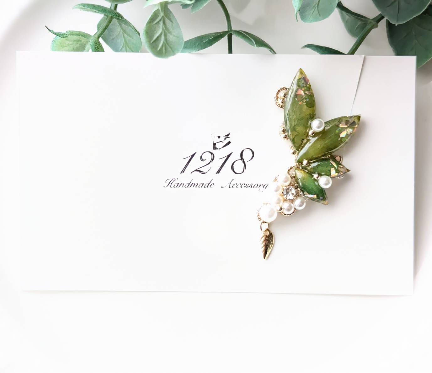 芽吹きの緑、暖かな光を浴びる新緑に喜び歌う妖精の羽をイメージして美しいイヤーカフを作成しました。