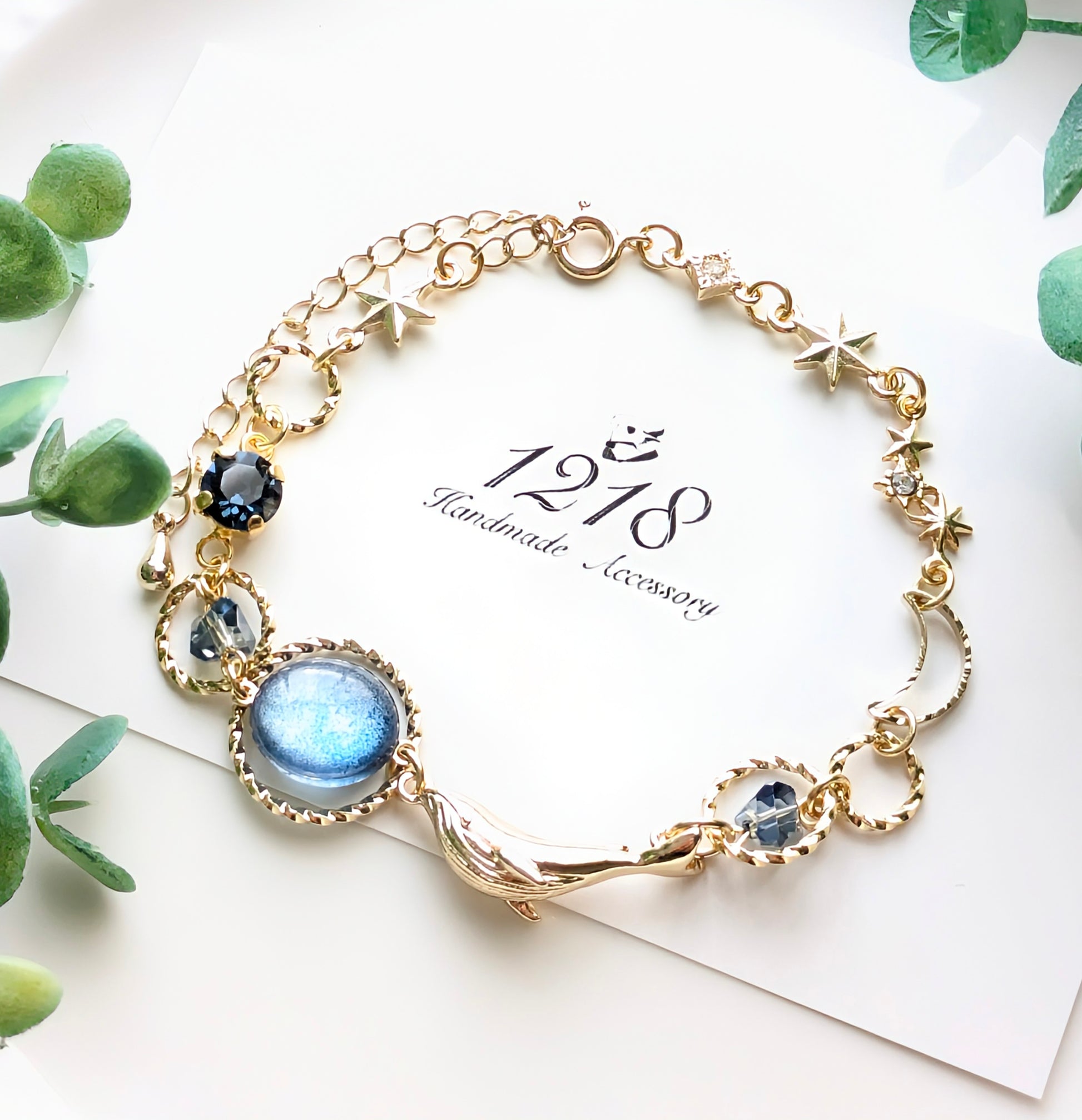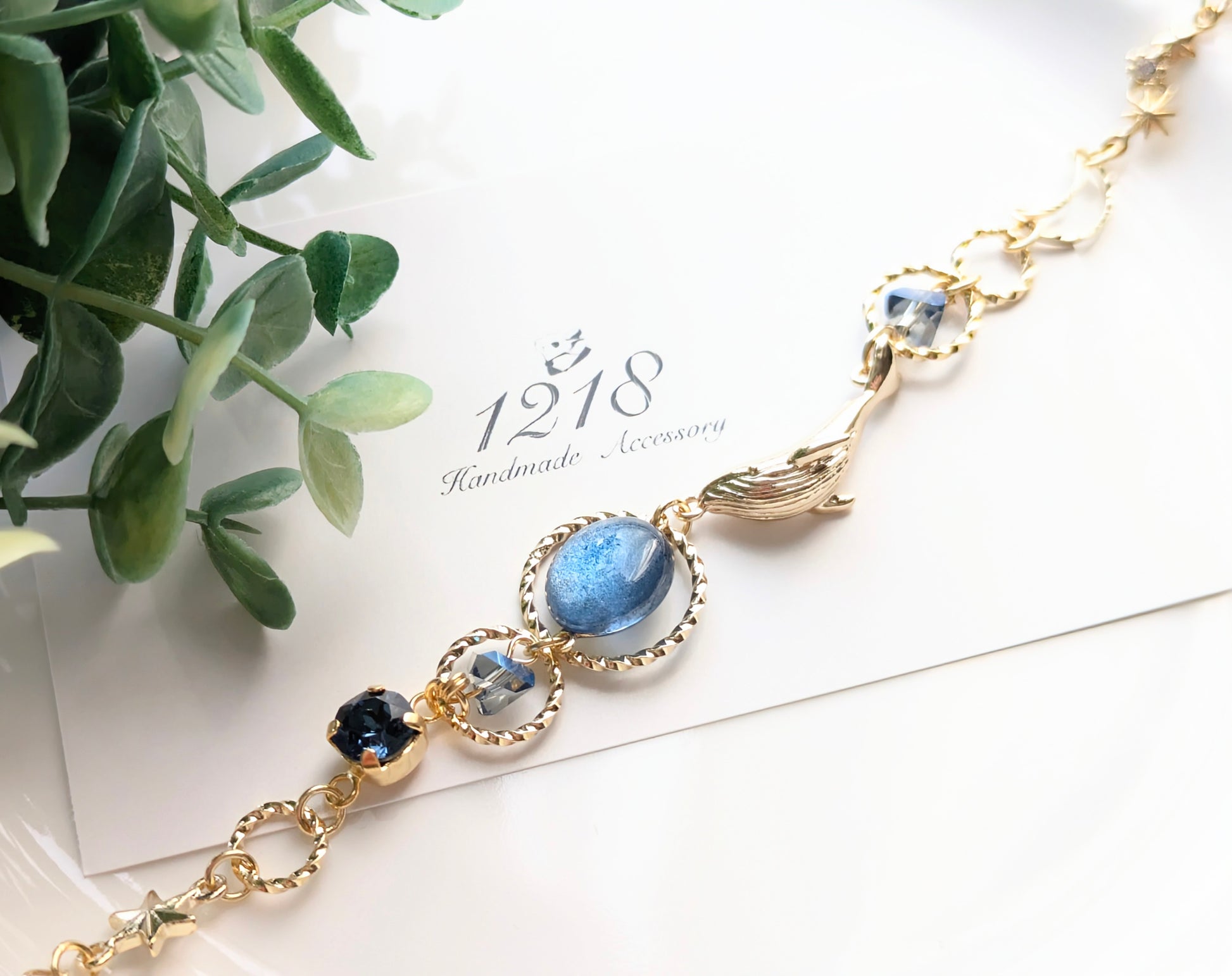 海と空の境目にゆったりと身を預けながら夜空を泳ぐ夢を見る姿をイメージして美しいブレスレットを作成しました。