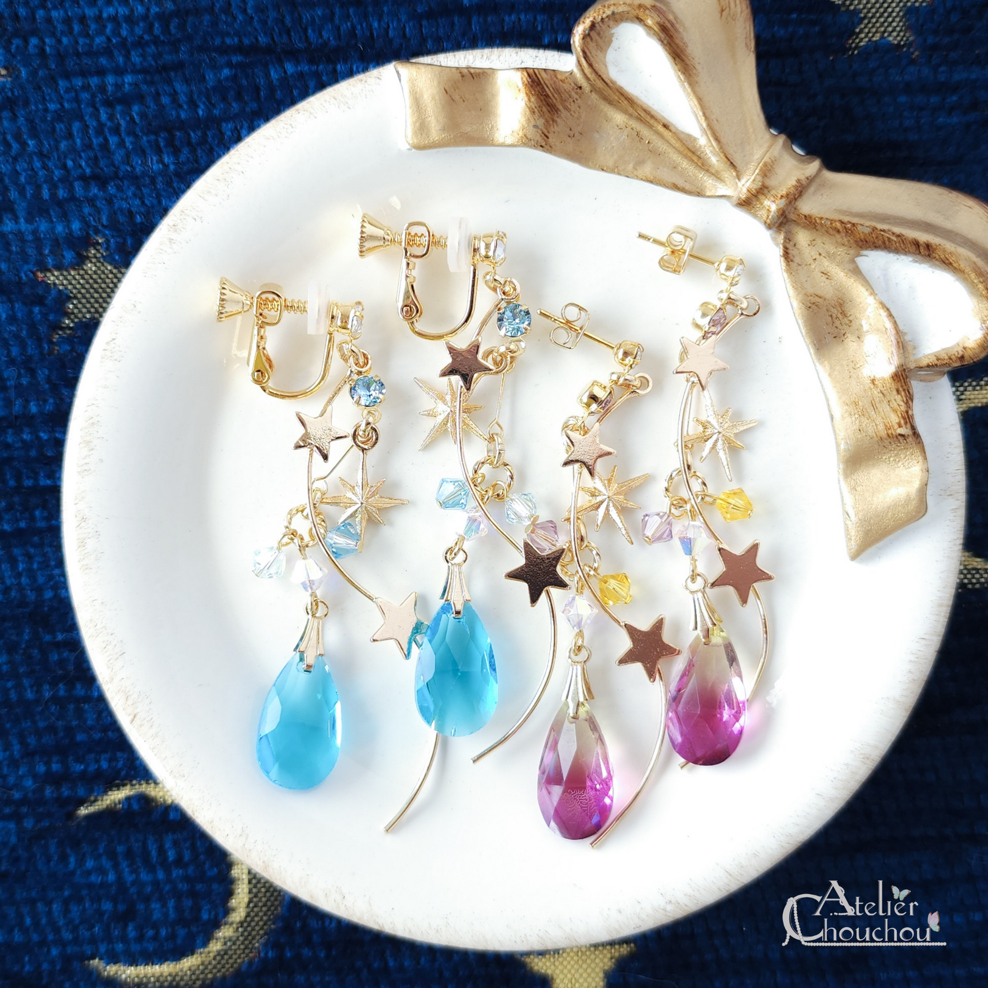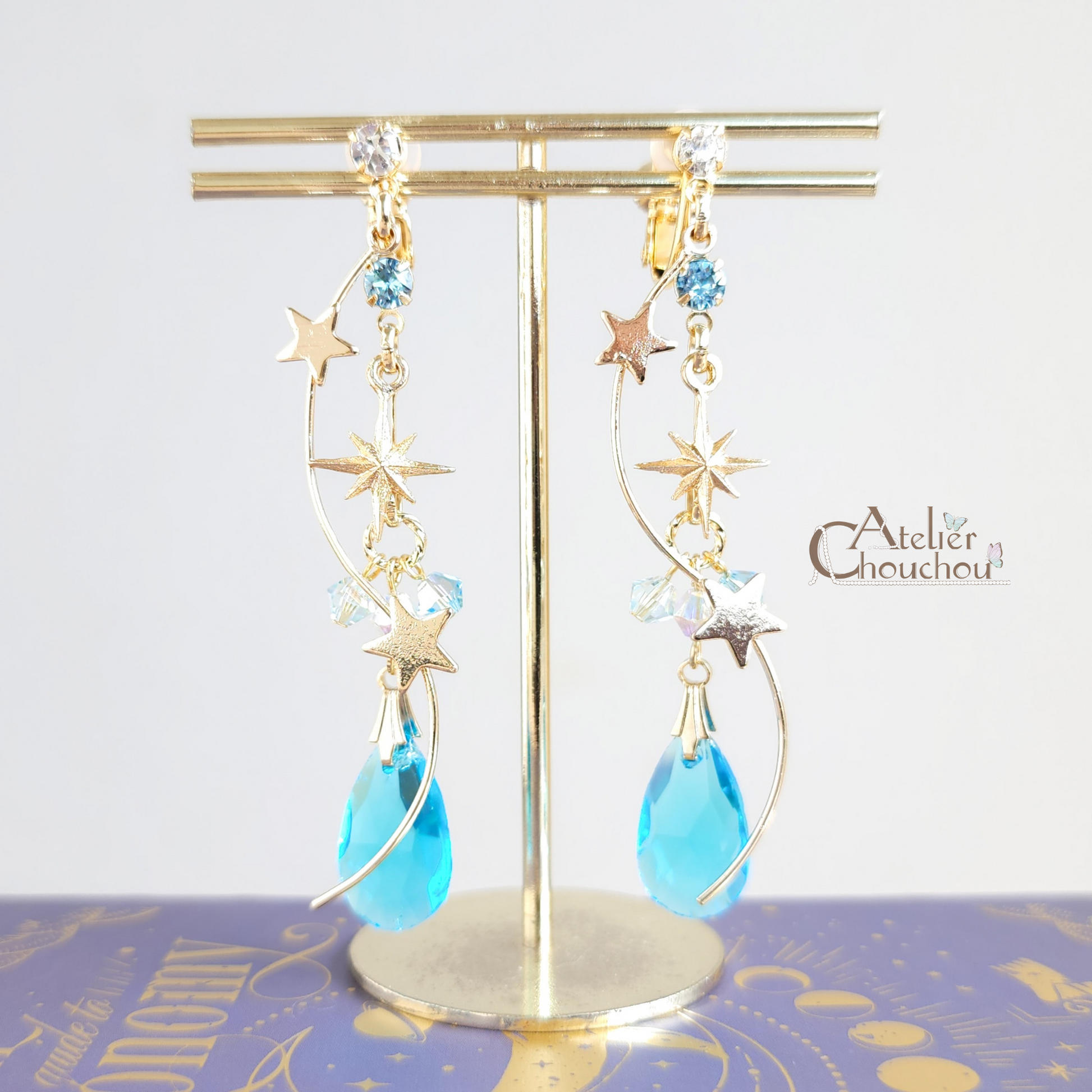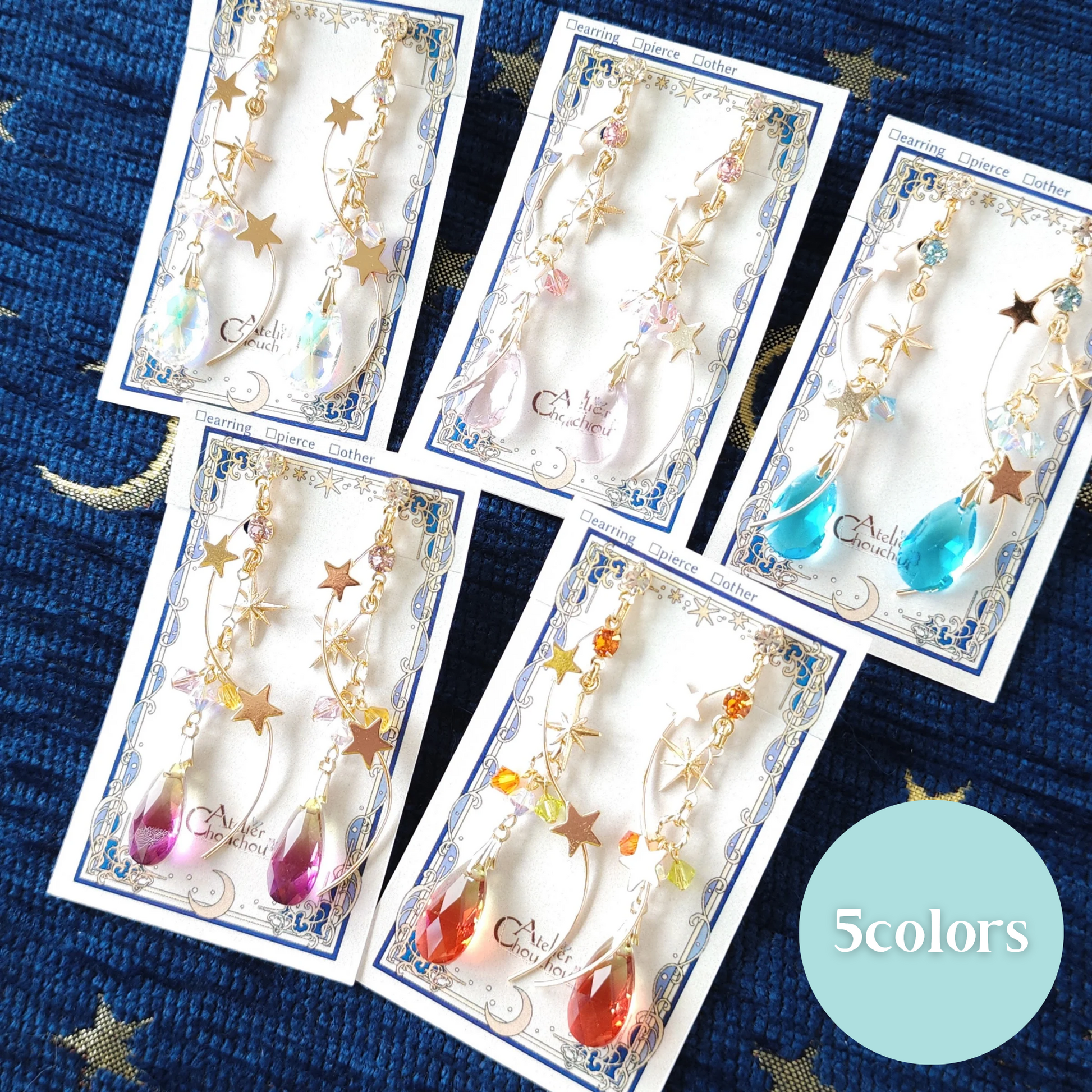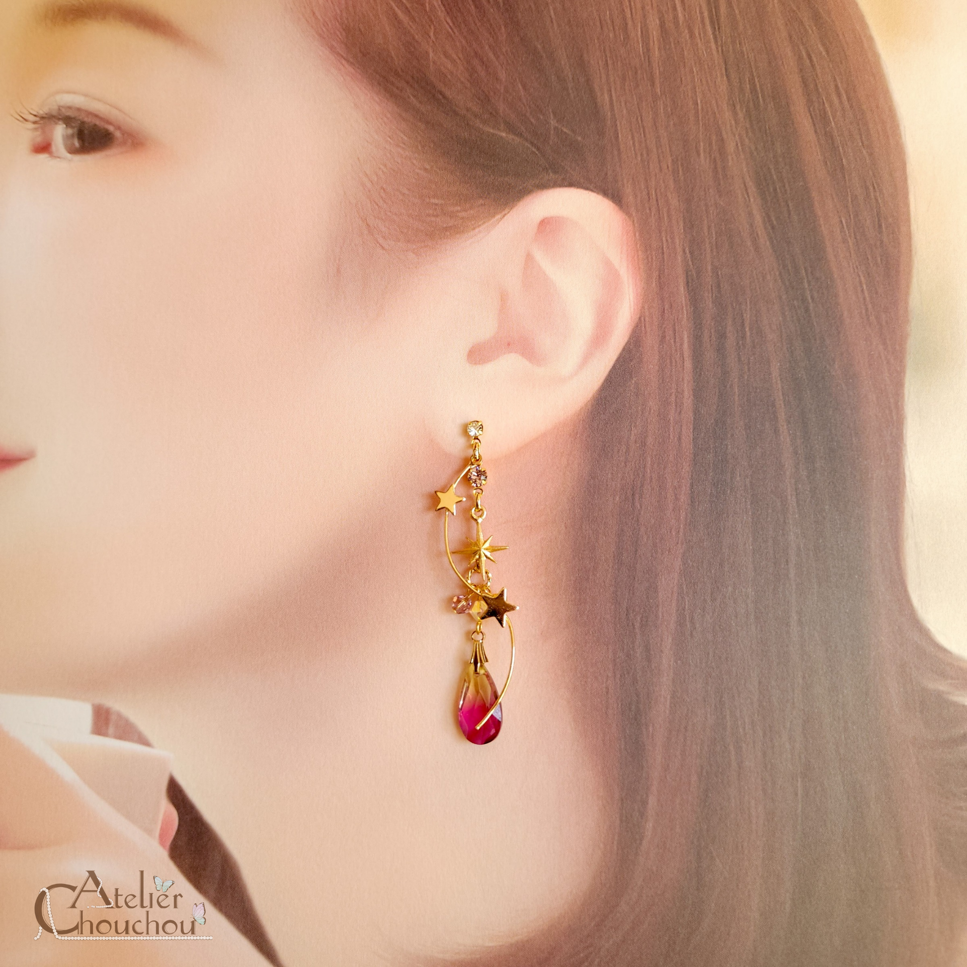 パッと目を引く大粒のガラスストーンと星のバーがゆらゆら揺れる耳飾りです。