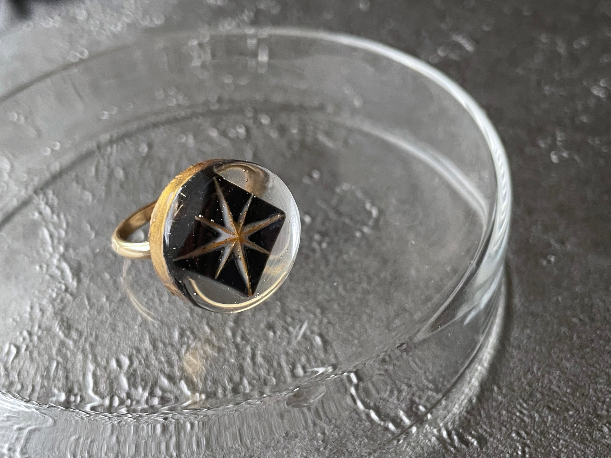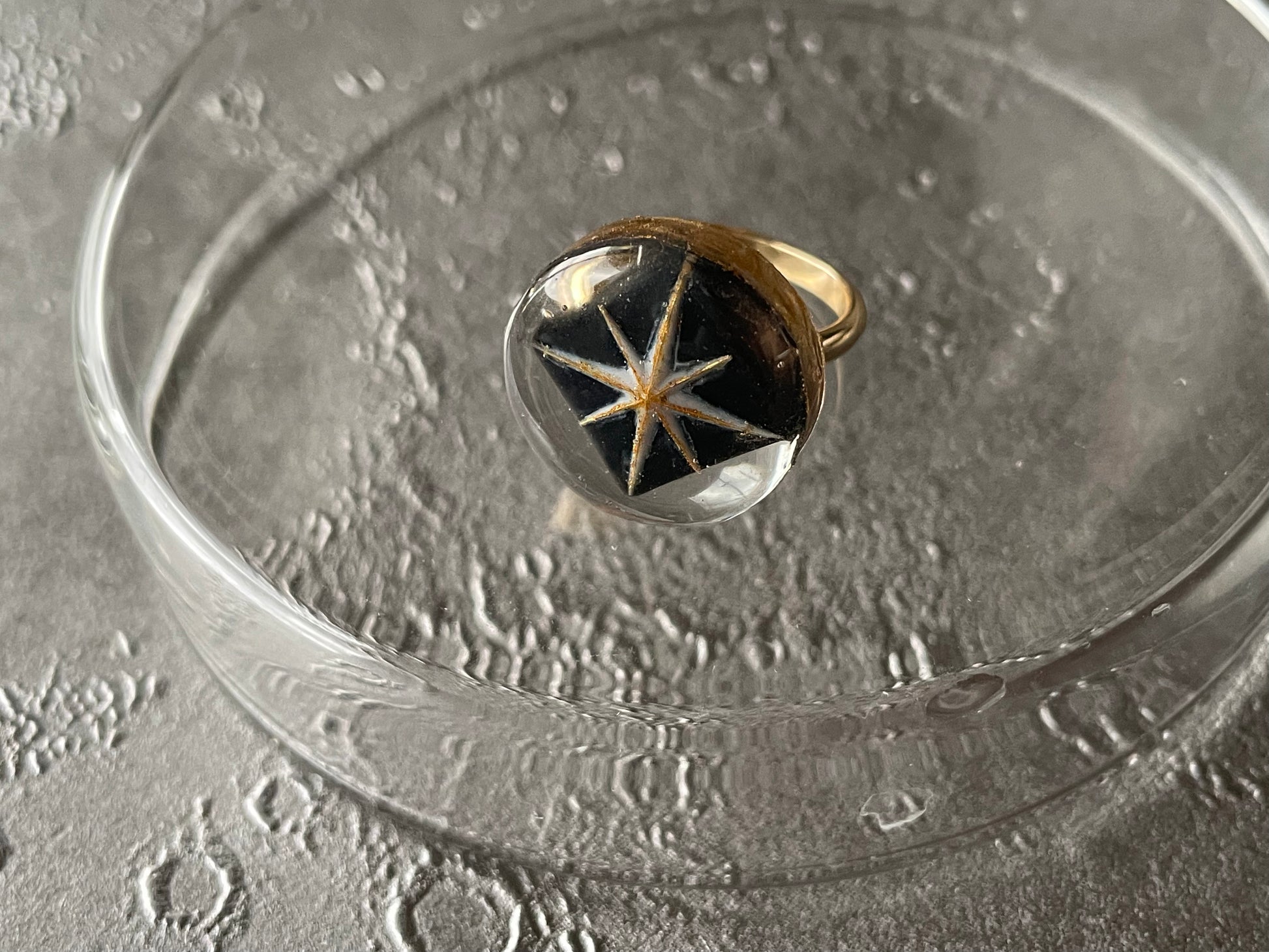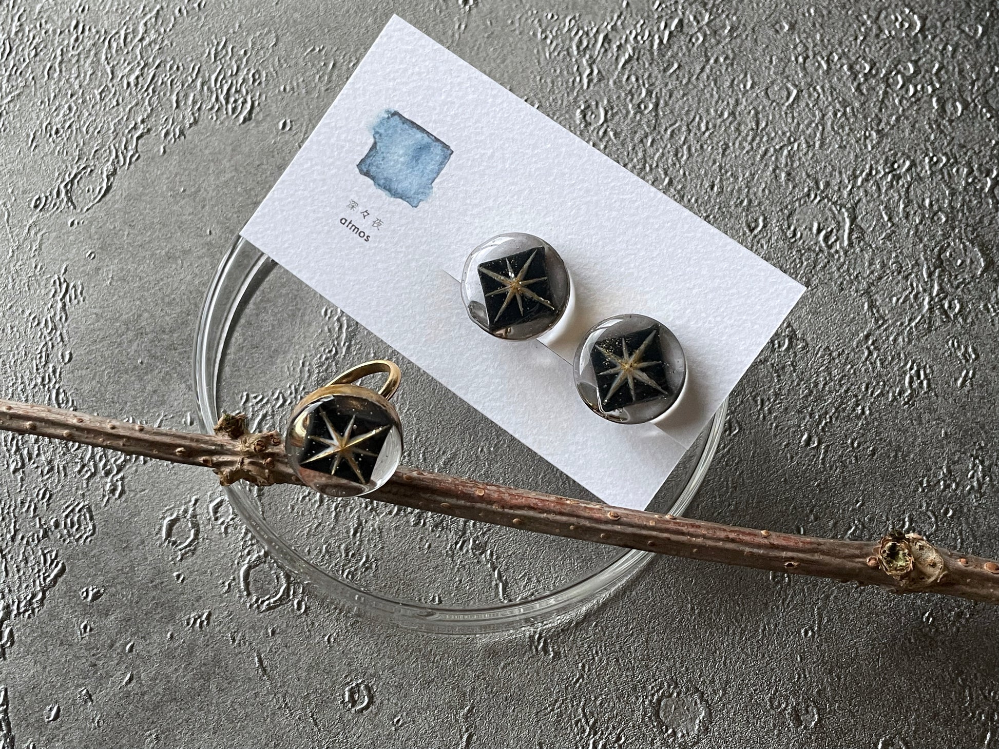 墨を溶かしたような夜空に浮遊した星の耳飾りと指輪のセットです。