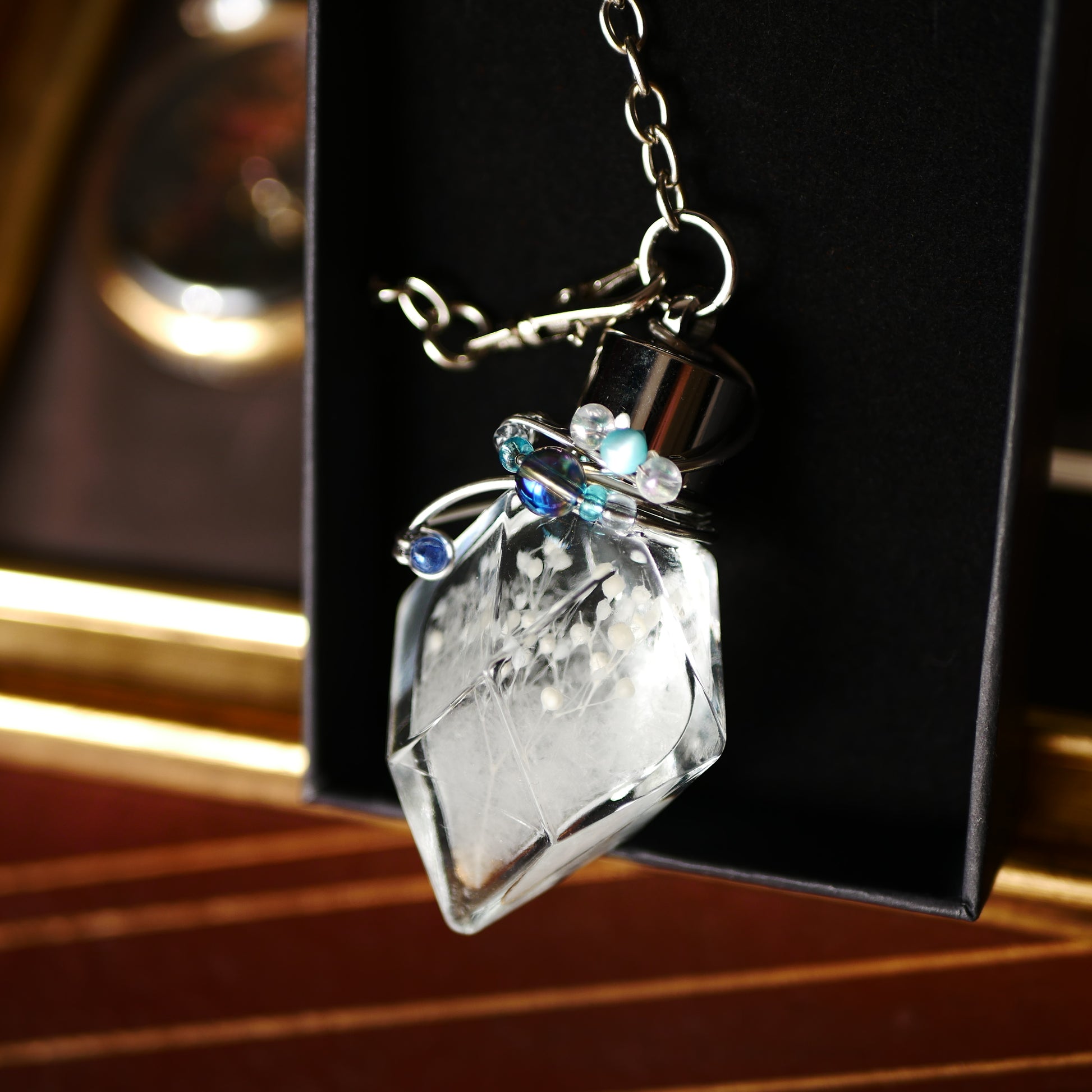 ガラスボトルの中に混合液とドライフラワーを閉じ込めて作ったオリジナルデザインのストームグラスです。