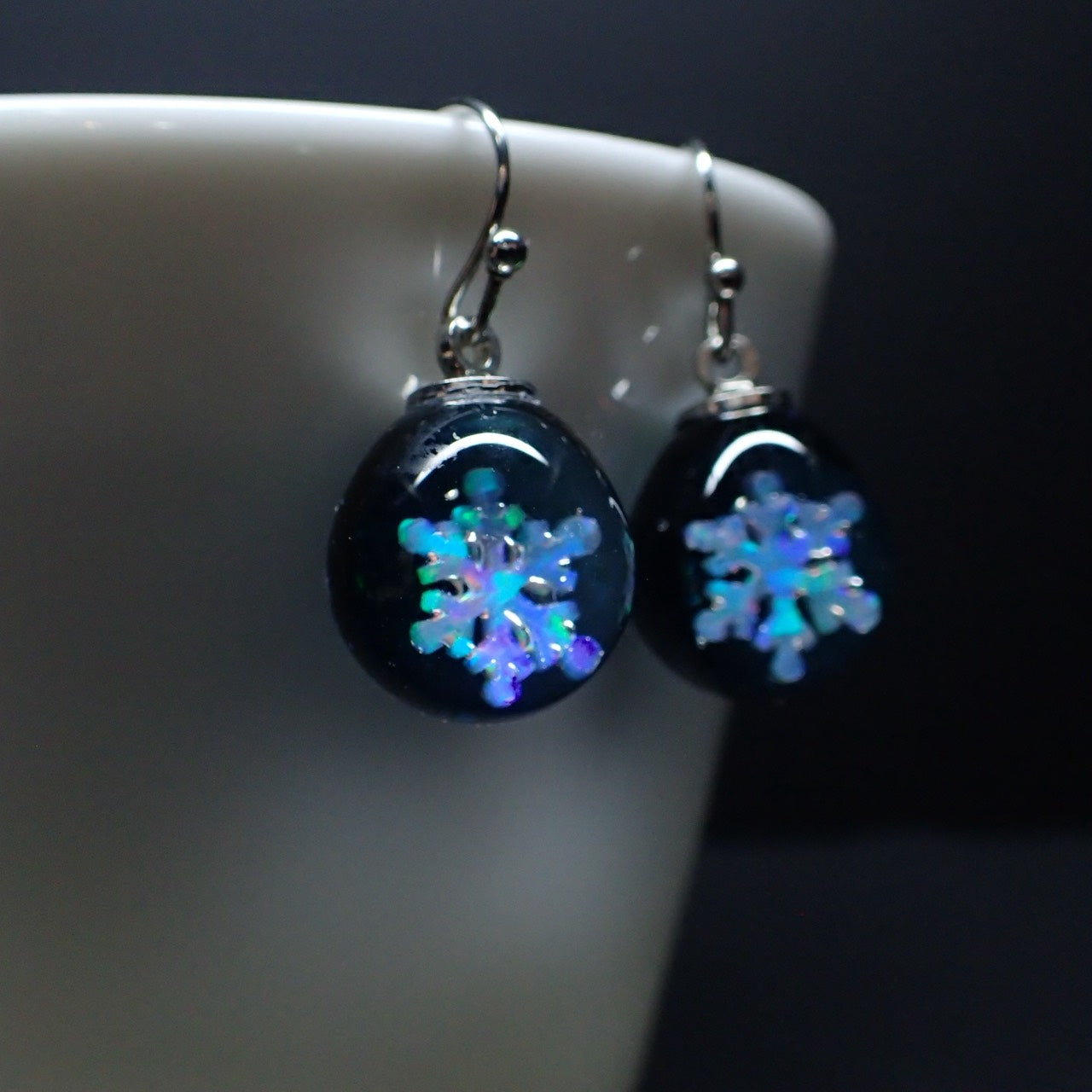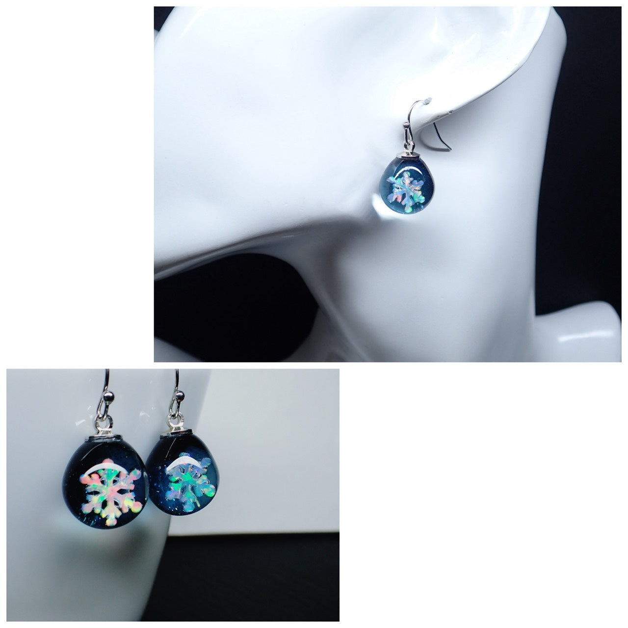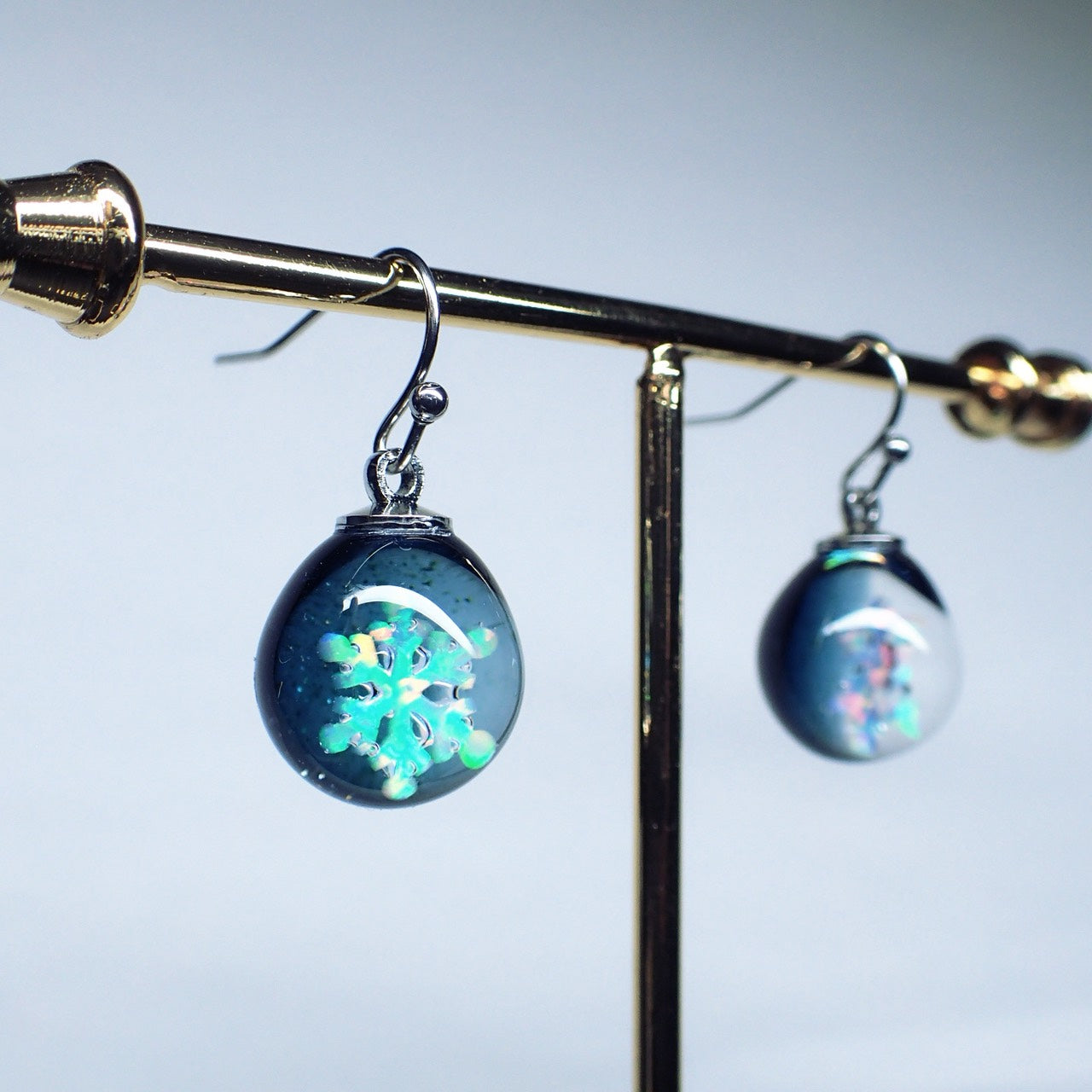 雫形のガラスに雪の結晶のオパールを閉じ込めた「雪の雫」ピアスは、