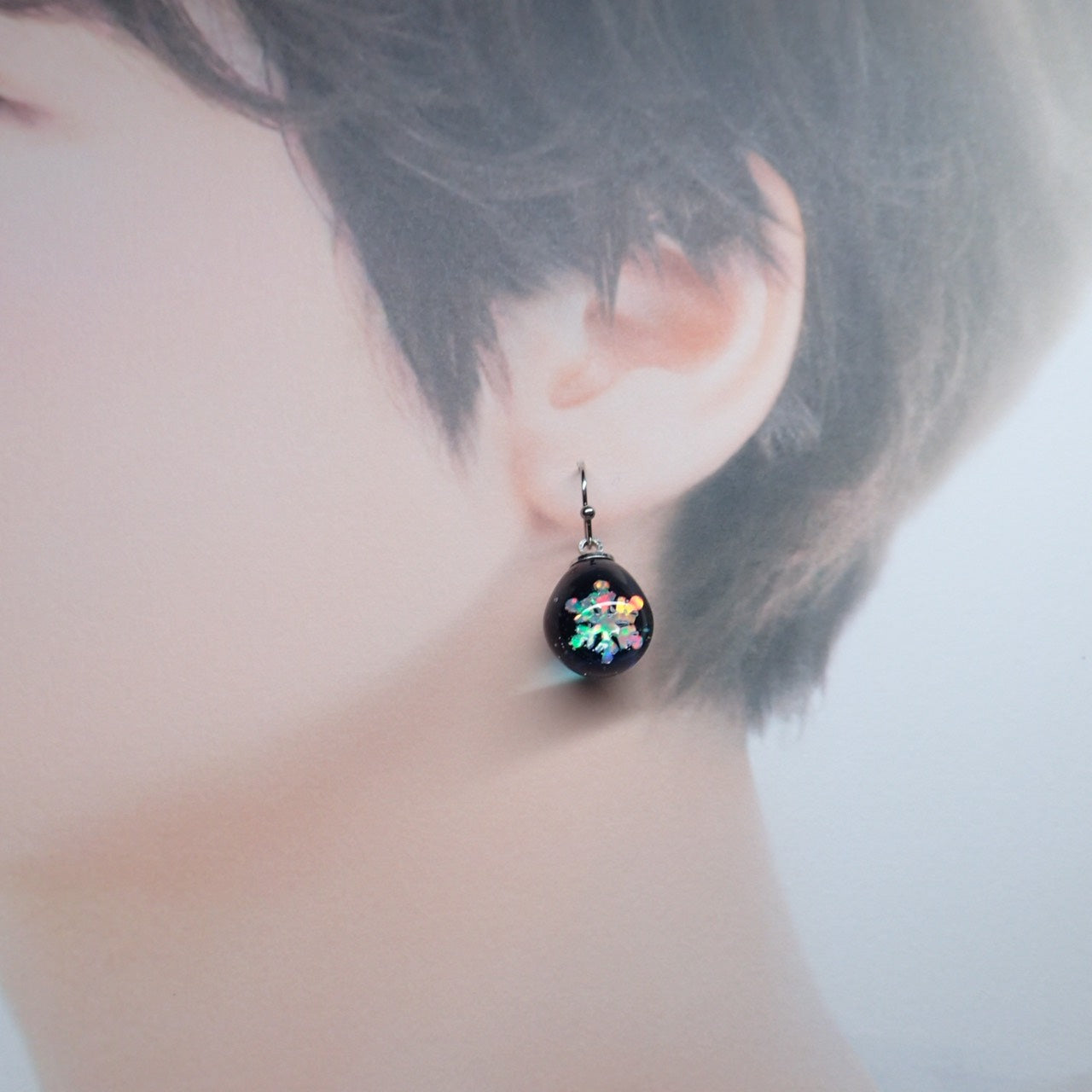夜空に落ちる一粒の雪のようなイメージでデザインしたガラスピアスです。