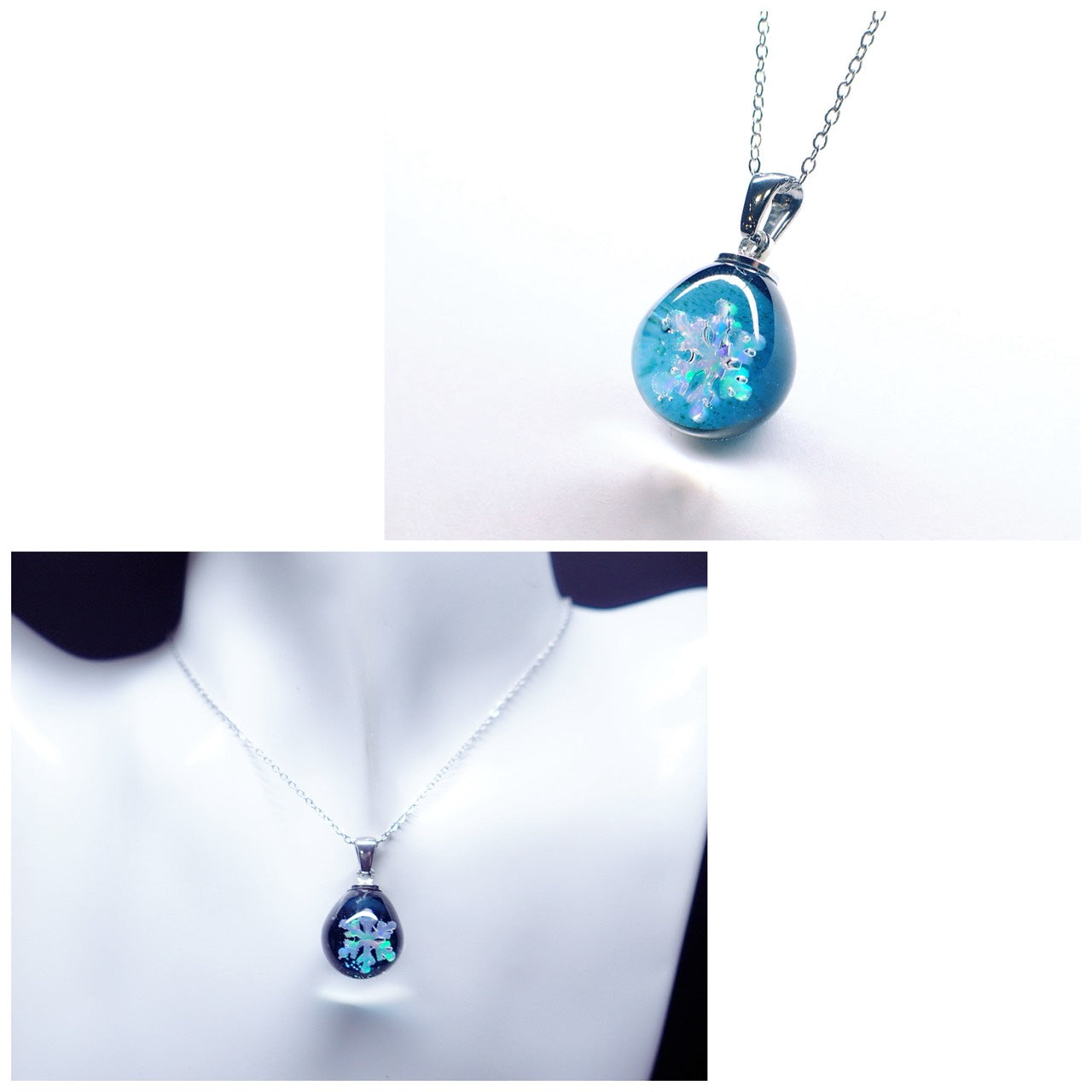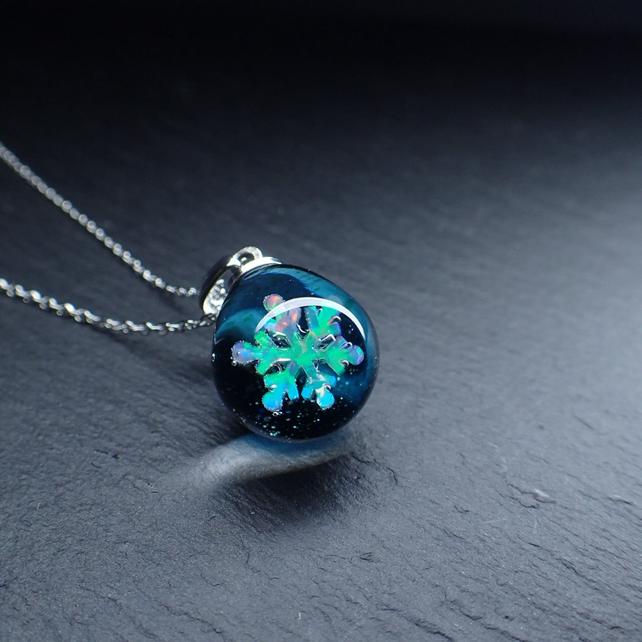 雫形のガラスに雪の結晶のオパールを閉じ込めた「雪の雫」ペンダントは、