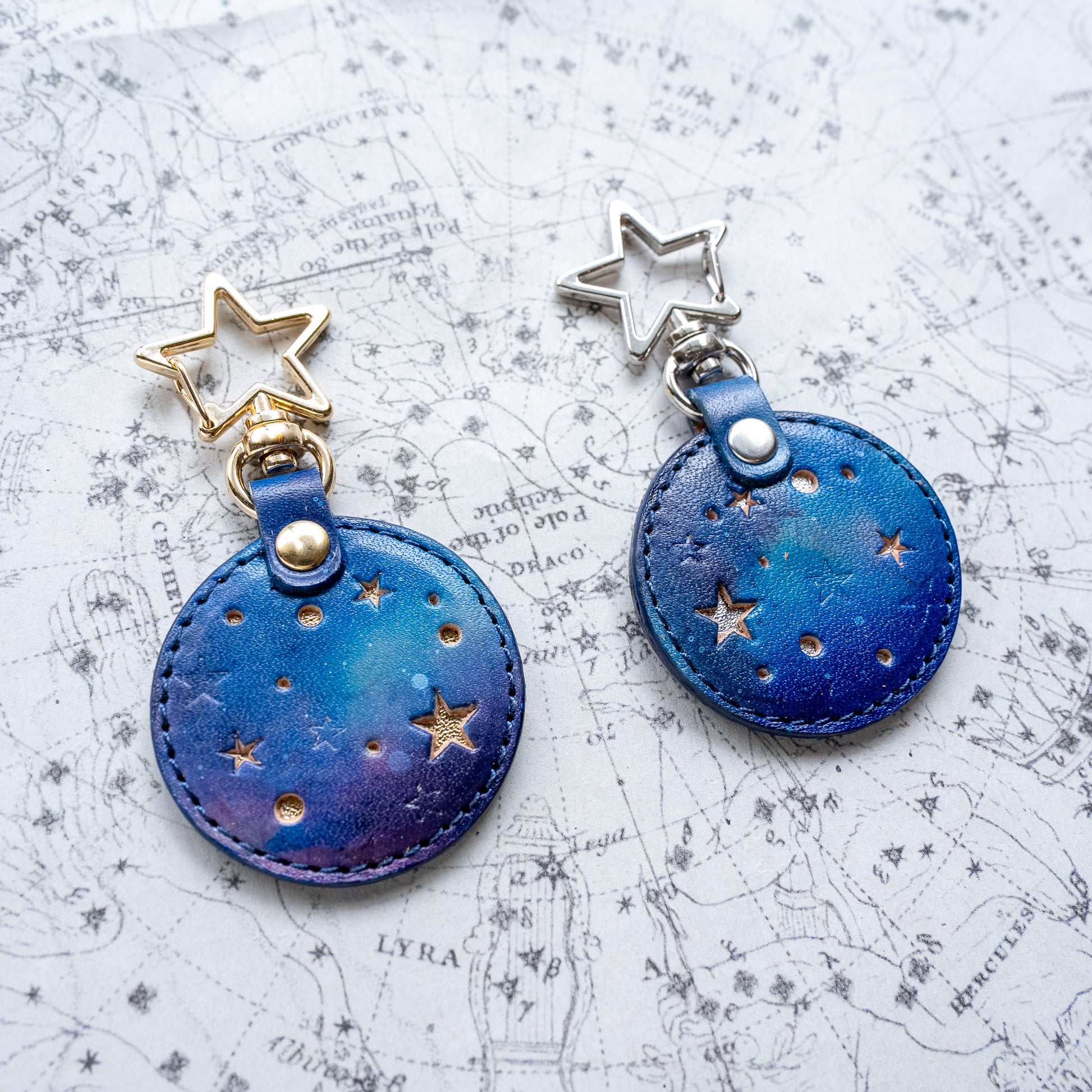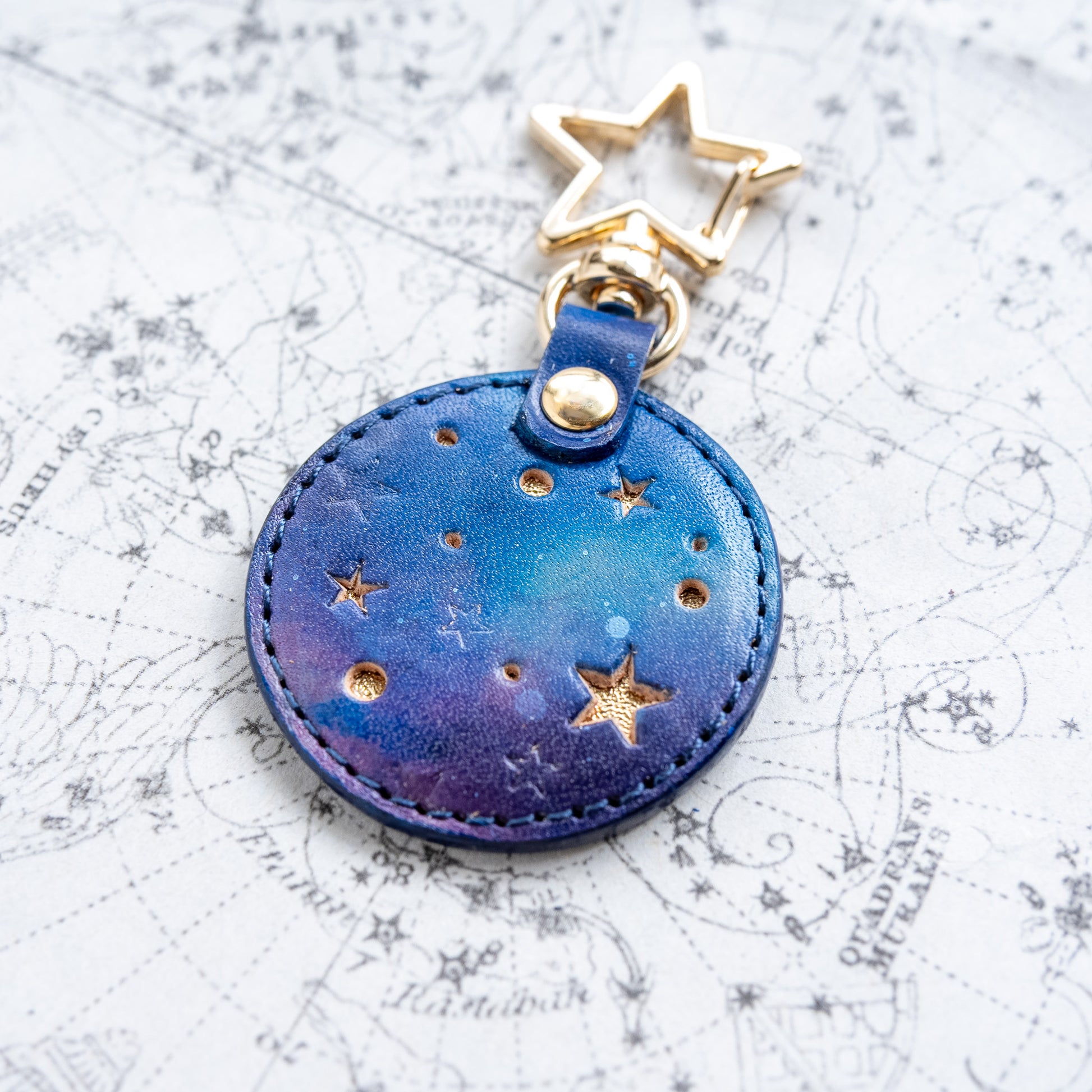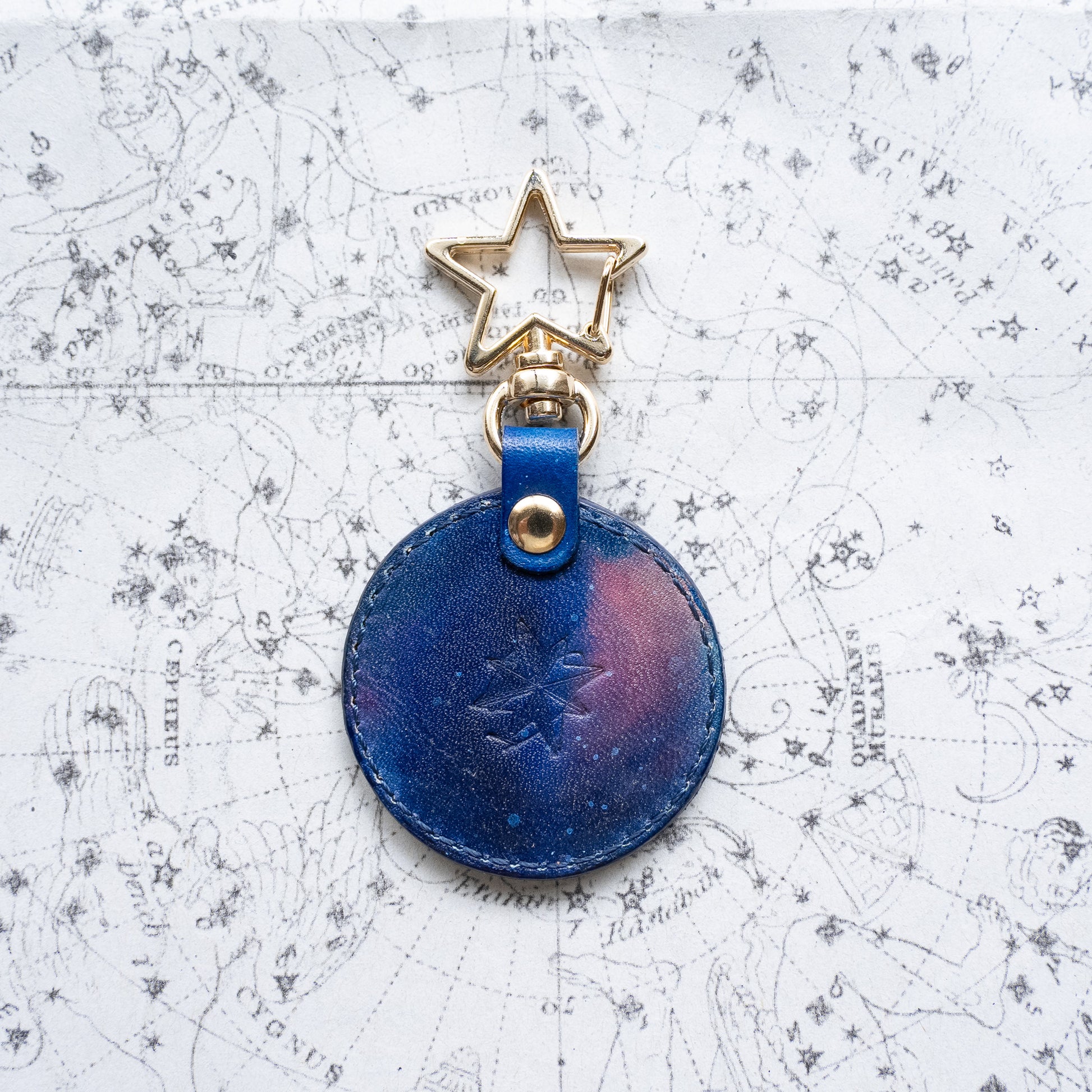 宇宙色に手染めした本革のキーホルダー「宙円(そらまどか)」。