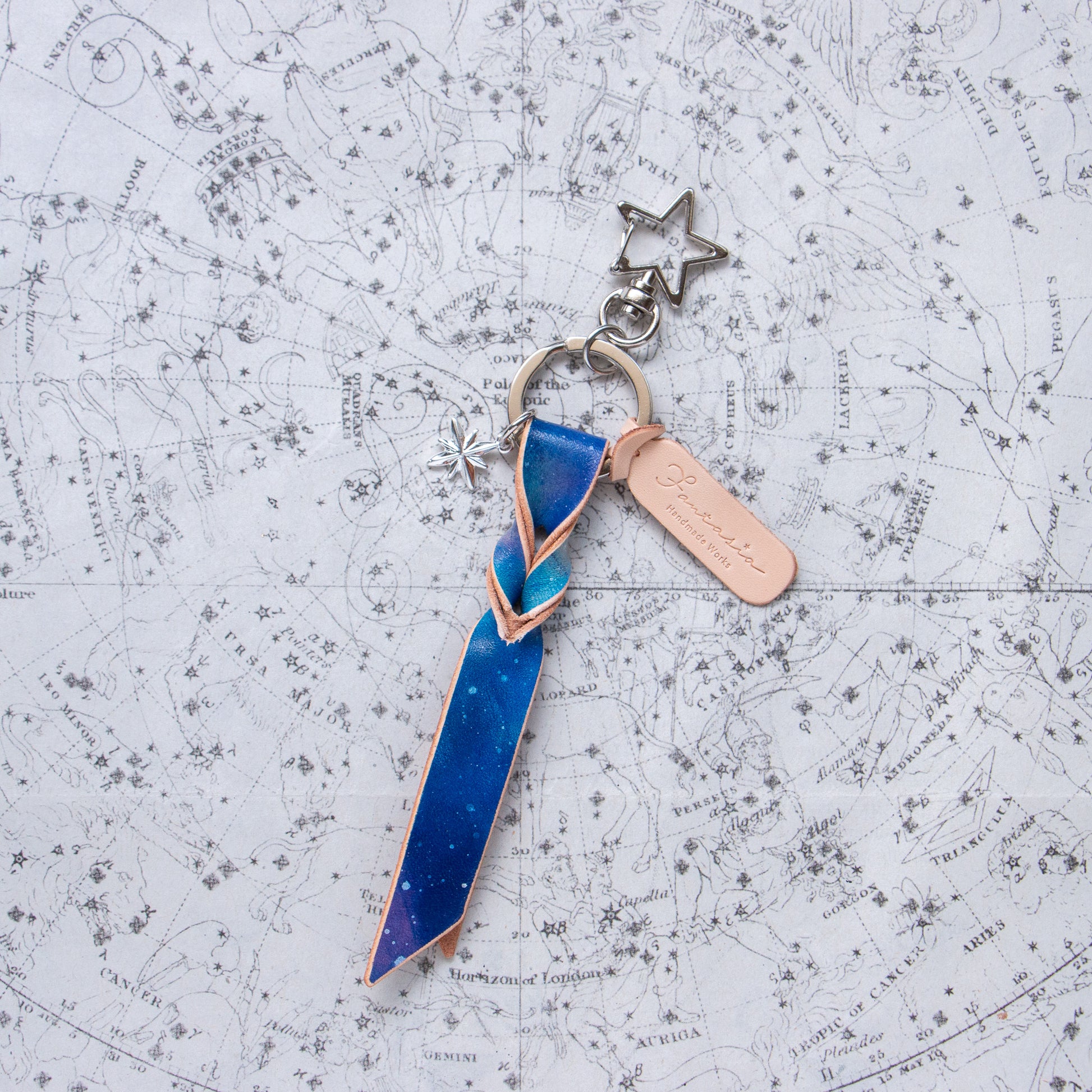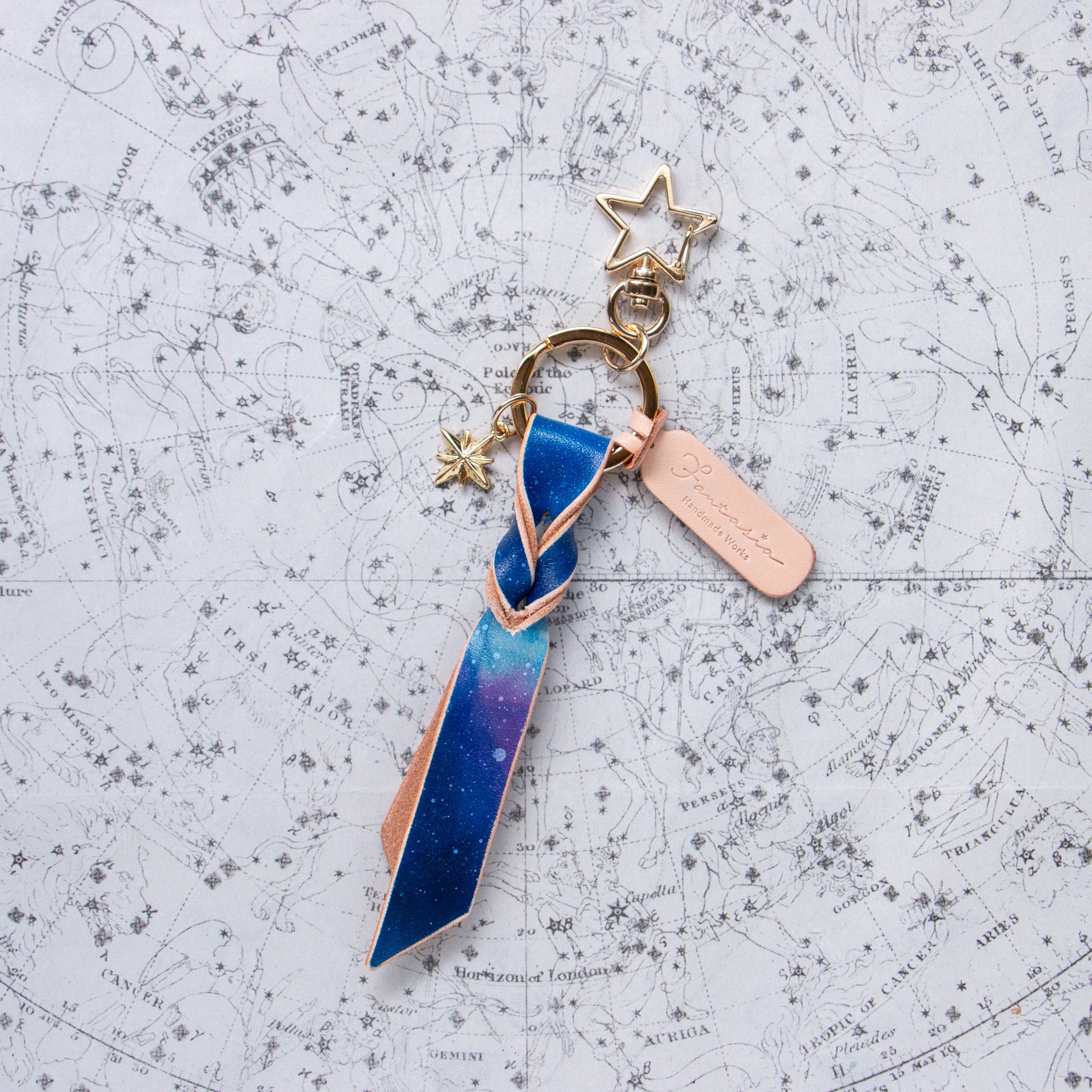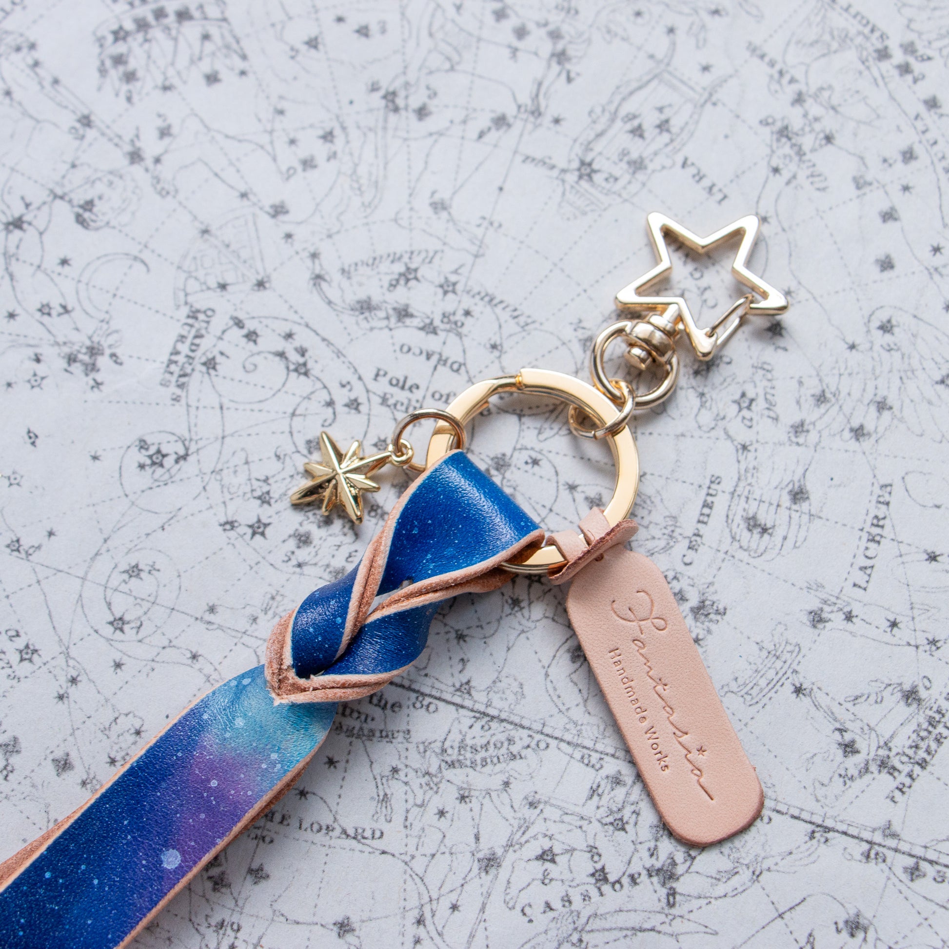 宇宙色に手染めした本革のキーリング「宙結(そらゆい)」。