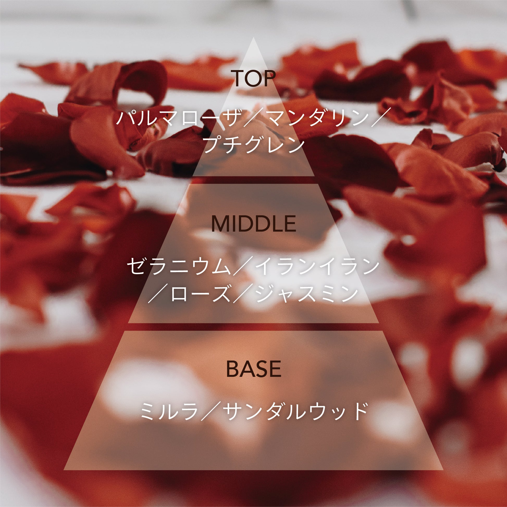 パルマローザ、ゼラニウム、ローズのフローラルな香りを、プチグレンやイランイランでより濃厚でドラマティックに引き立たせました。