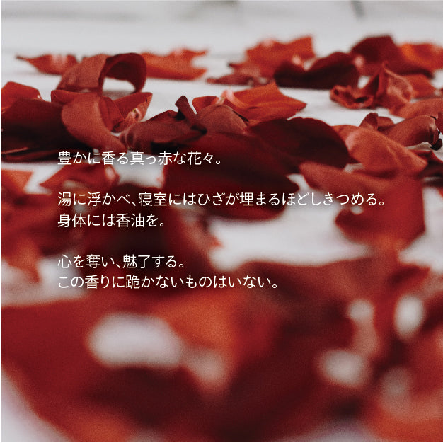 パルマローザ、ゼラニウム、ローズのフローラルな香りを、プチグレンやイランイランでより濃厚でドラマティックに引き立たせました。