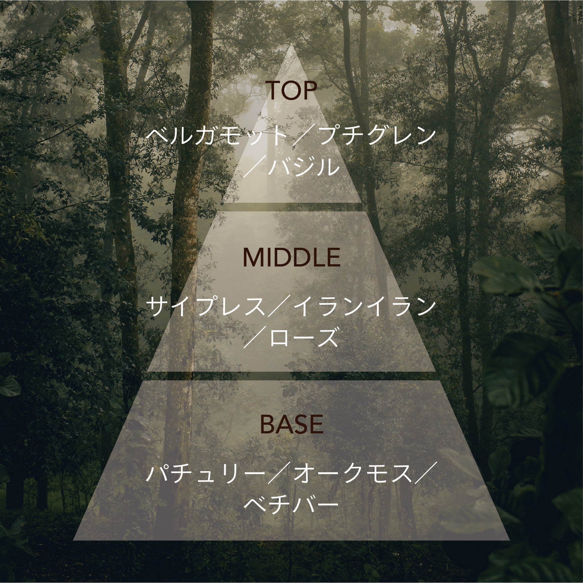 爽やかで静かなサイプレスや、濃い霧のようなベチバー・オークモスが緊張をほどき、身体がベッドへ沈み込むような感覚へ導きます。