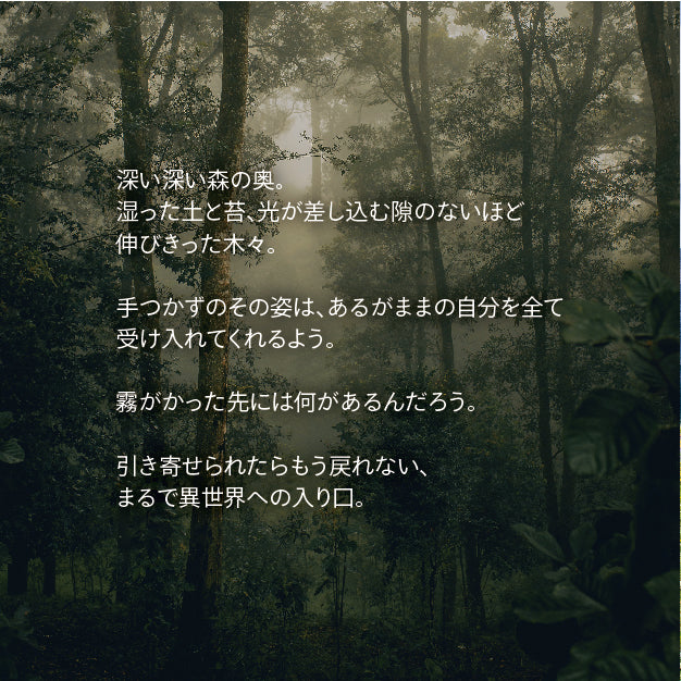 霧がかった手つかずの森の中ようなウッディ&グリーンノート。