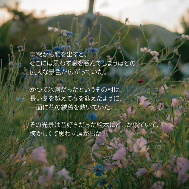 可憐な花でいっぱいの畑に寝ころんで、ざわついた気持ちをそよ風とともに包み込んでくれる夜用アロマオイルです。