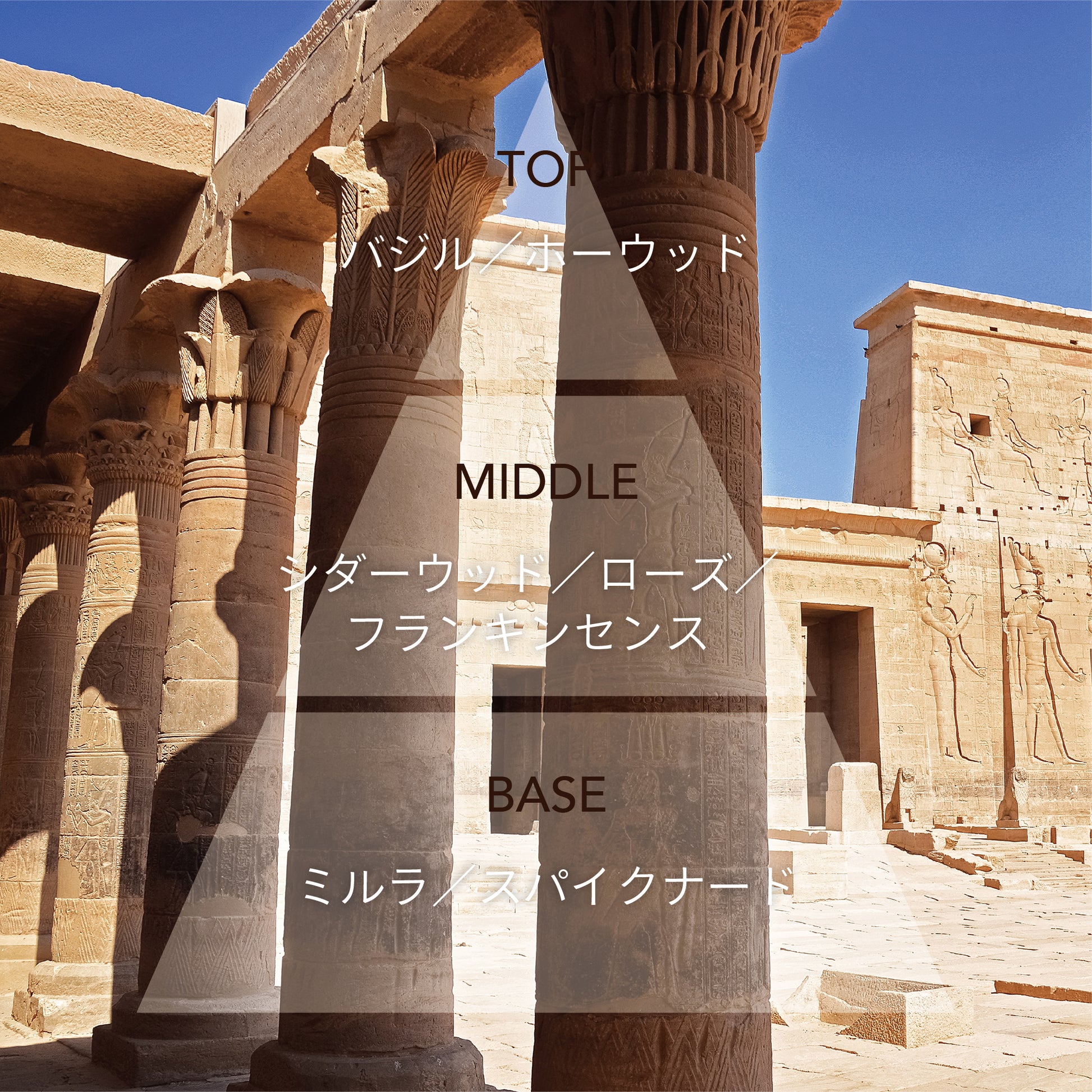 紀元前から愛されてきた香料『フランキンセンス(乳香・オリバナム)』をメインに、ミルラやスパイクナードといった神聖な香りも組み合わせました。