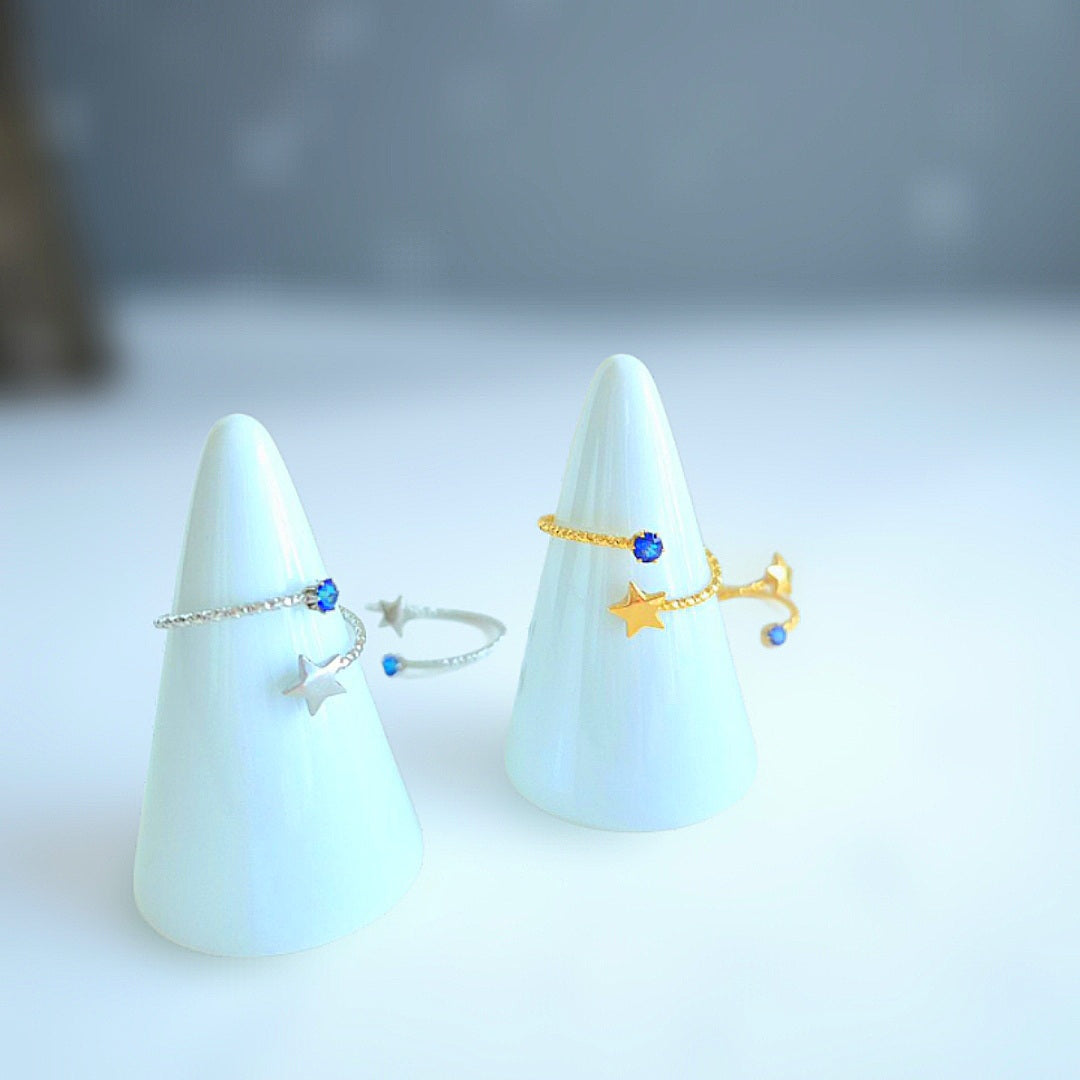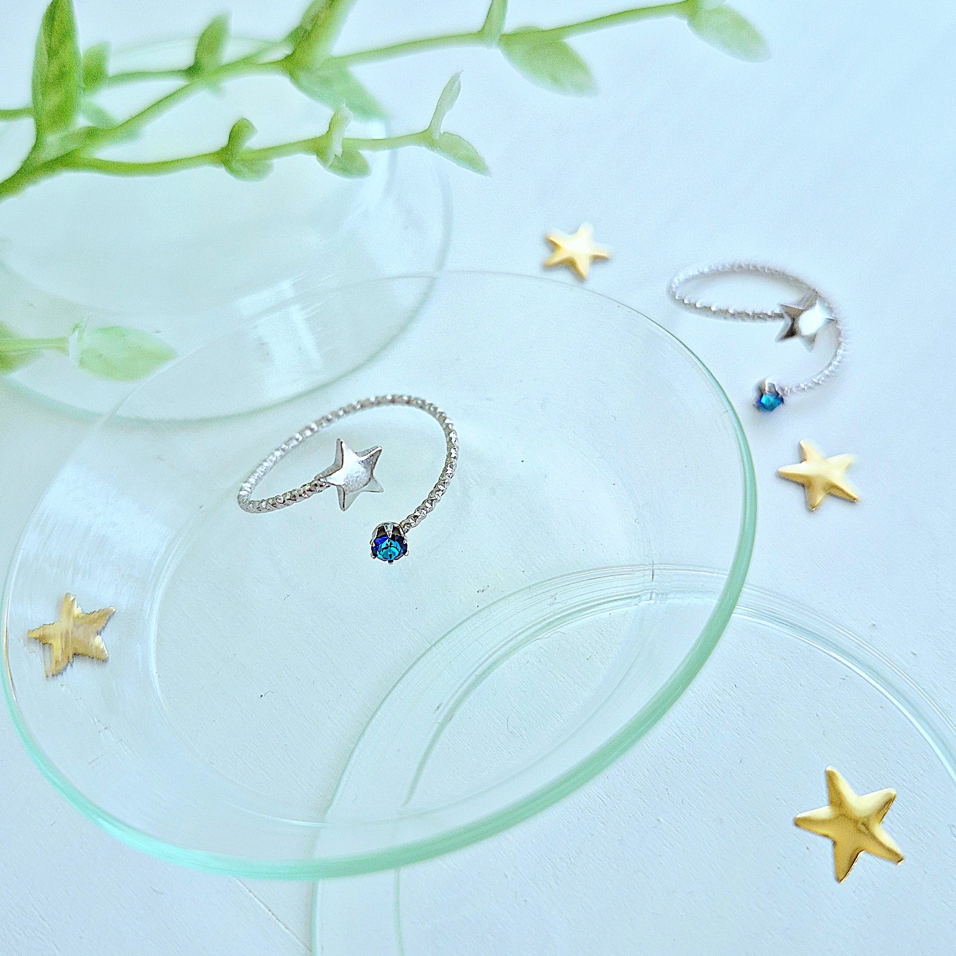 小さな星と深い青バリュミューダブルーのクリスタルガラスをひと粒添えた控えめなリングです。