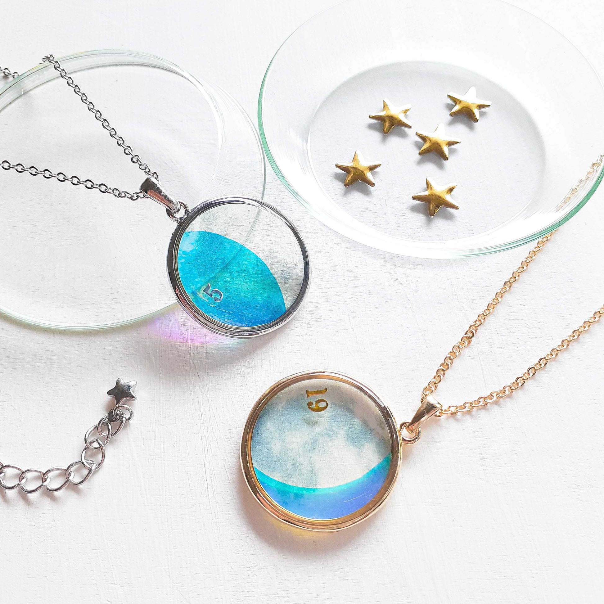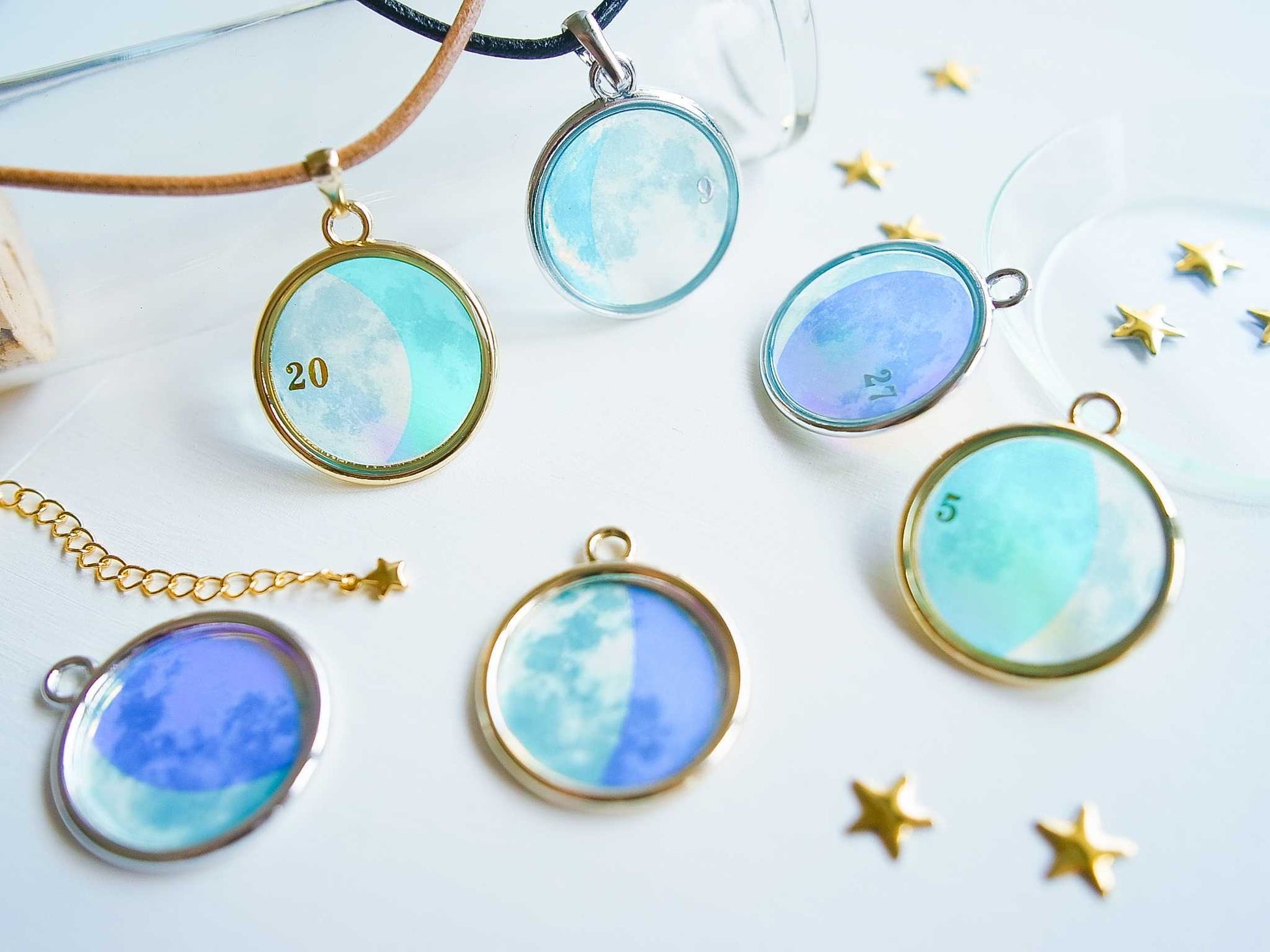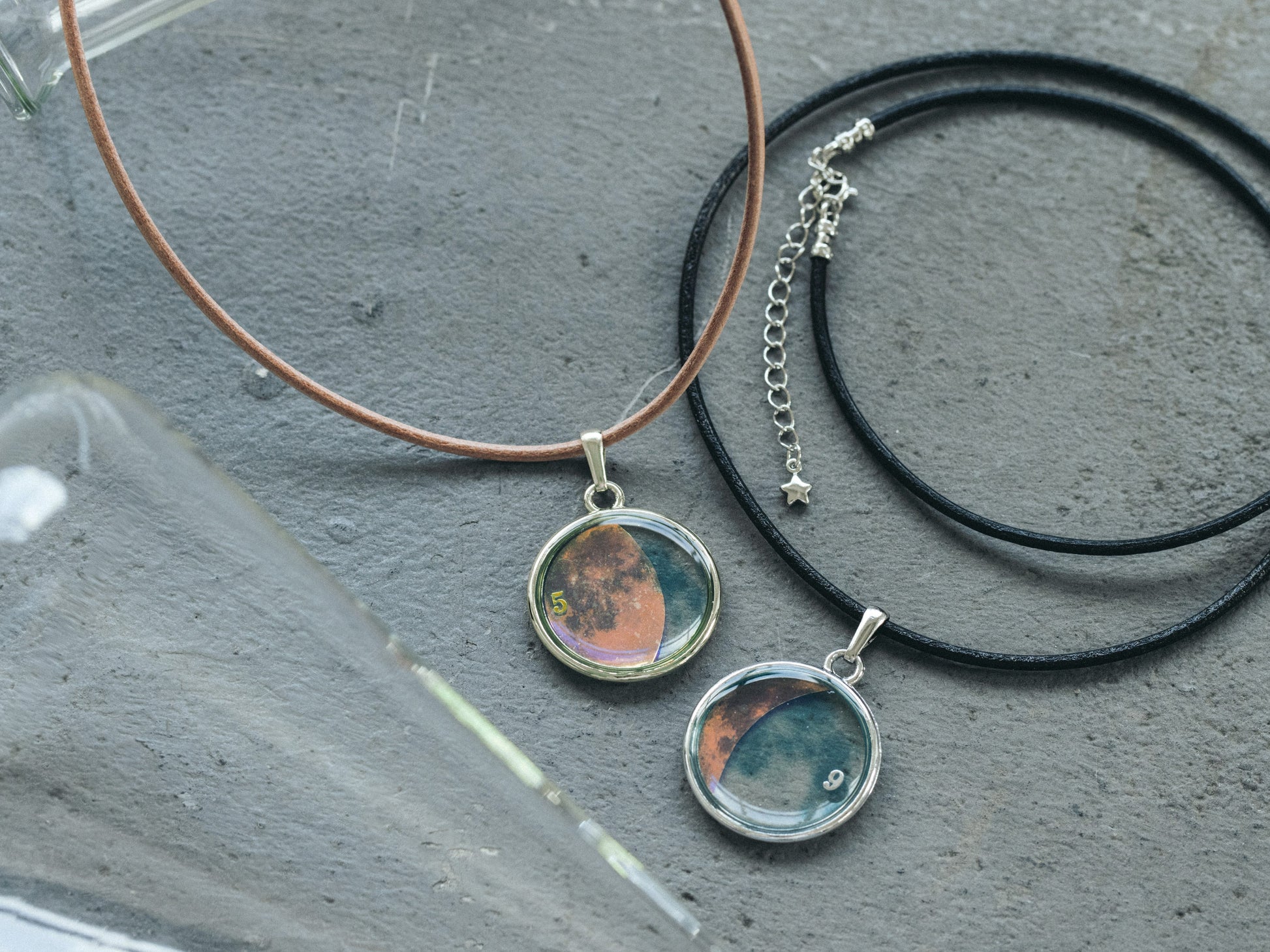 透明な月に偏光カラーフィルムで月影を表現したペンダント。
