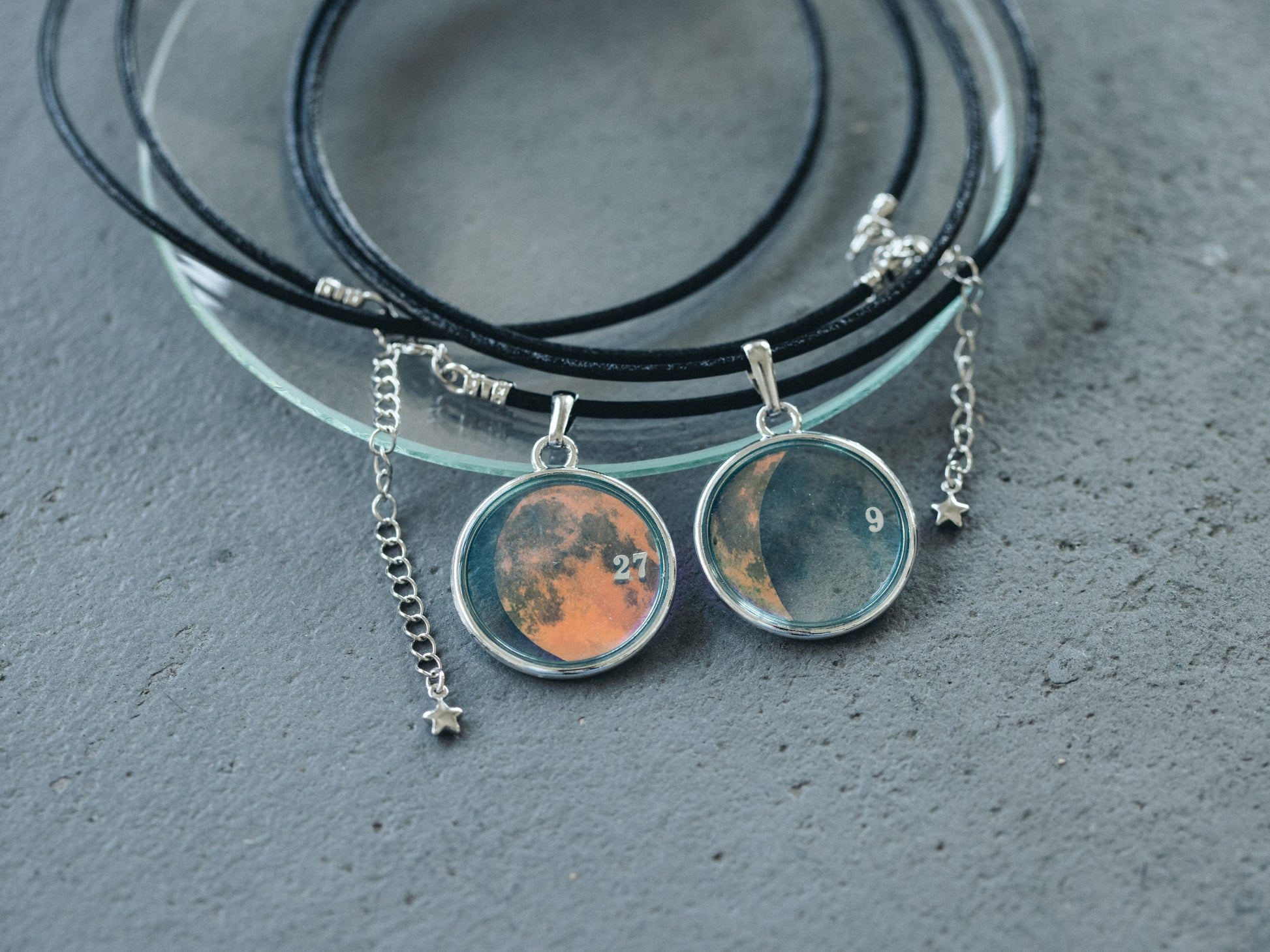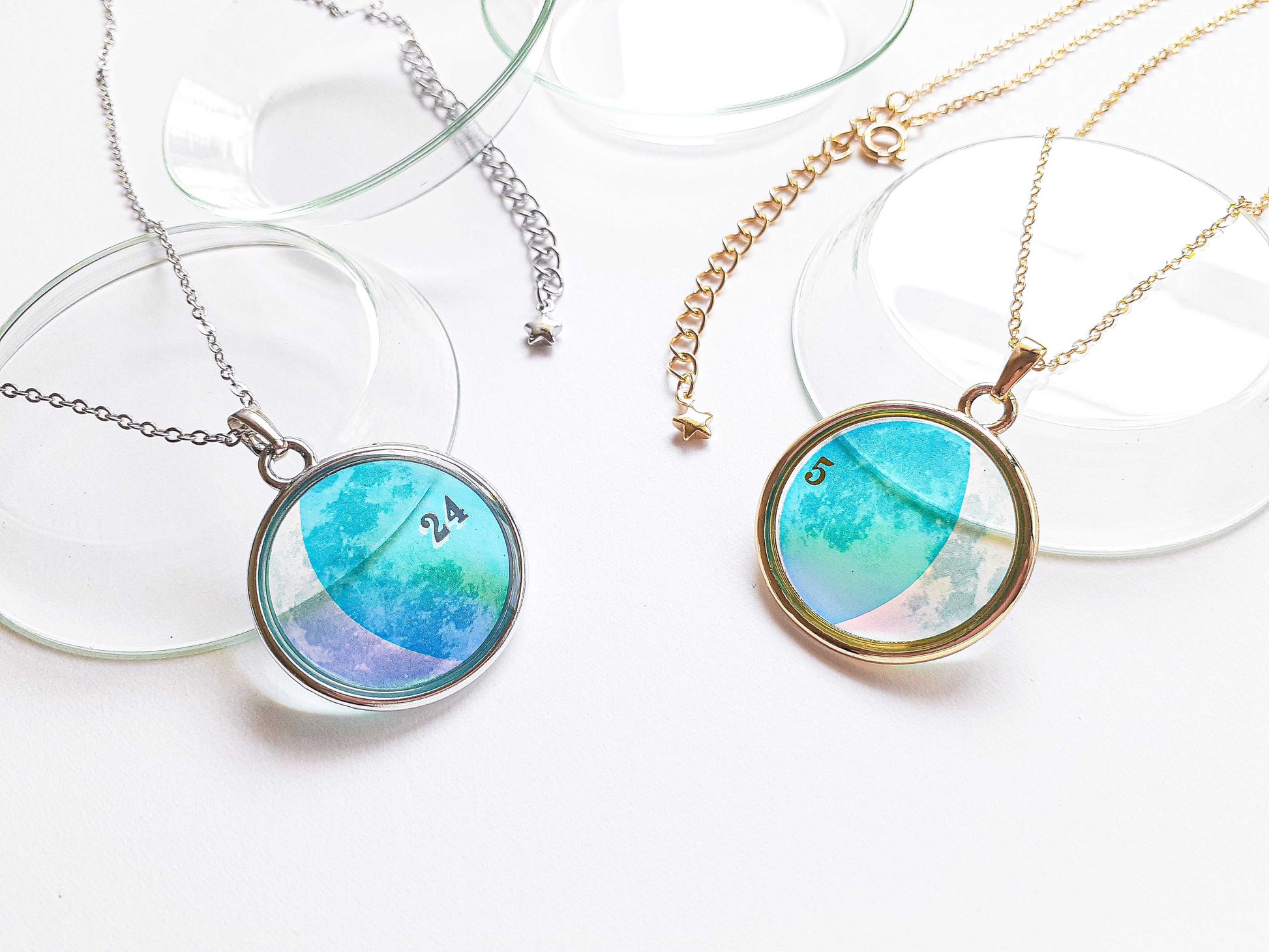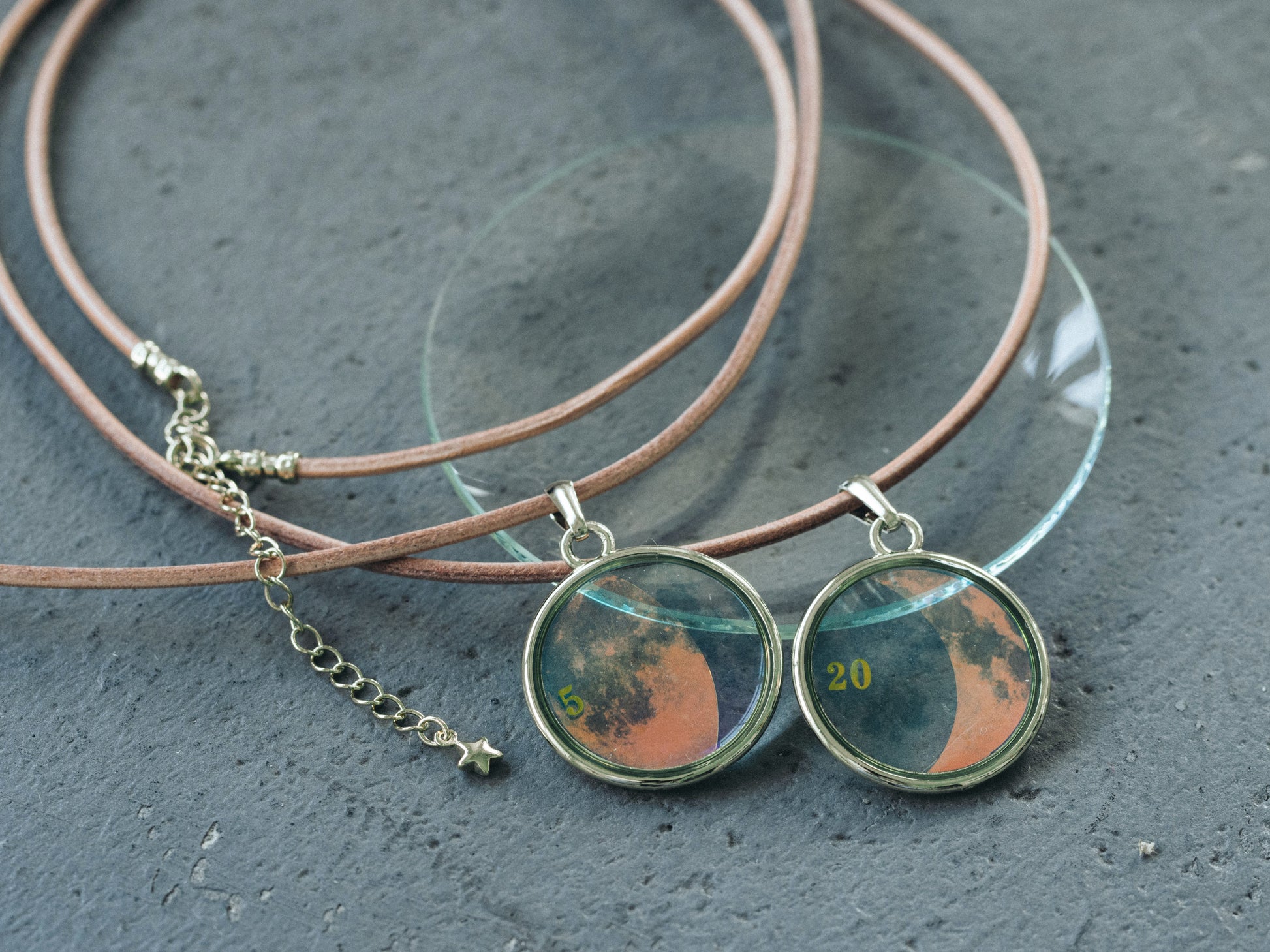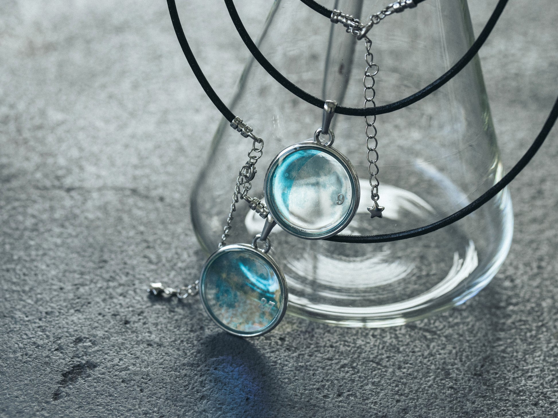 透明な月に偏光カラーフィルムで月影を表現したペンダント。