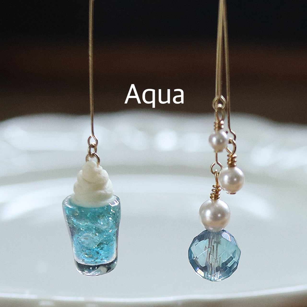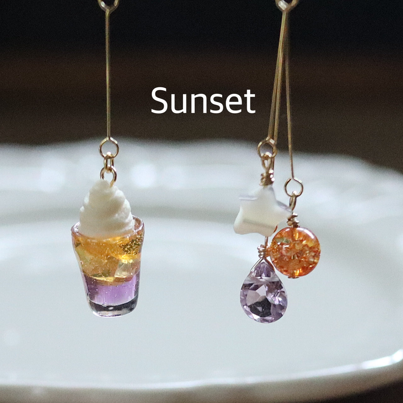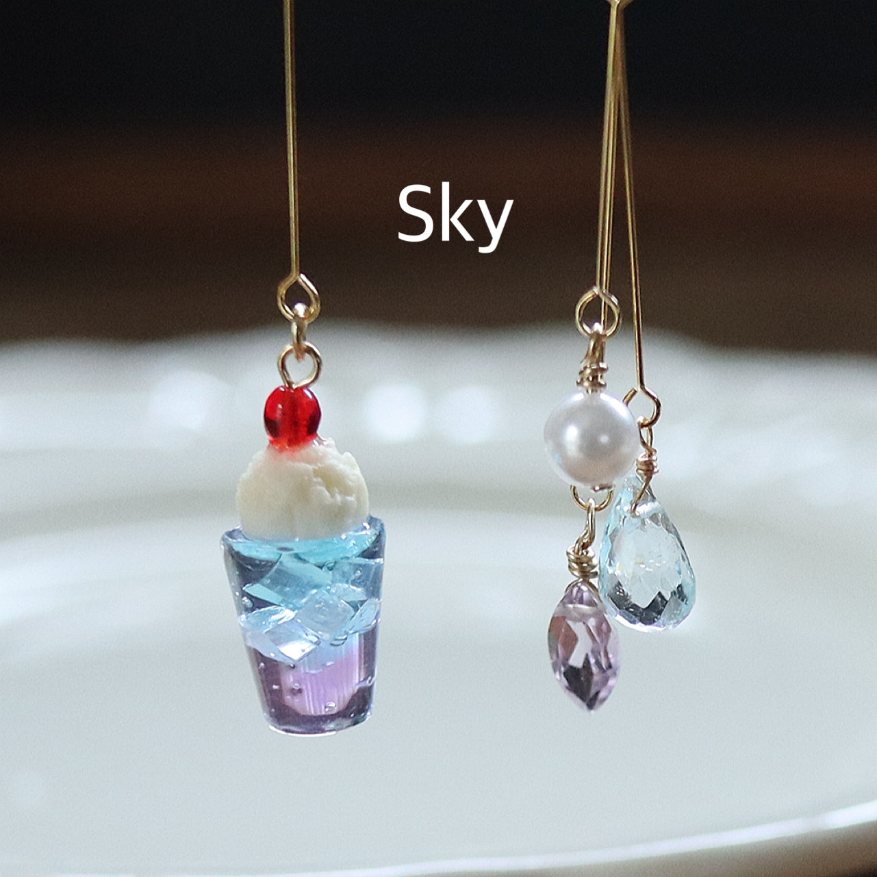 「Sky」の片側には、天然石のアメジスト・スカイブルートパーズ、「Aqua」の片側には天然石オーラフラッシュのアクアオーラ(天然水晶に金が加工されたもの)、「Sunset」の片側にはオレンジクラッククォーツ・アメジスト・星型マザーオブパールを合わせ、大人のクリームソーダに仕立てました。