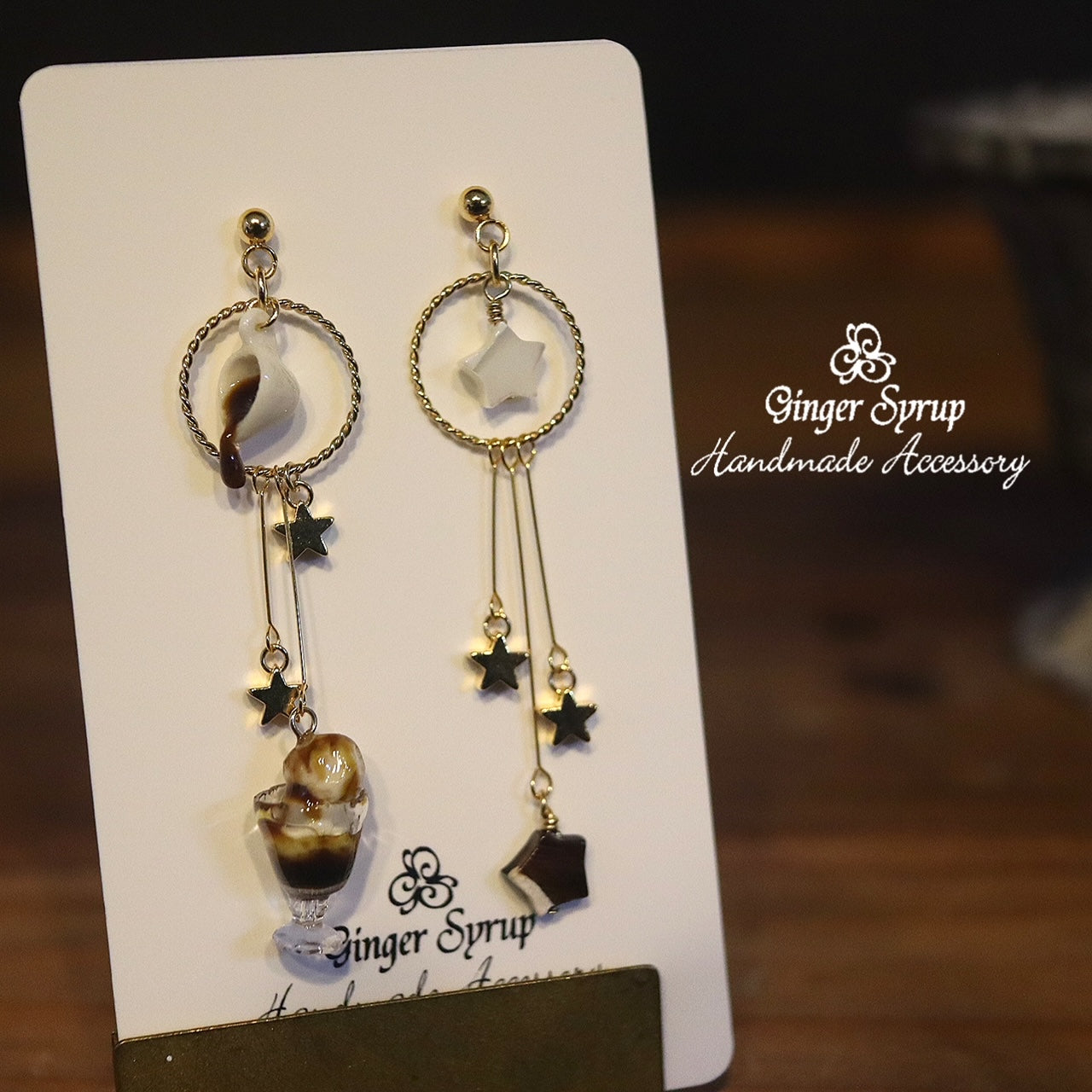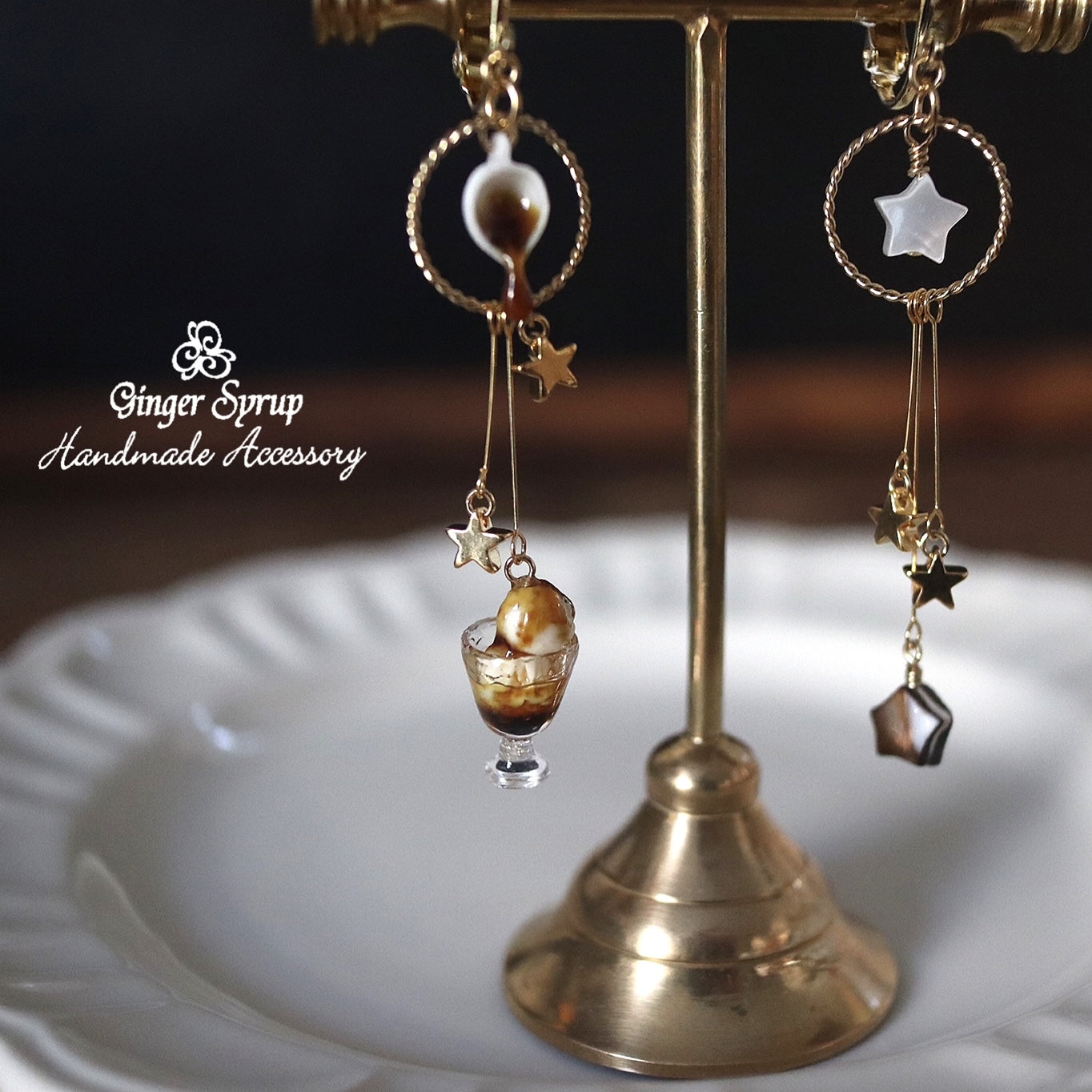 ピッチャーからアイスにたらりと注がれたエスプレッソ、ホワイトとブラウンのマザーオブパール、ゴールドの星メタルと合わせたエレガントな大人の耳飾り