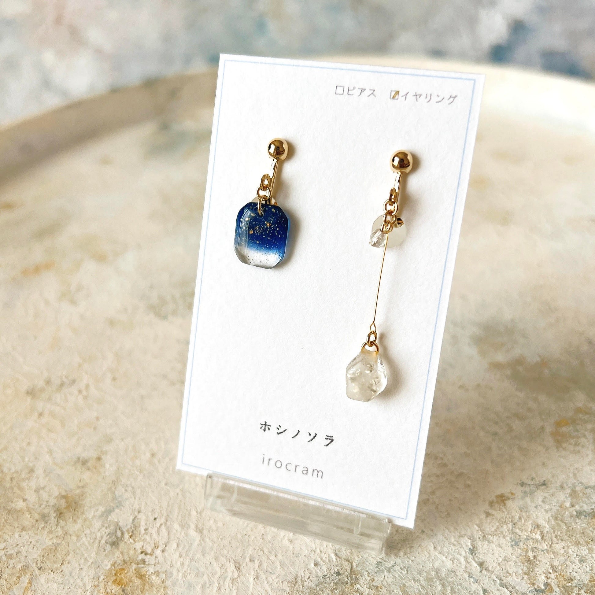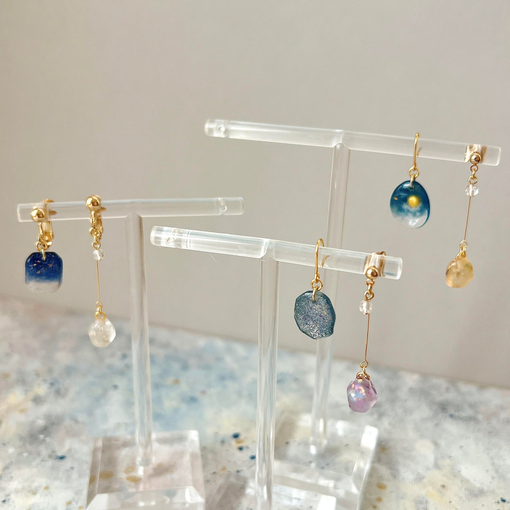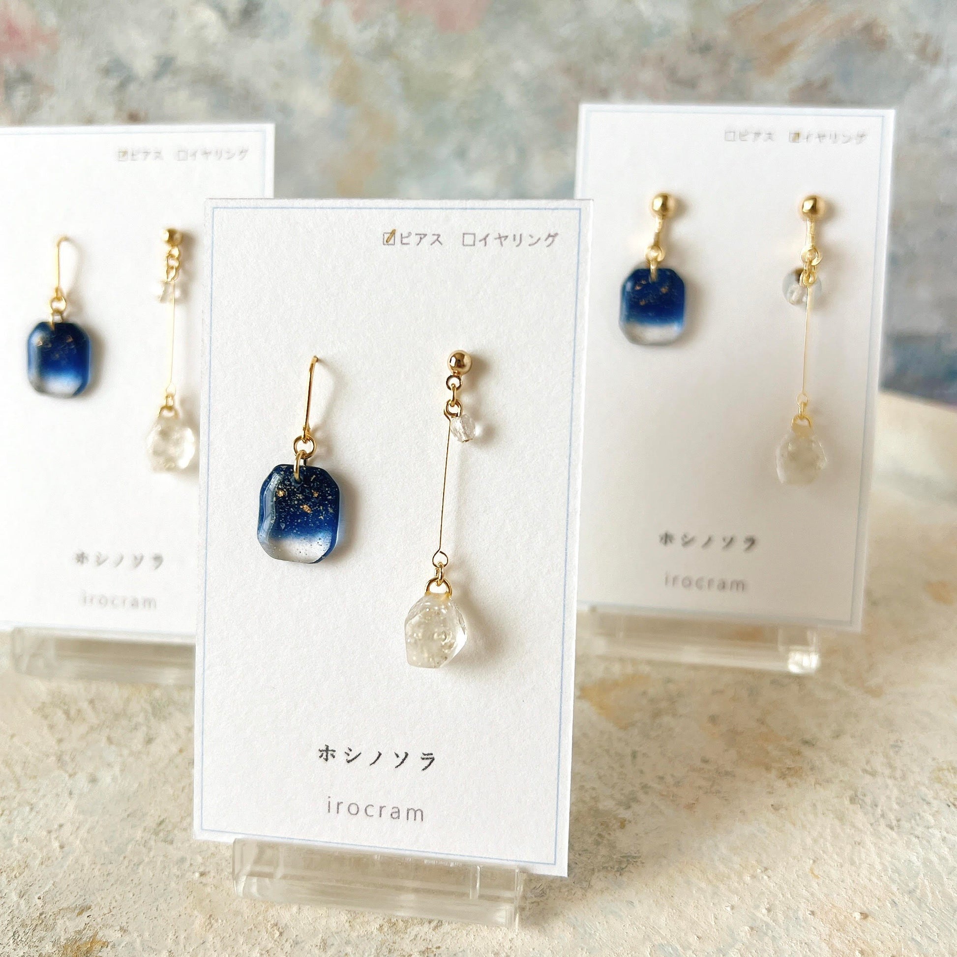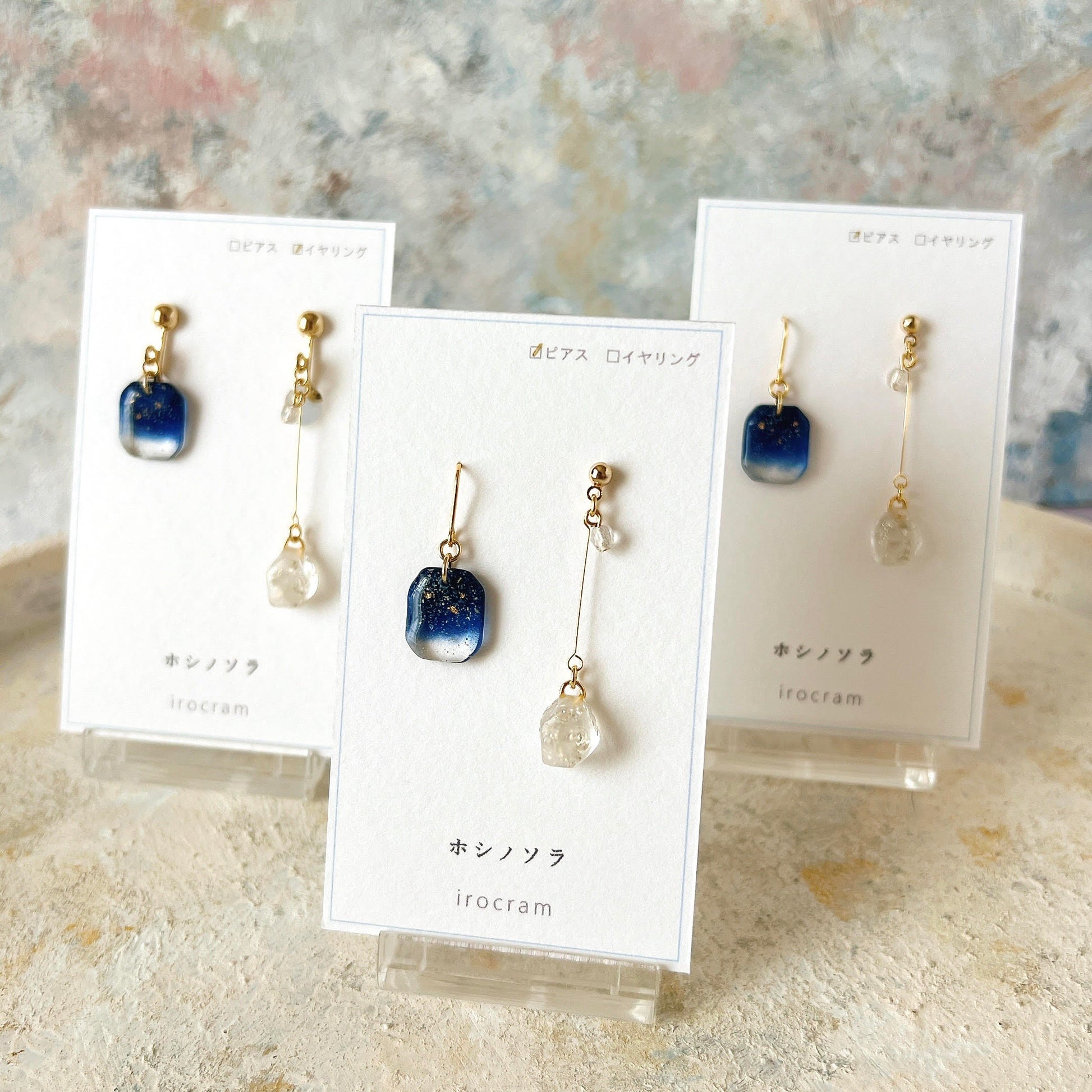 星が輝く夜空をイメージして製作したソラノシリーズの耳飾りです。