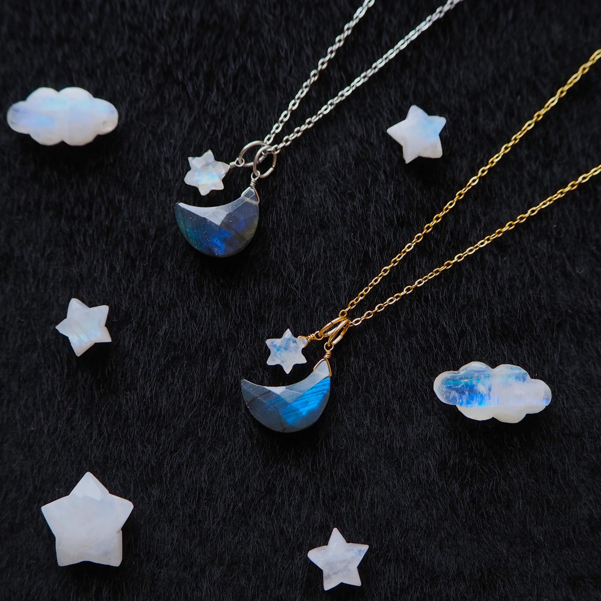 ラブラドレッセンスの美しさを引き立てるカットが入り、どの角度から見ても美しいラブラドライトの三日月と、ミニサイズだけどシラーが美しいムーンストーンの六芒星のペンダントです。