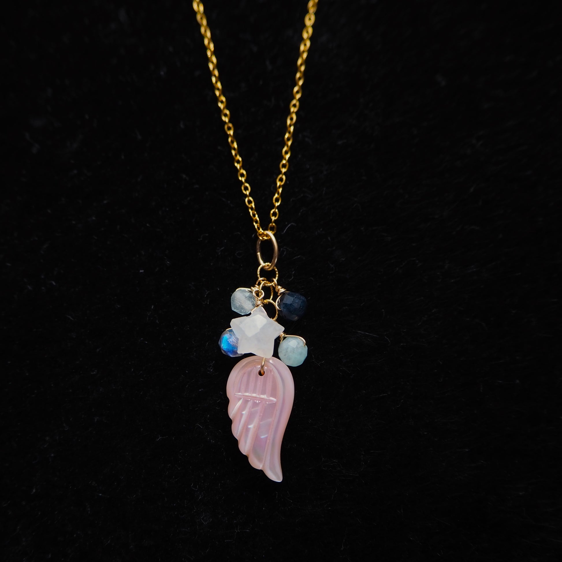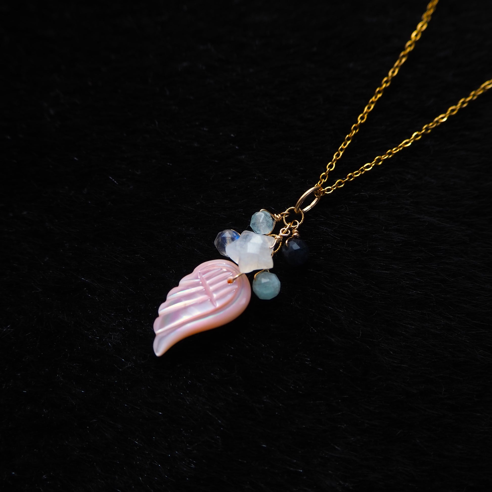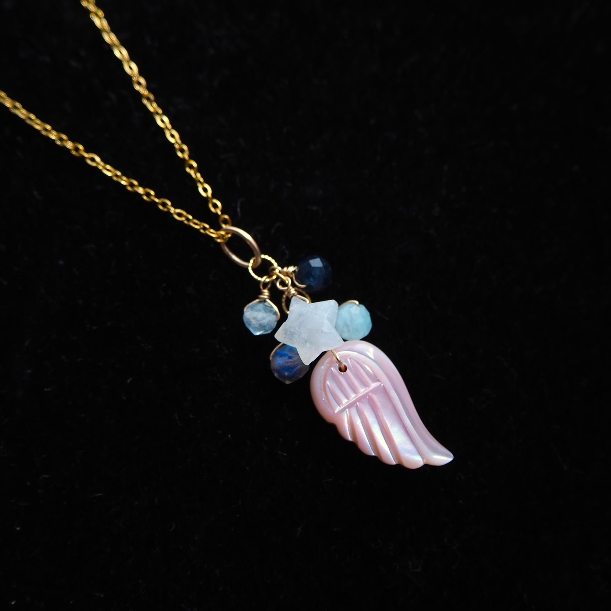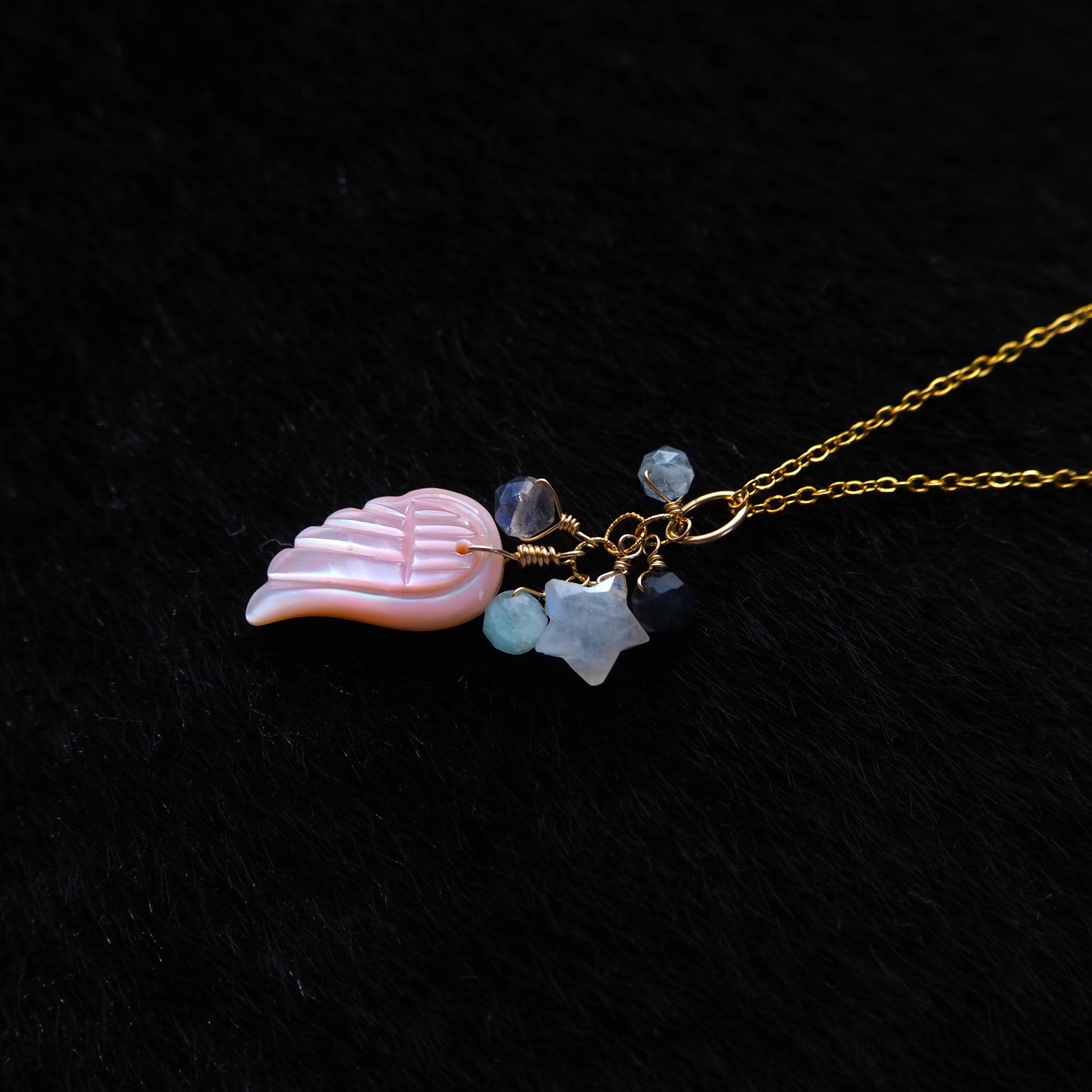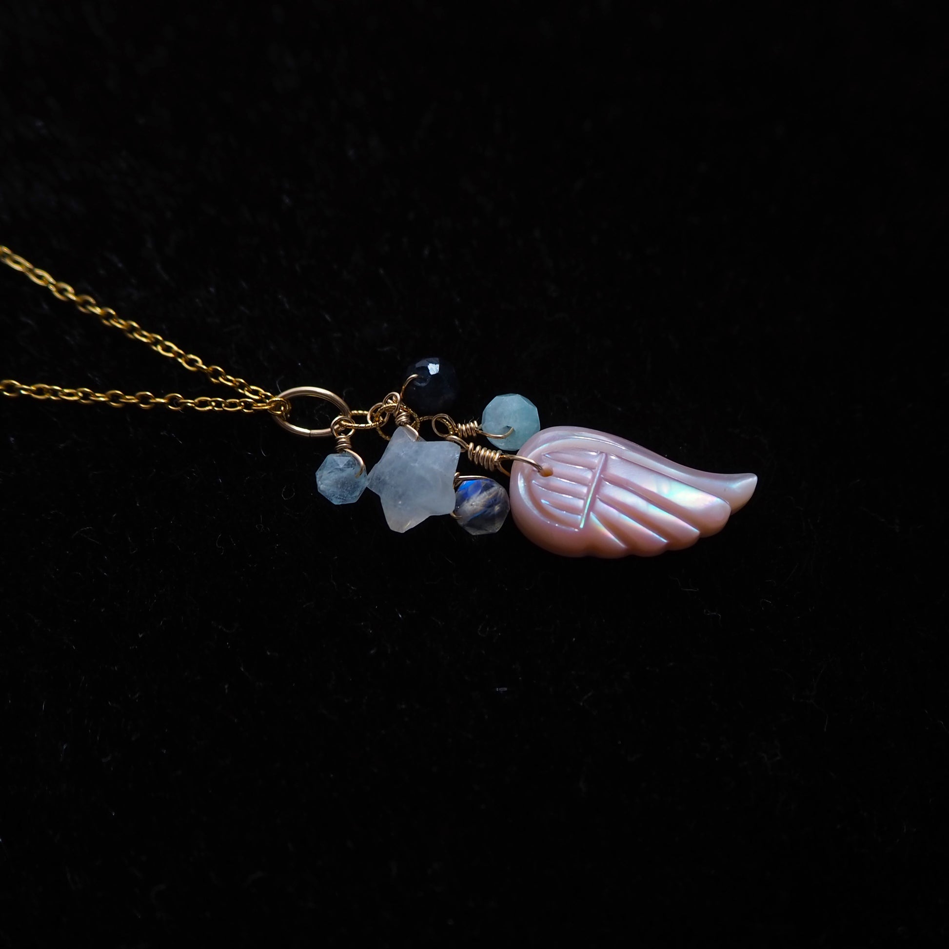 夜空から落ちて来た羽根をイメージして小粒のムーンストーンの星や、小さなブルーサファイア、ラブラドライト、アクアマリンなどの石と組み合わせました。