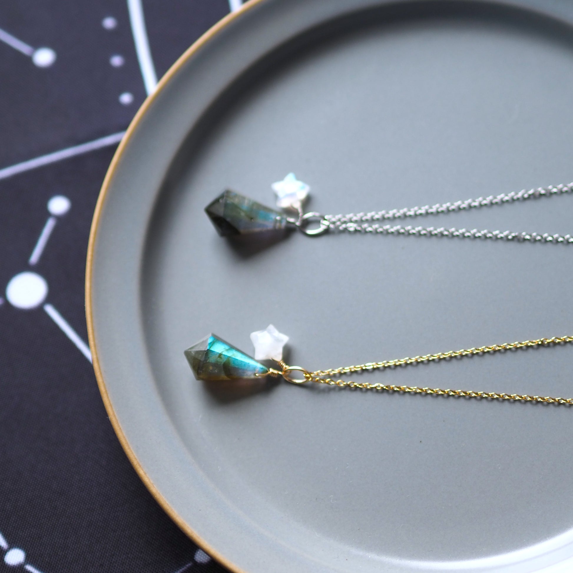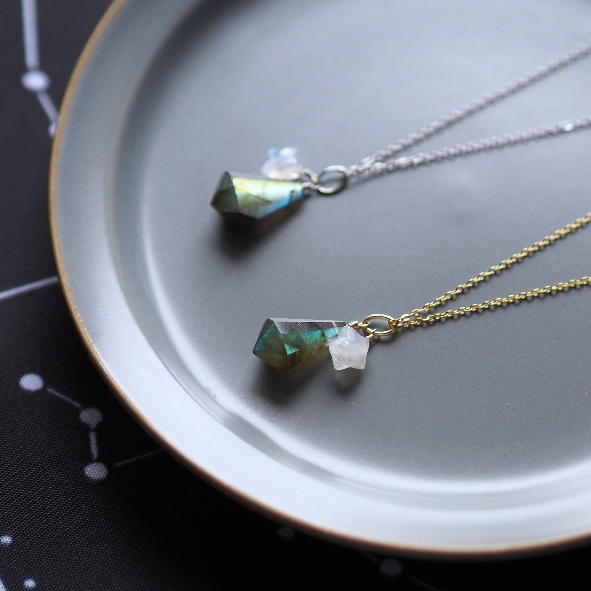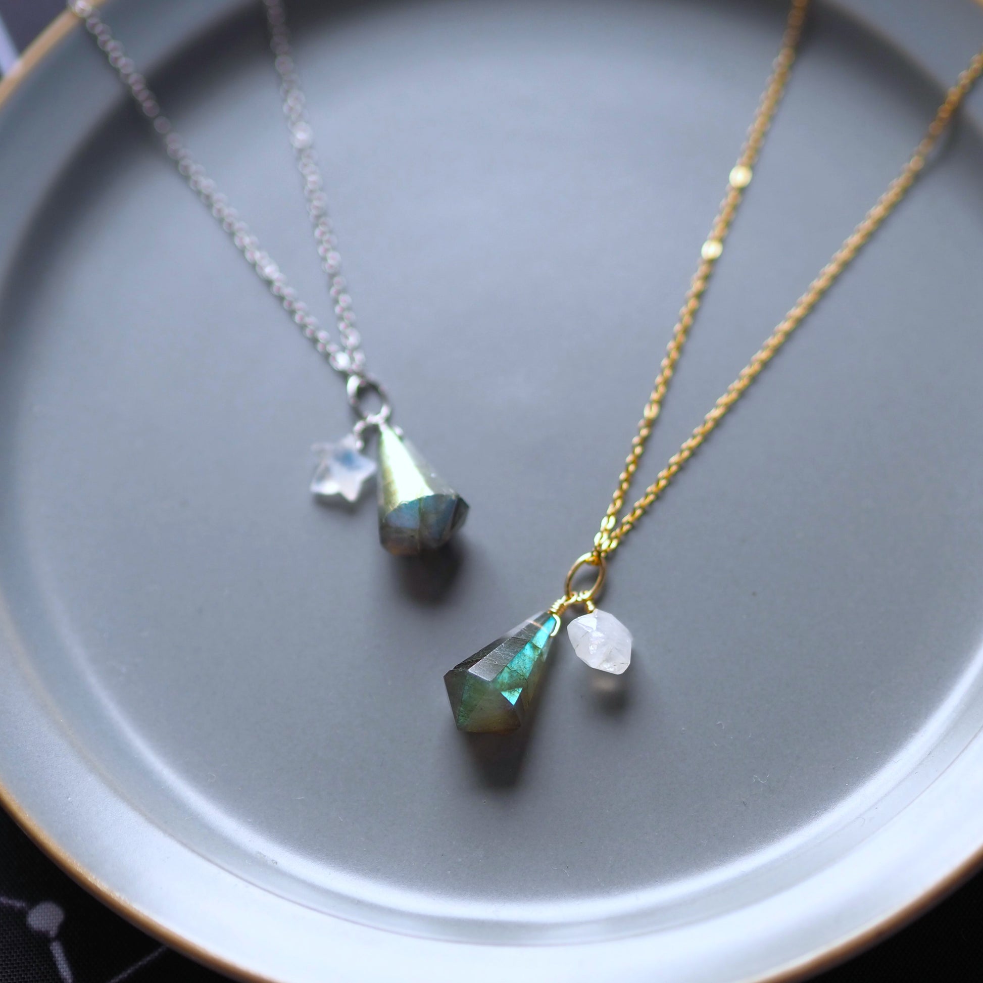 光源によって表情を変える天然石ラブラドライトとムーンストーン。