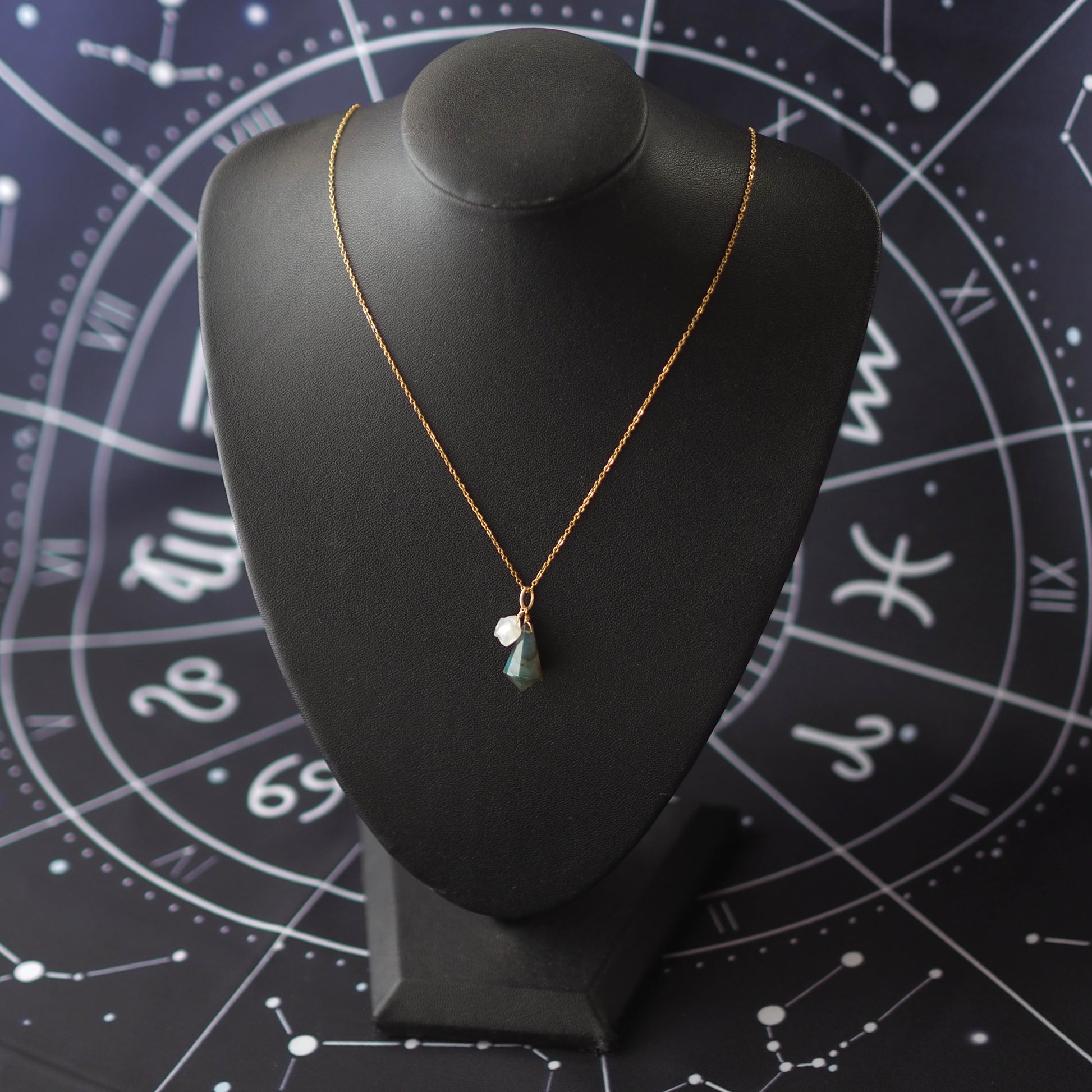 ペンデュラムをイメージしたペンダントは、ミニサイズなので違和感もなく身に着けられます。