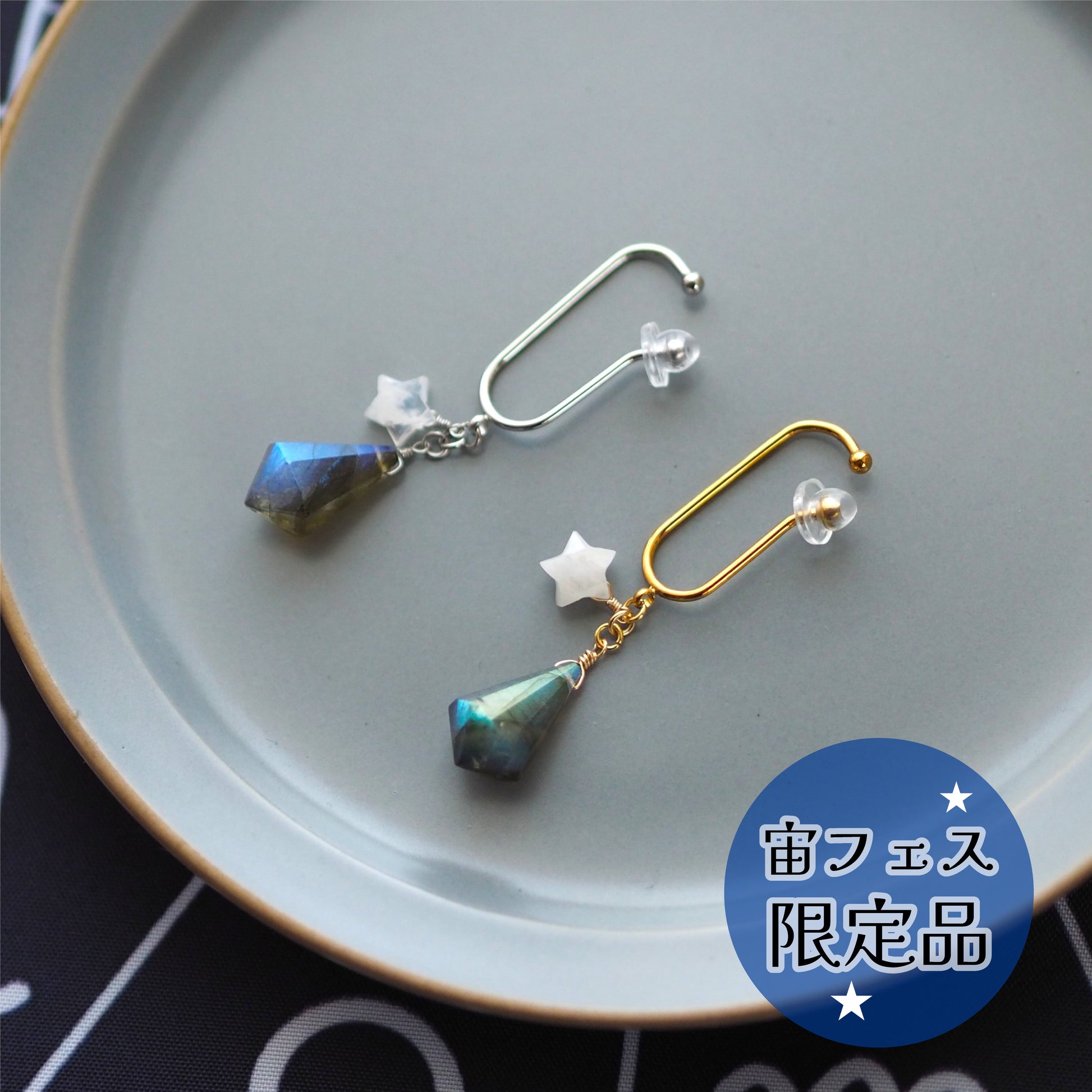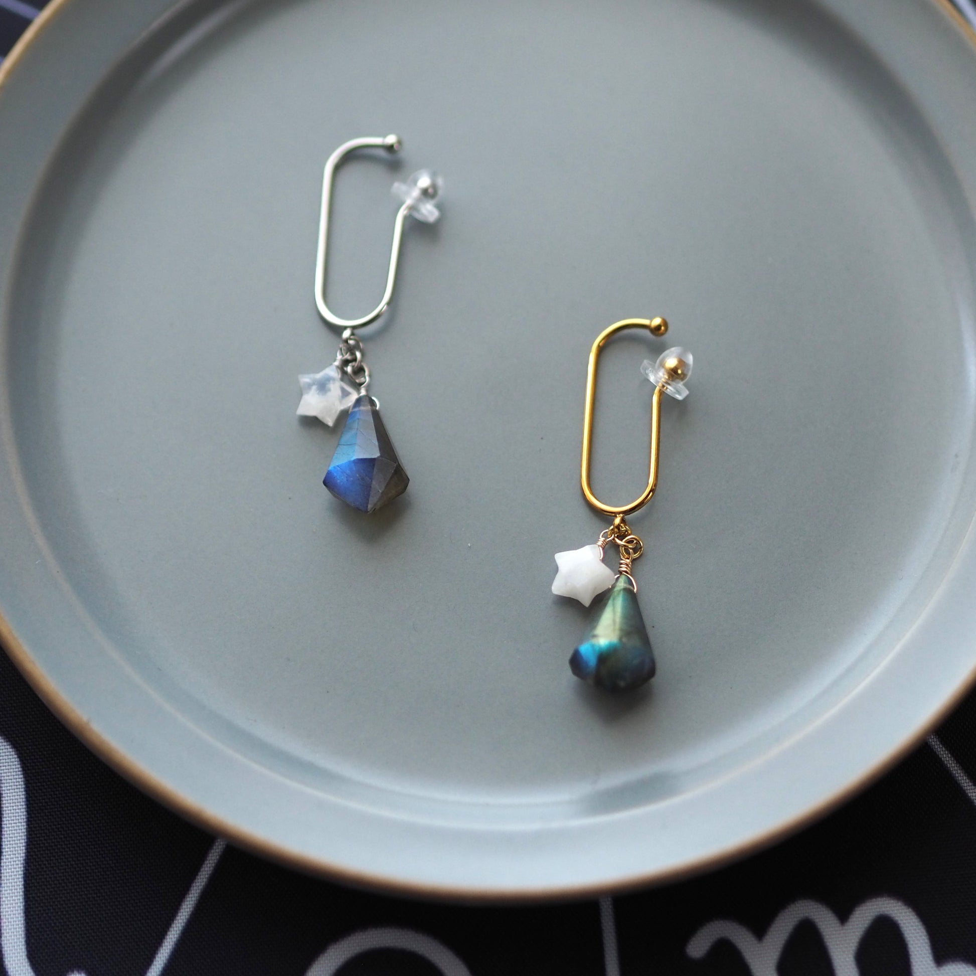小さなシラーが美しいムーンストーンの星と組み合わたイヤーフックです。