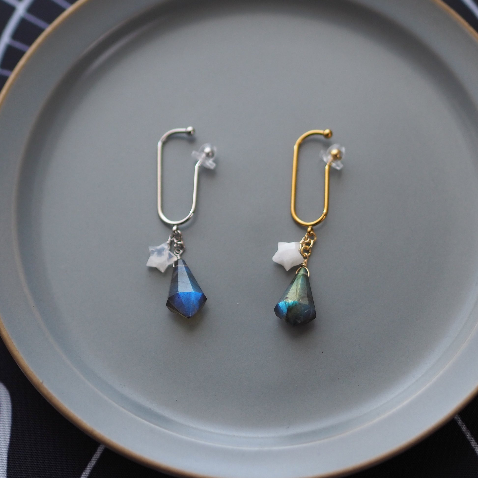 光源によって表情を変える天然石ラブラドライトとムーンストーン。