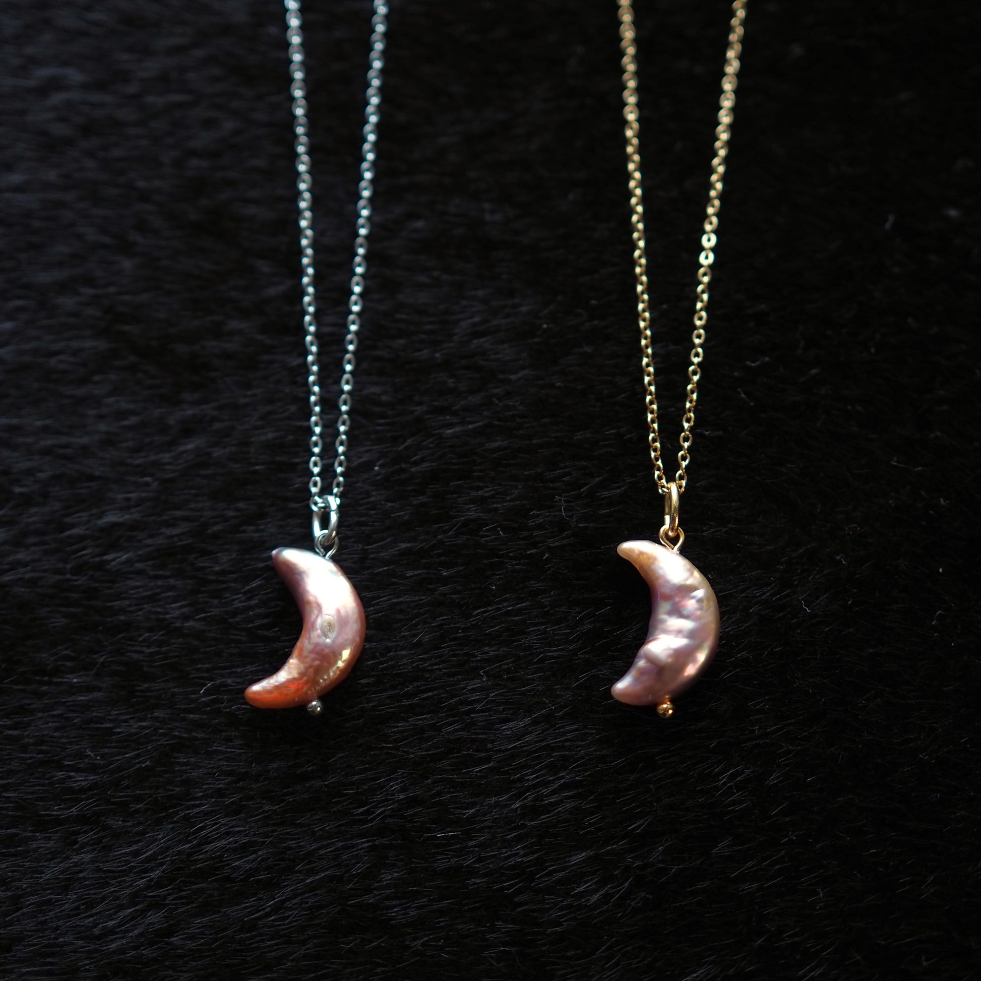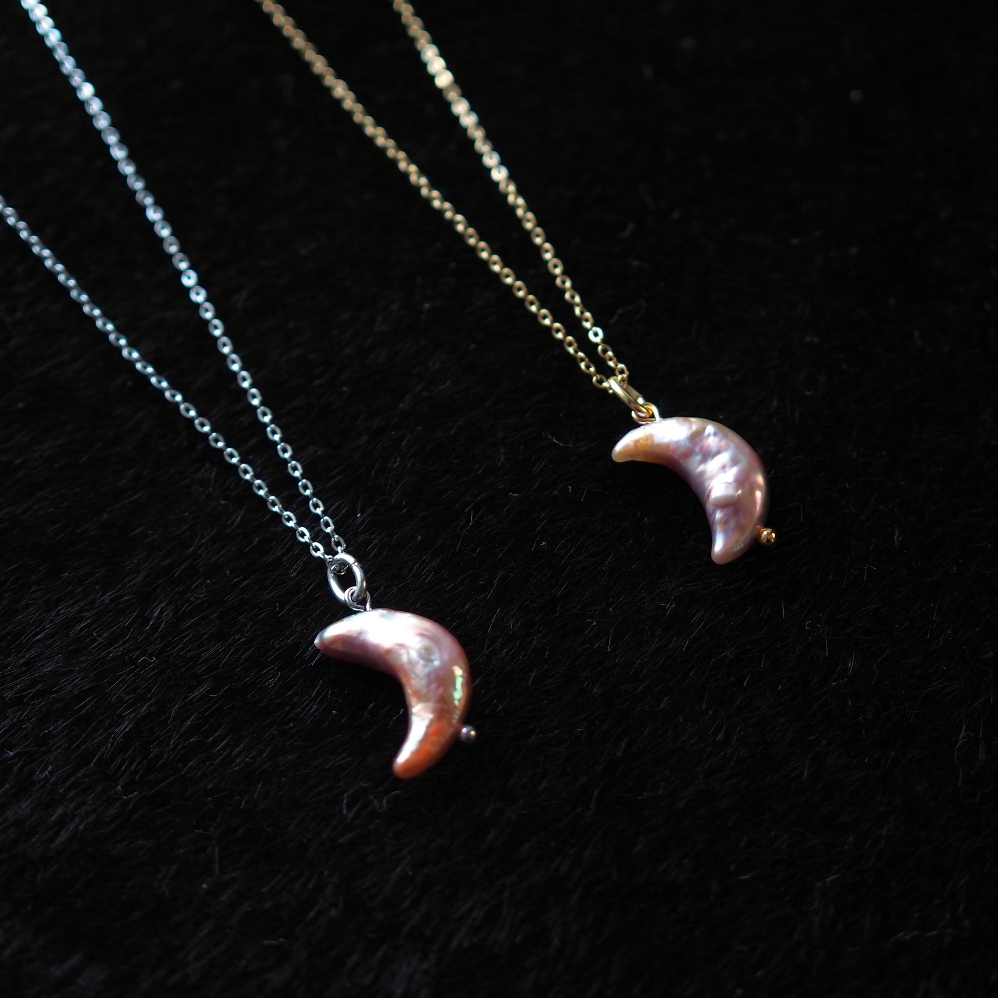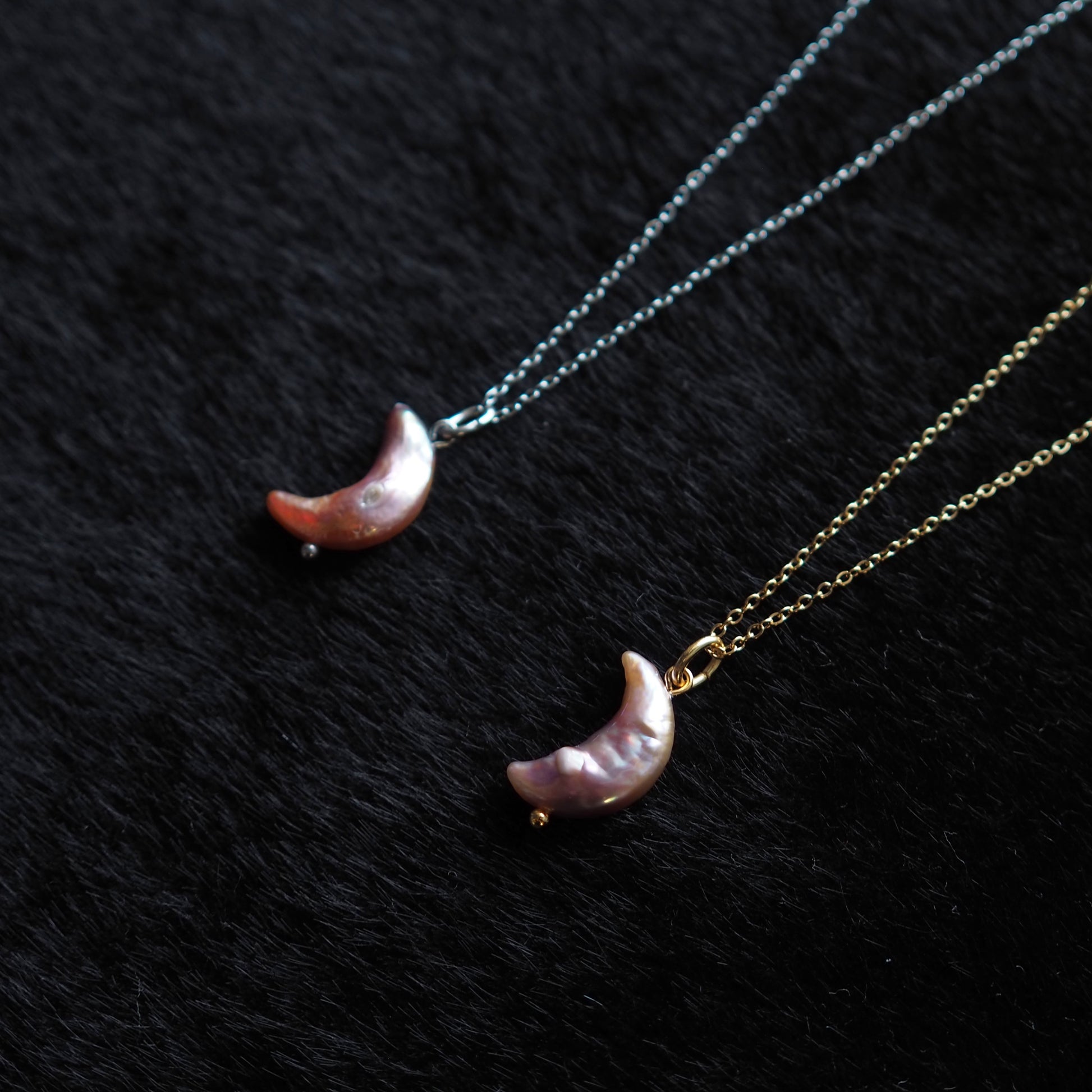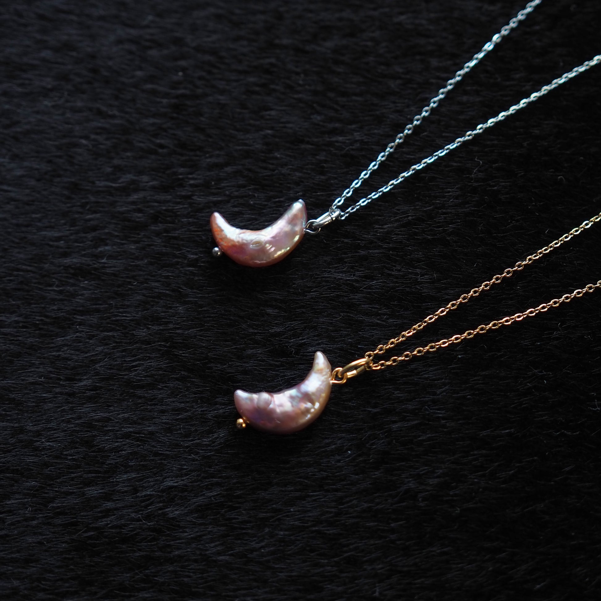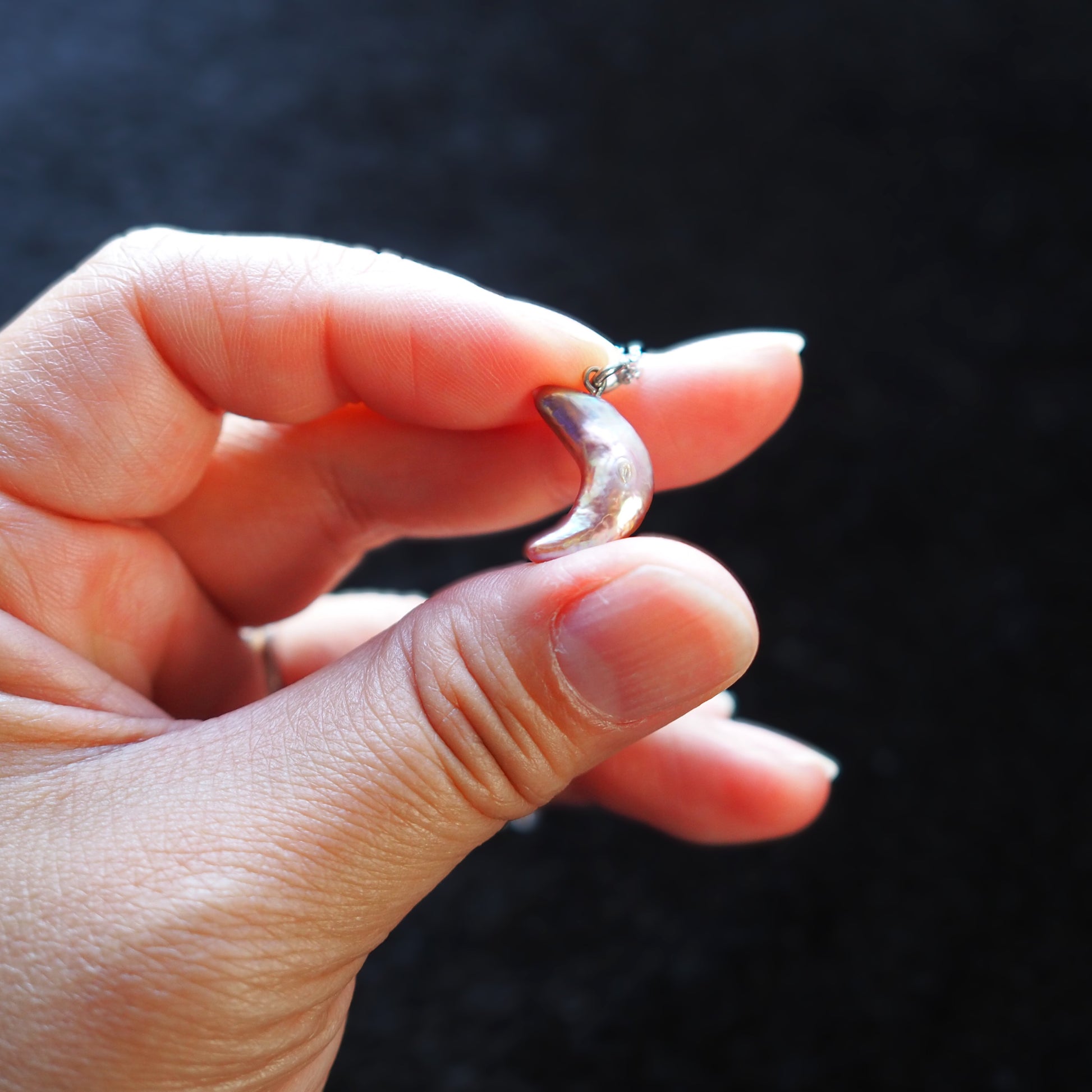 パープルとピンクが混じったような、妖艶なカラーの淡水パールの三日月のペンダント。