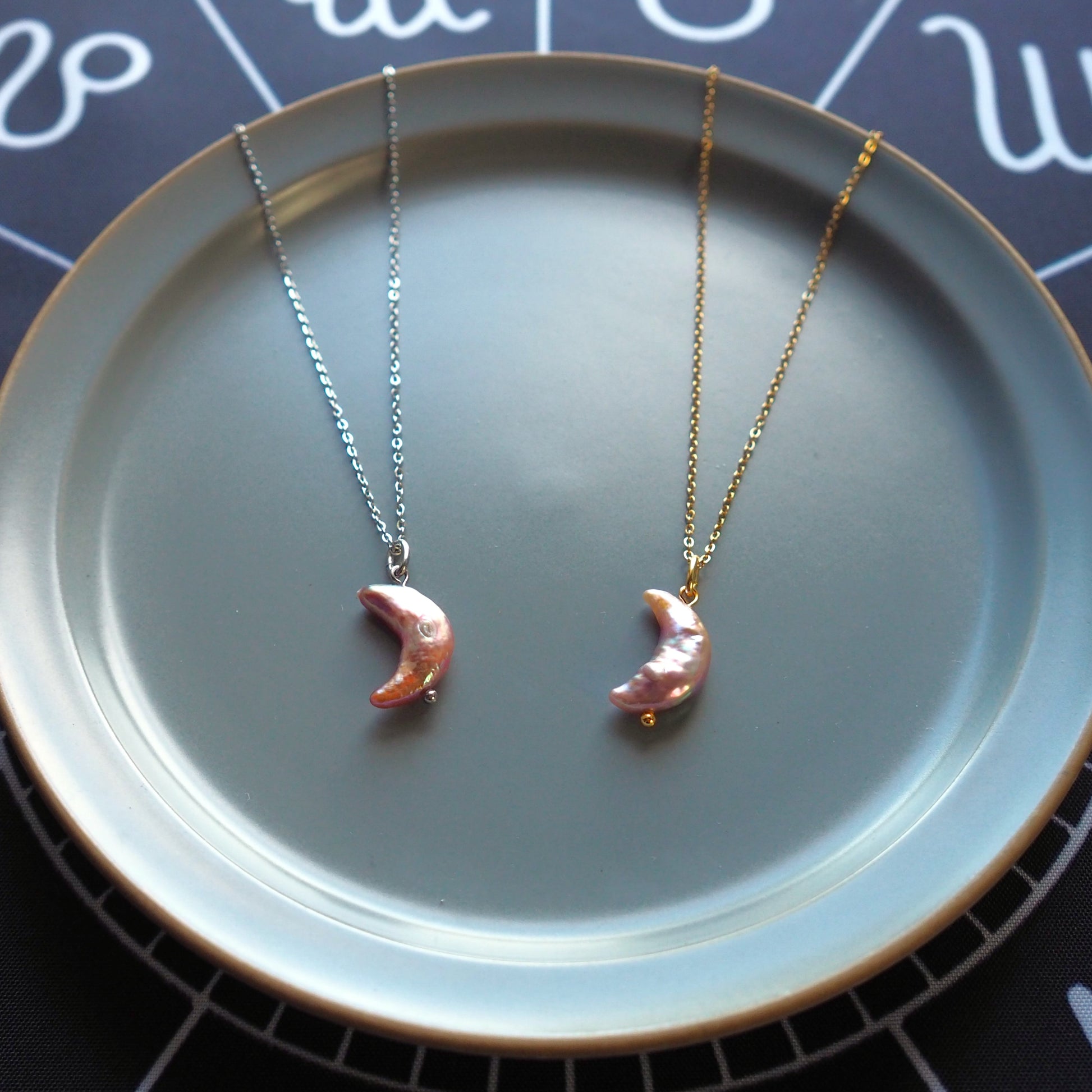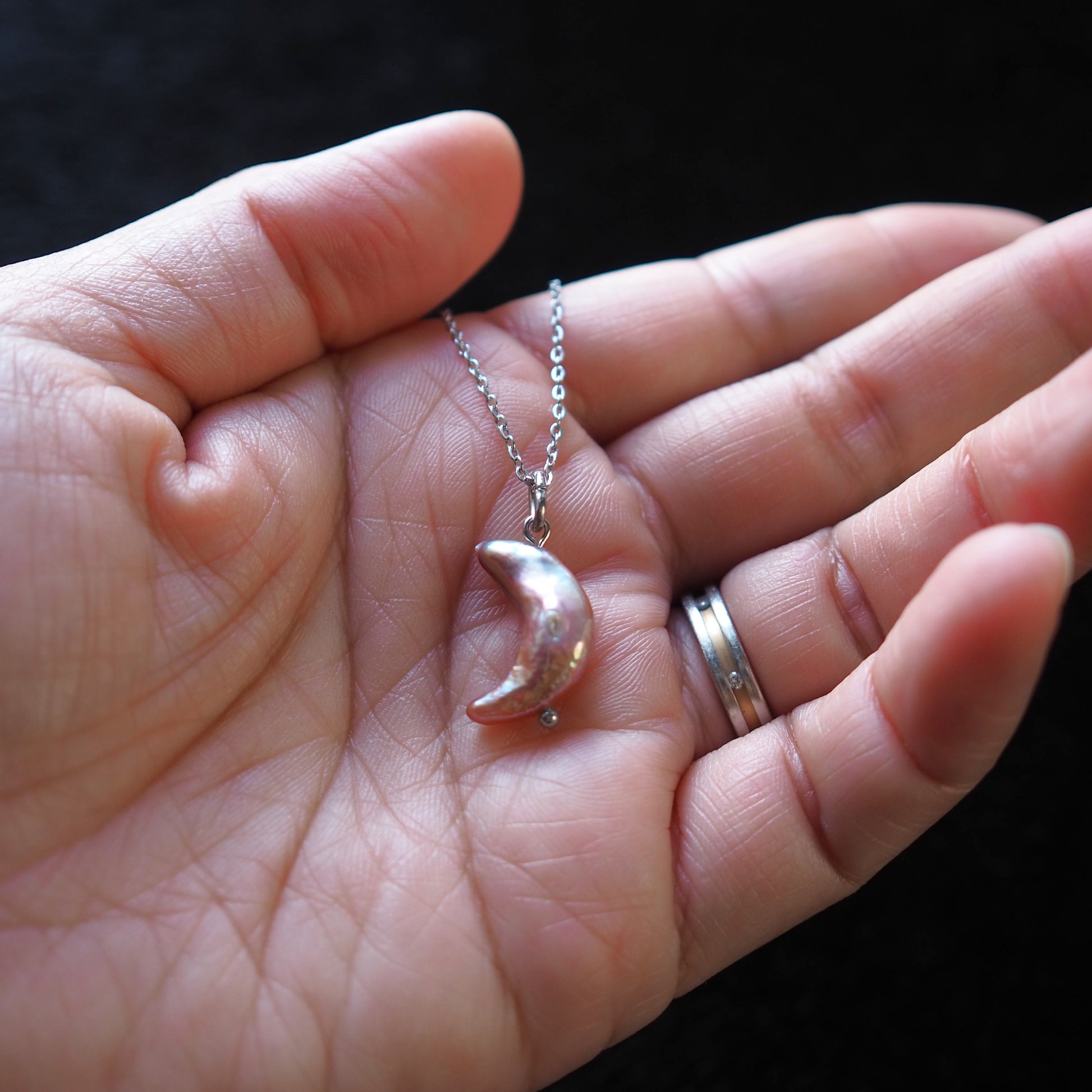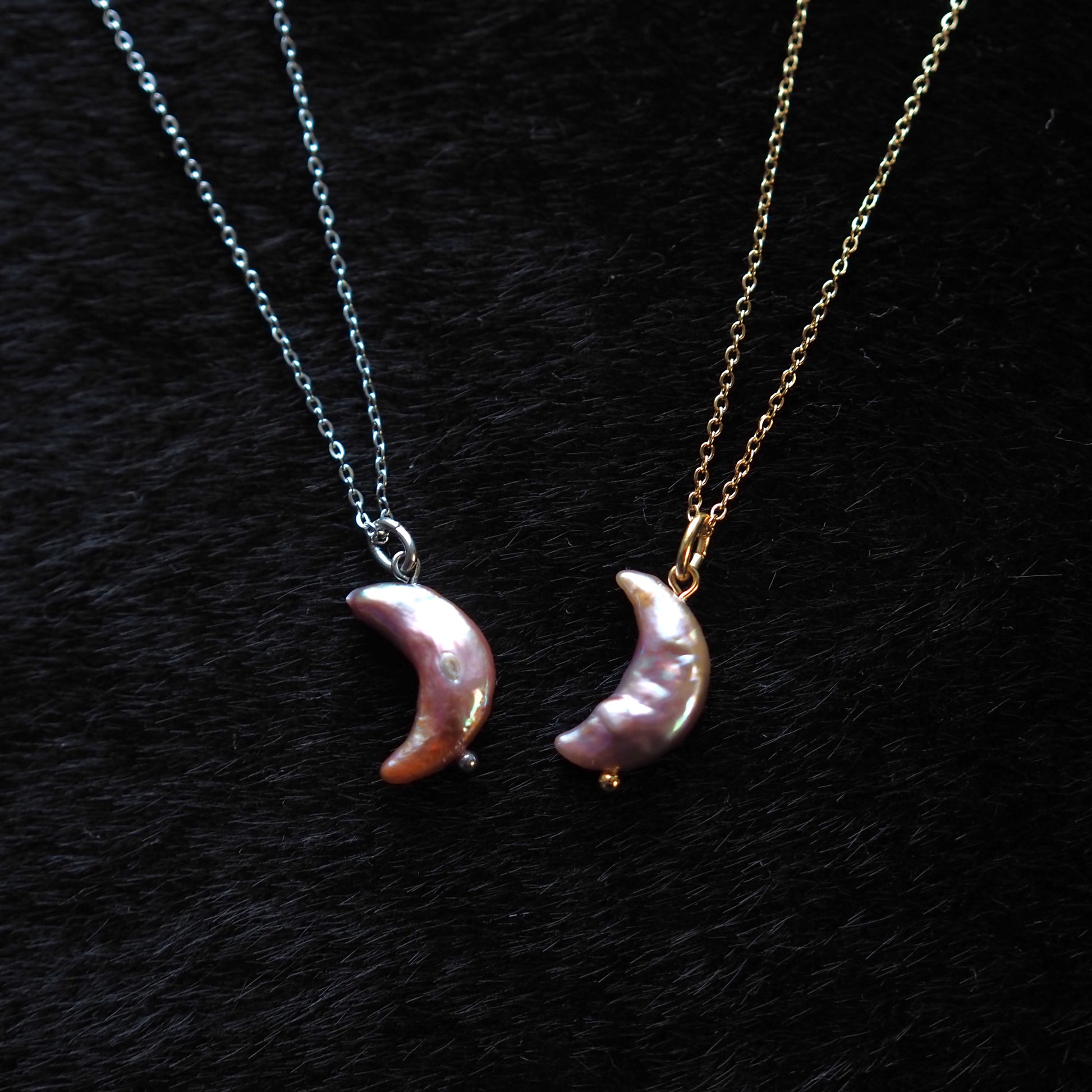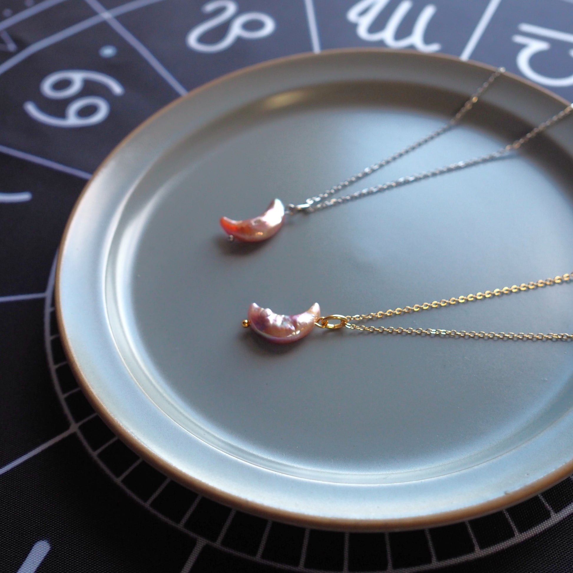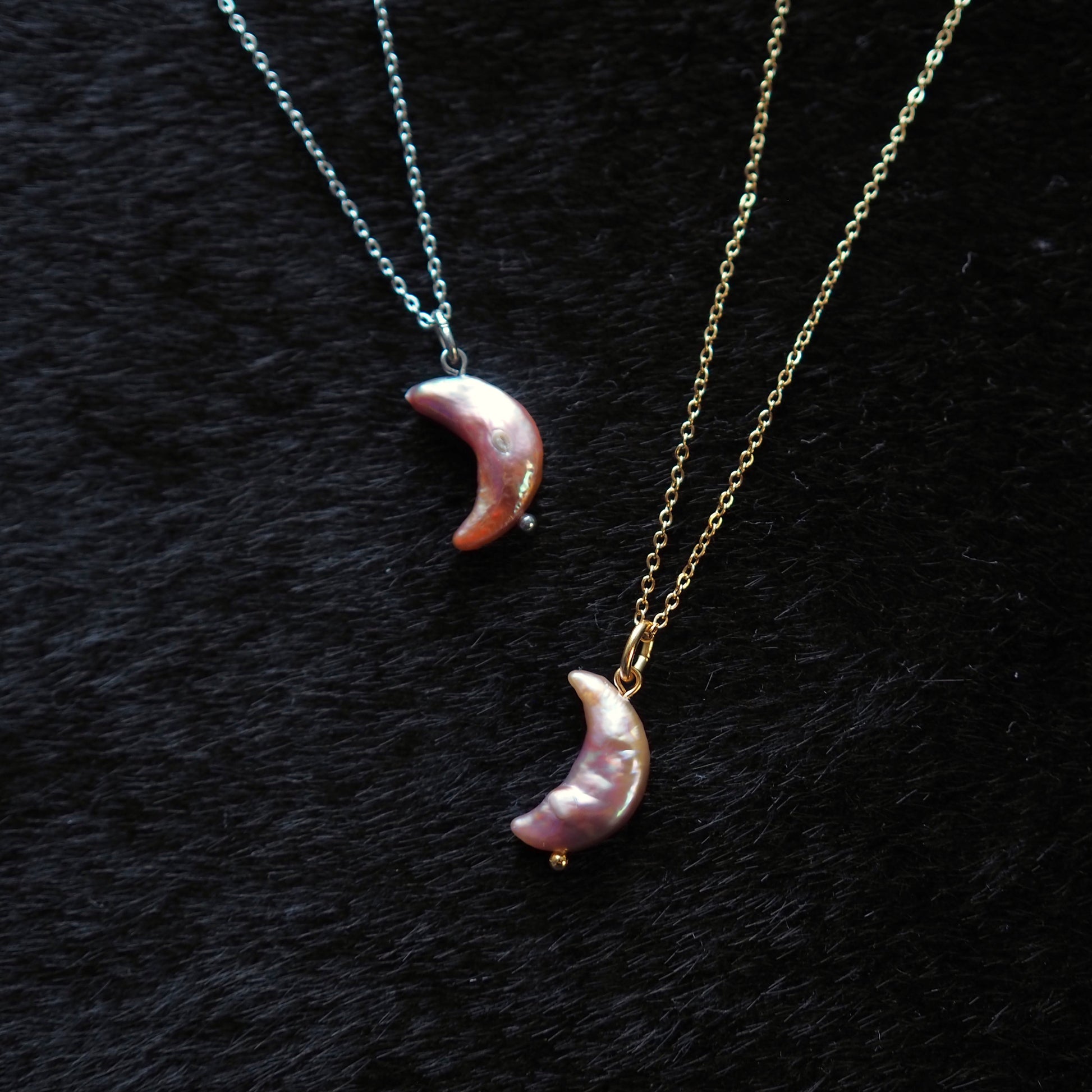 パープルとピンクが混じったような、妖艶なカラーの淡水パールの三日月のペンダント。