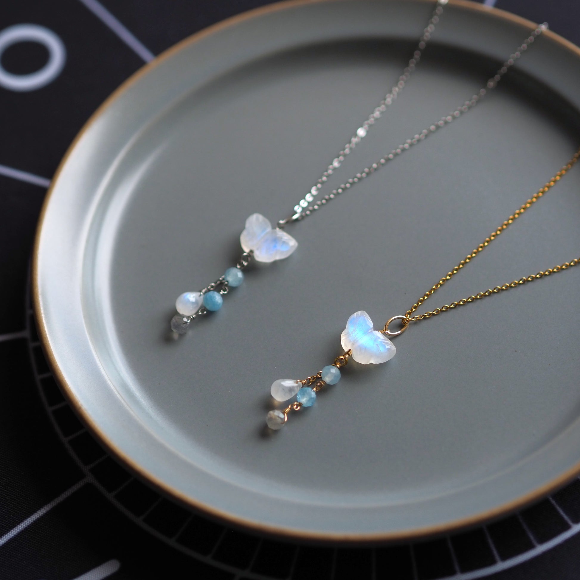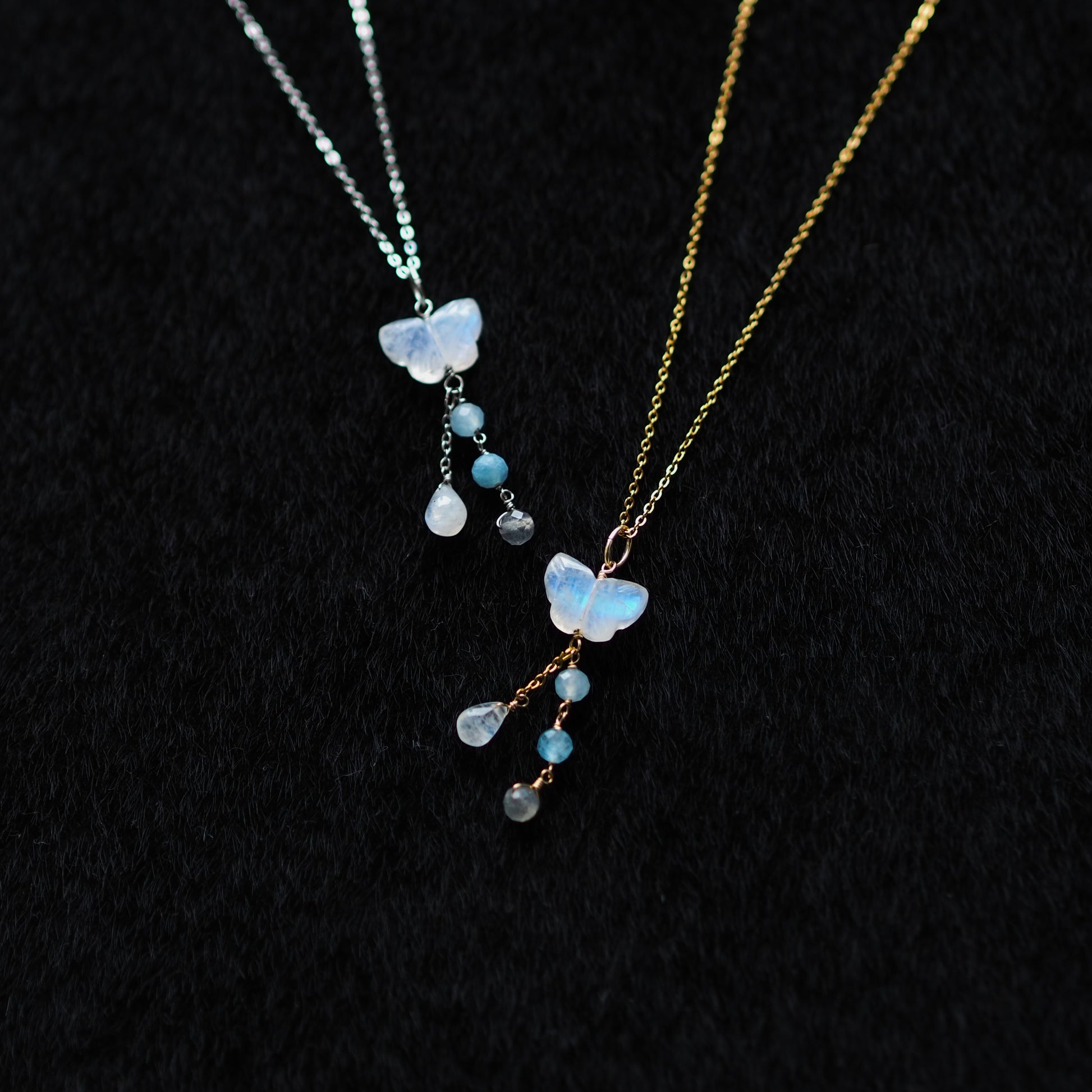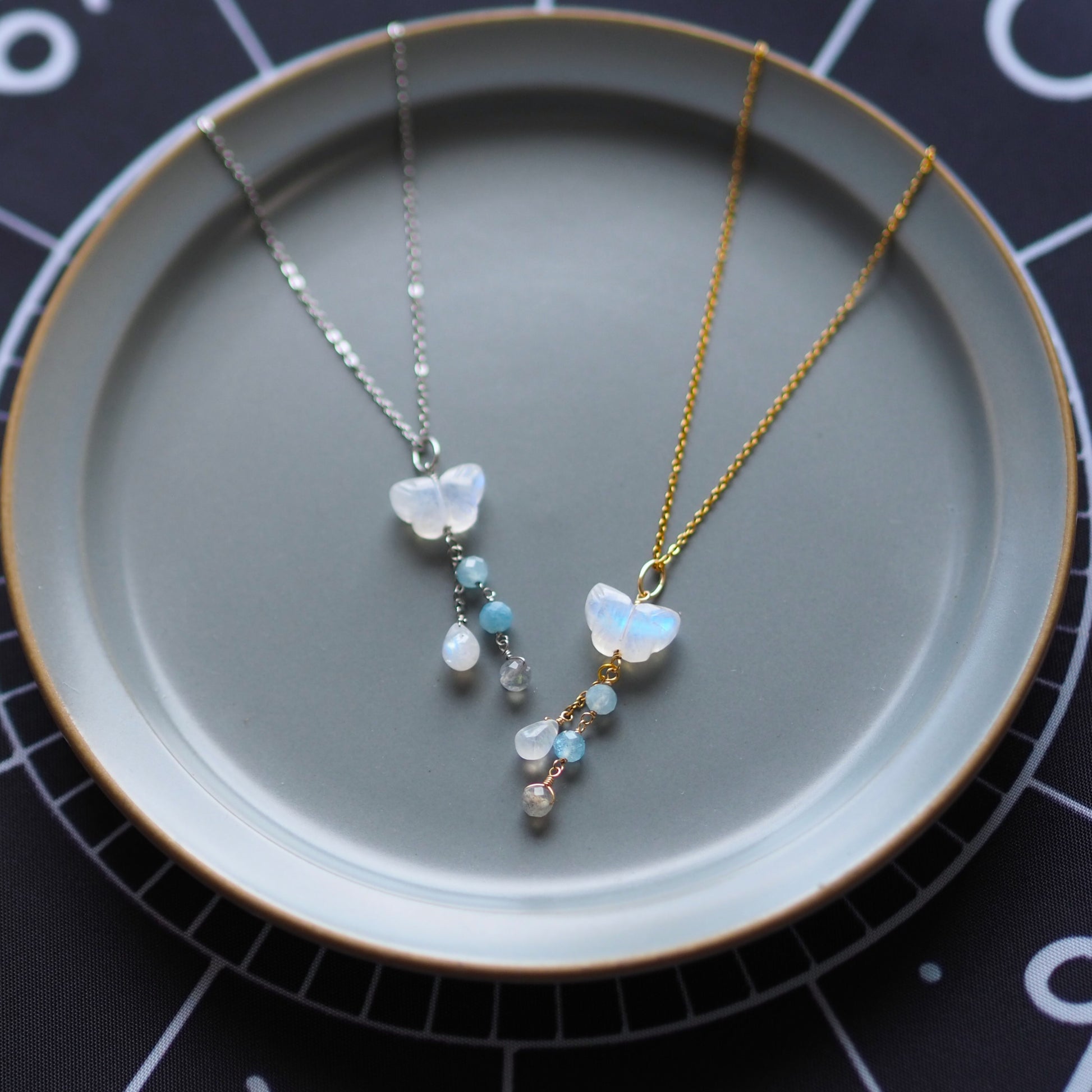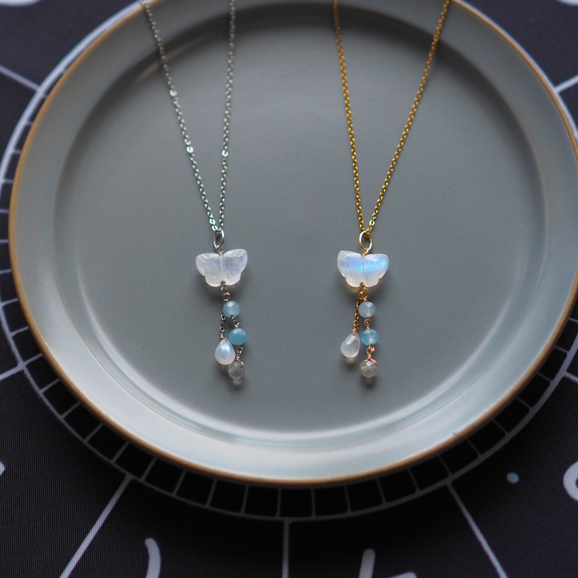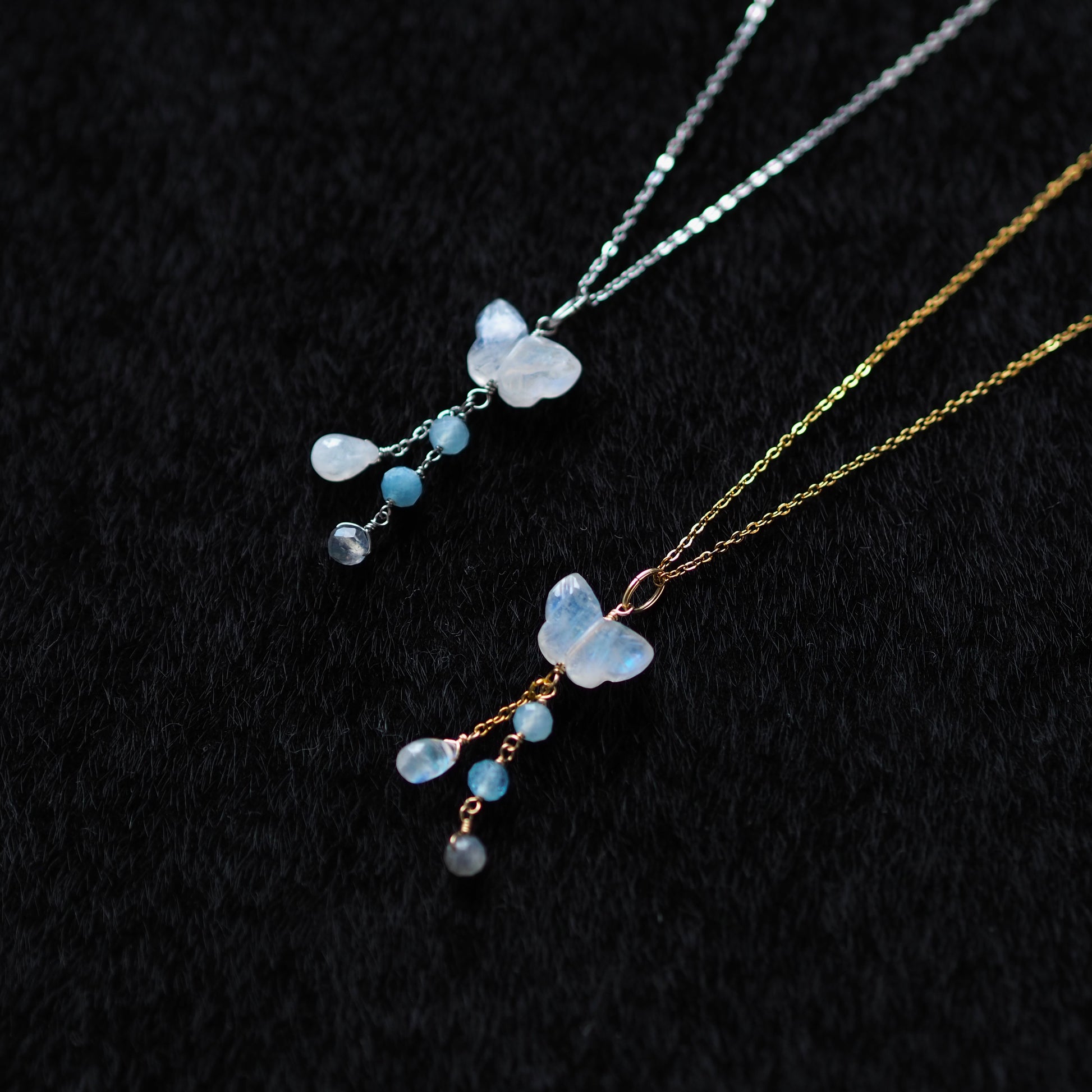 小さな雫型のムーンストーンや、アクアマリンなどの小さな天然石と組み合わせたネックレスです。