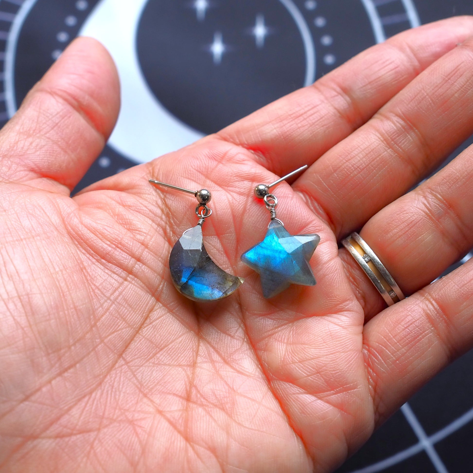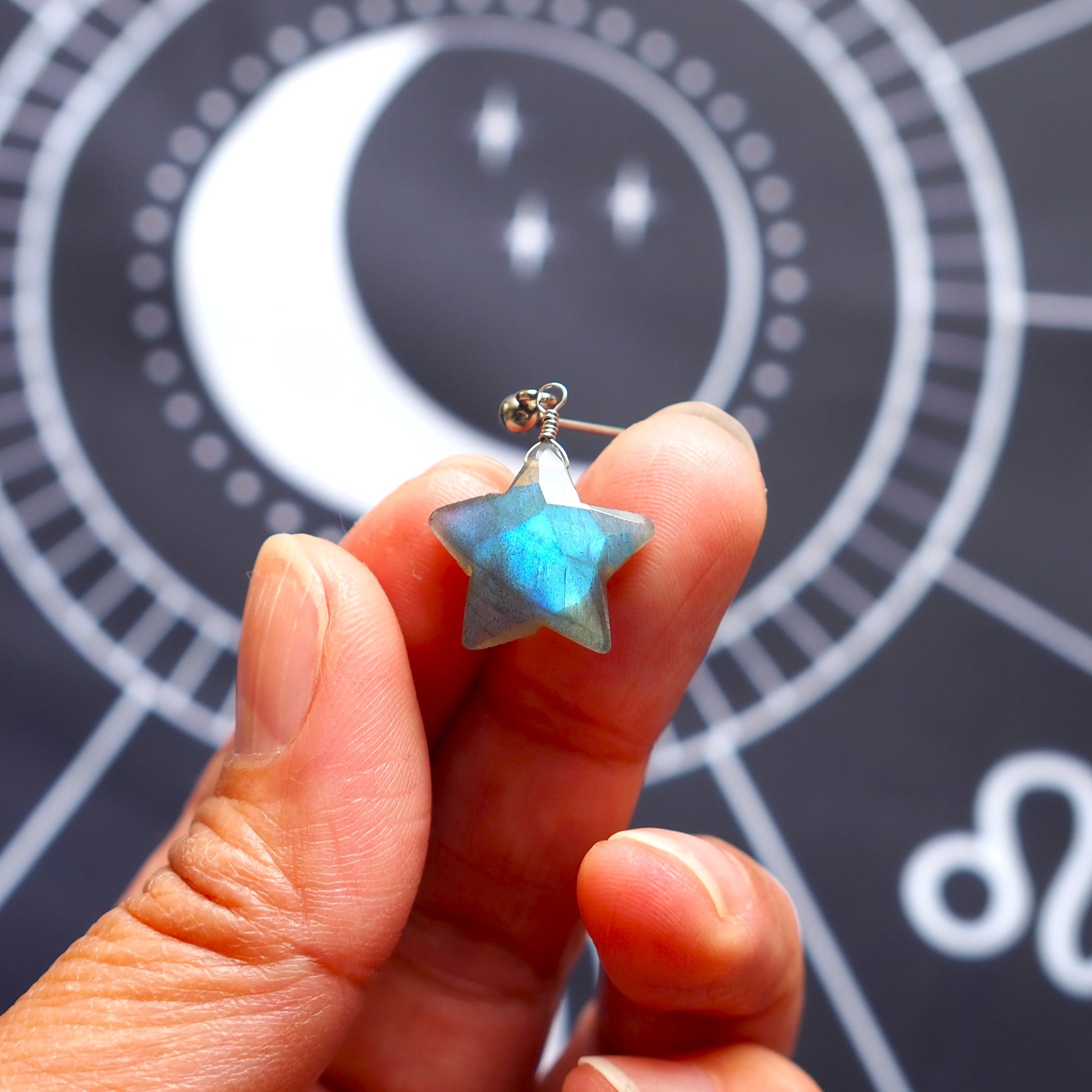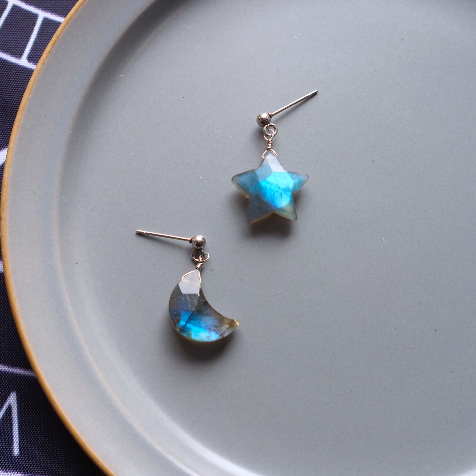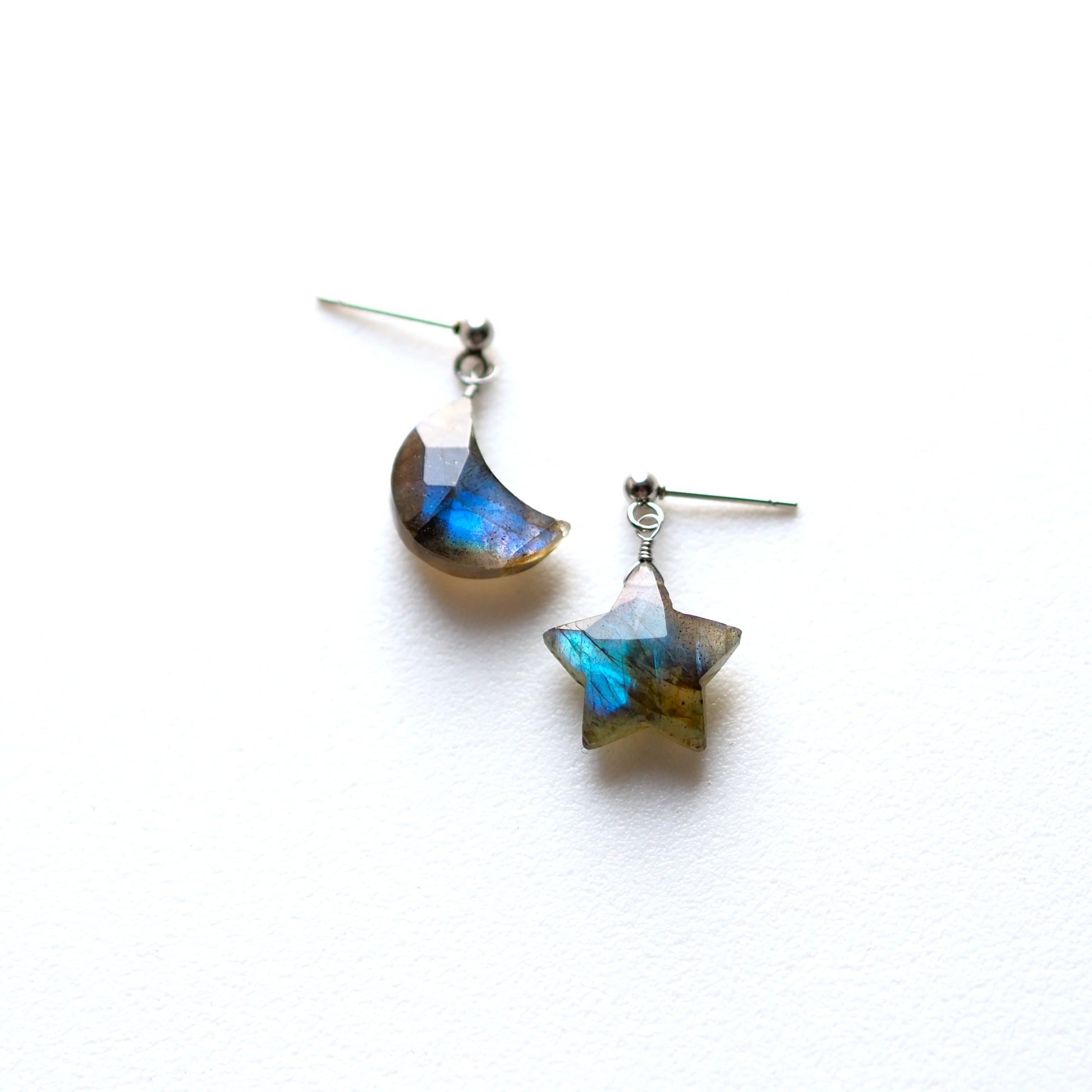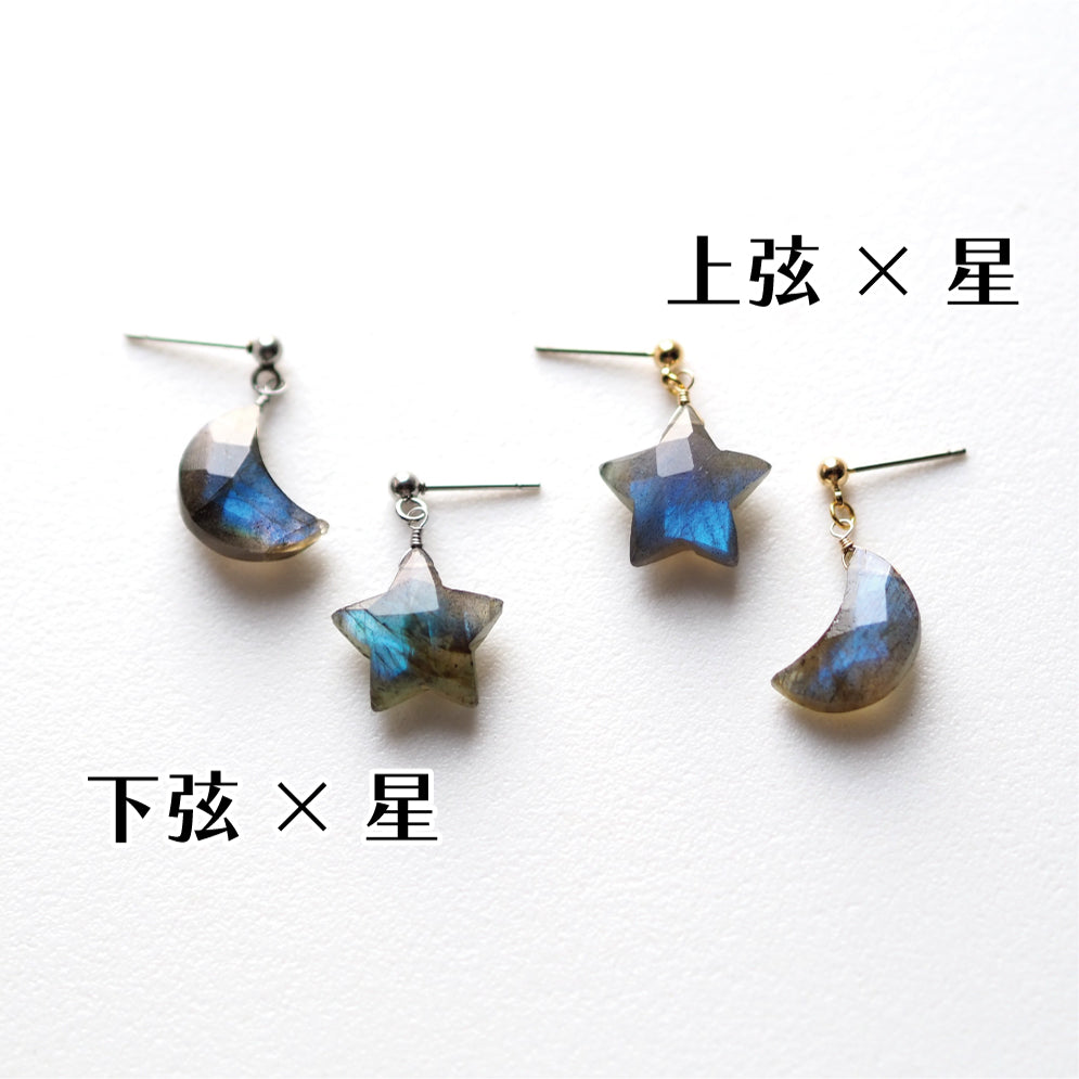 ブルーのシラーが美しいラブラドライトの星×月で、月の向きを選べる耳飾りをご用意しました。