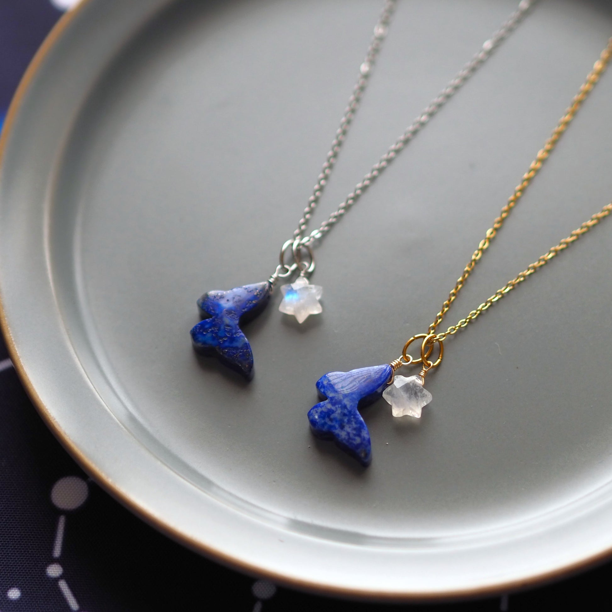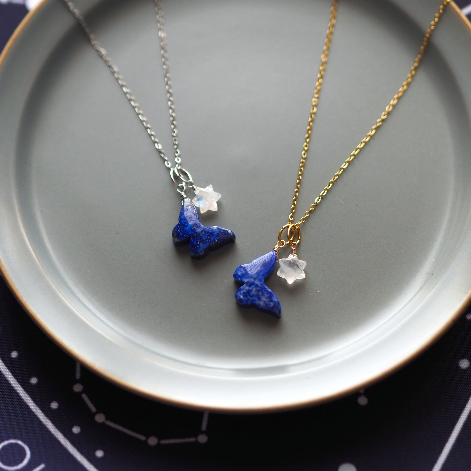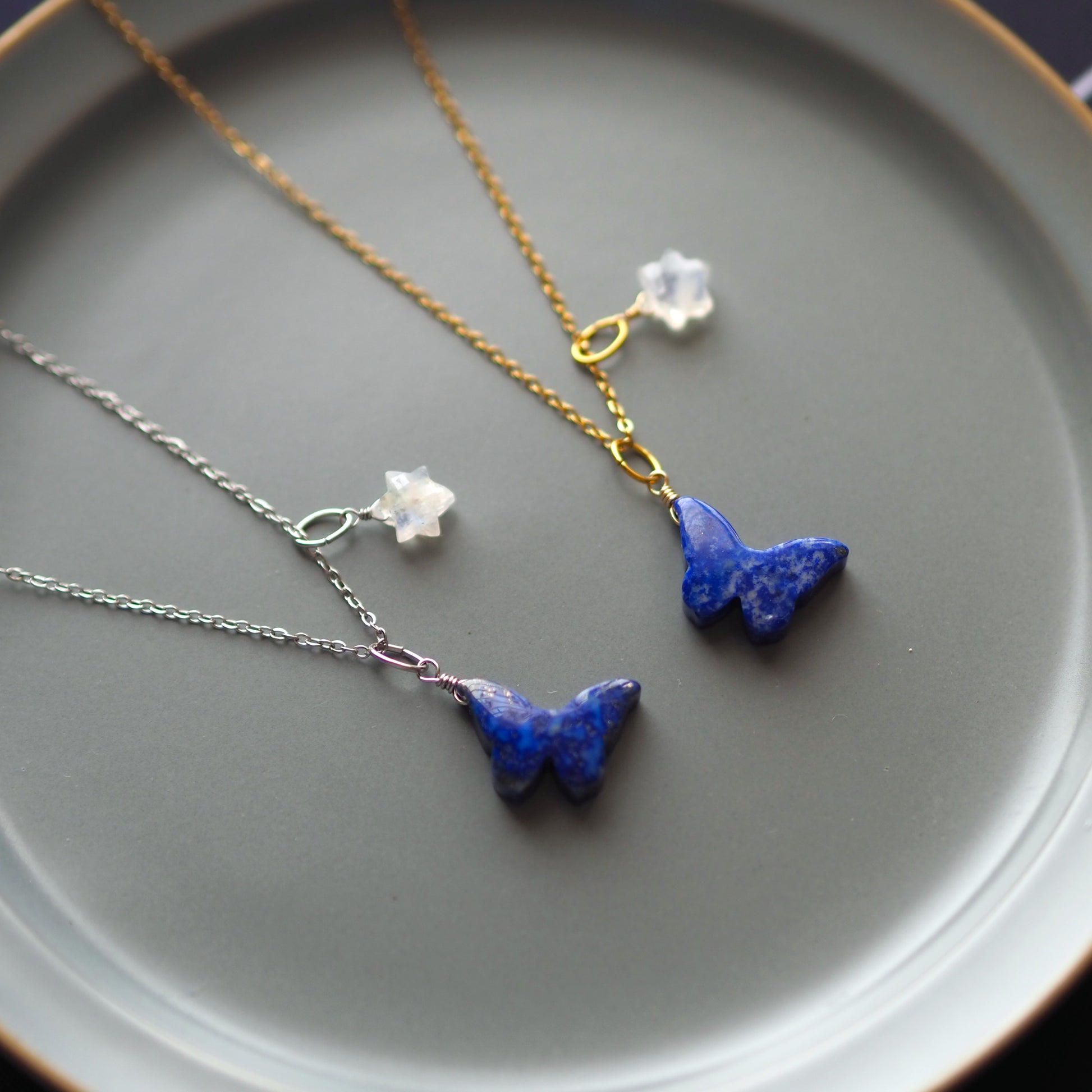 夜空を切り取ったようなまだら模様が美しいラピスラズリの蝶を組み合わせたペンダント