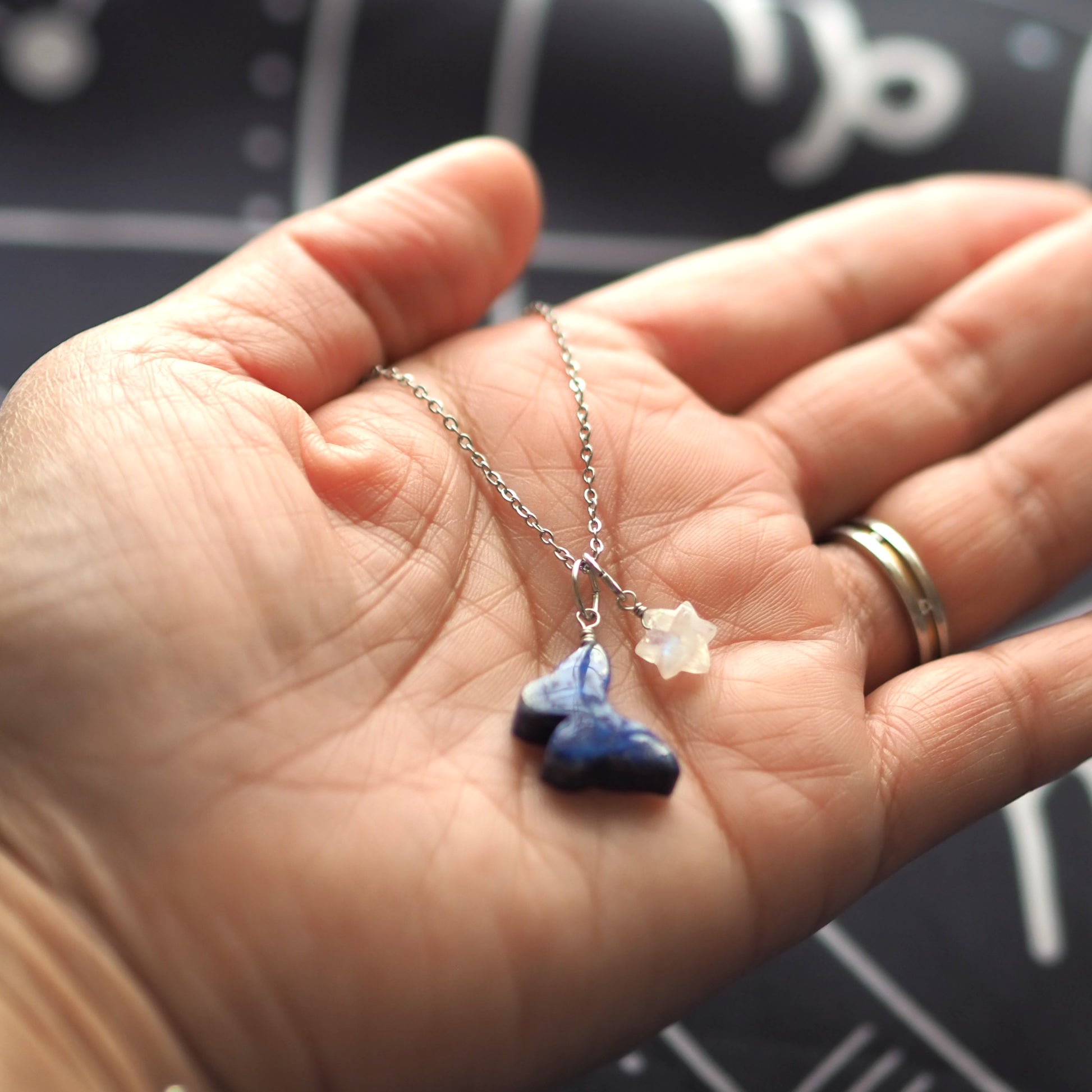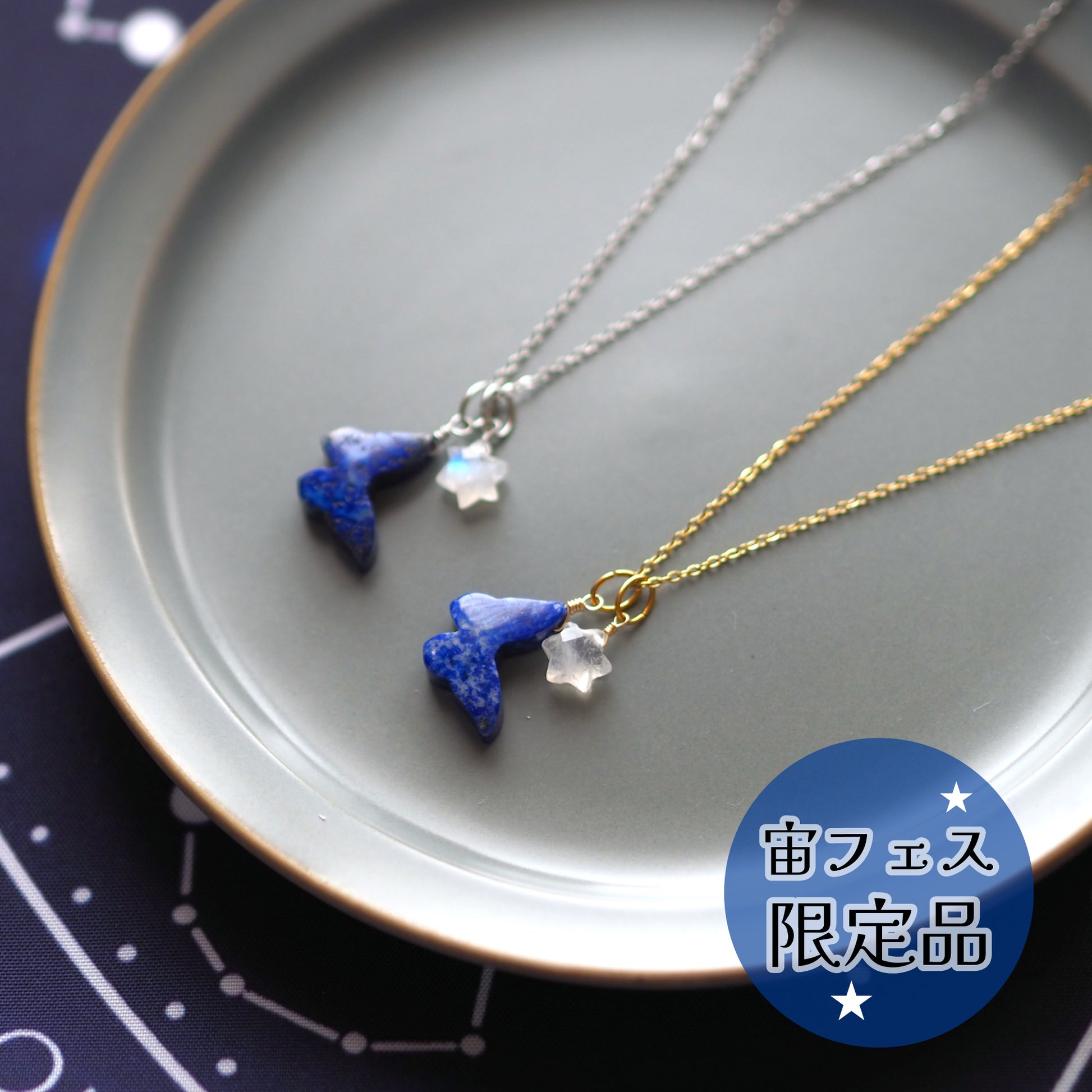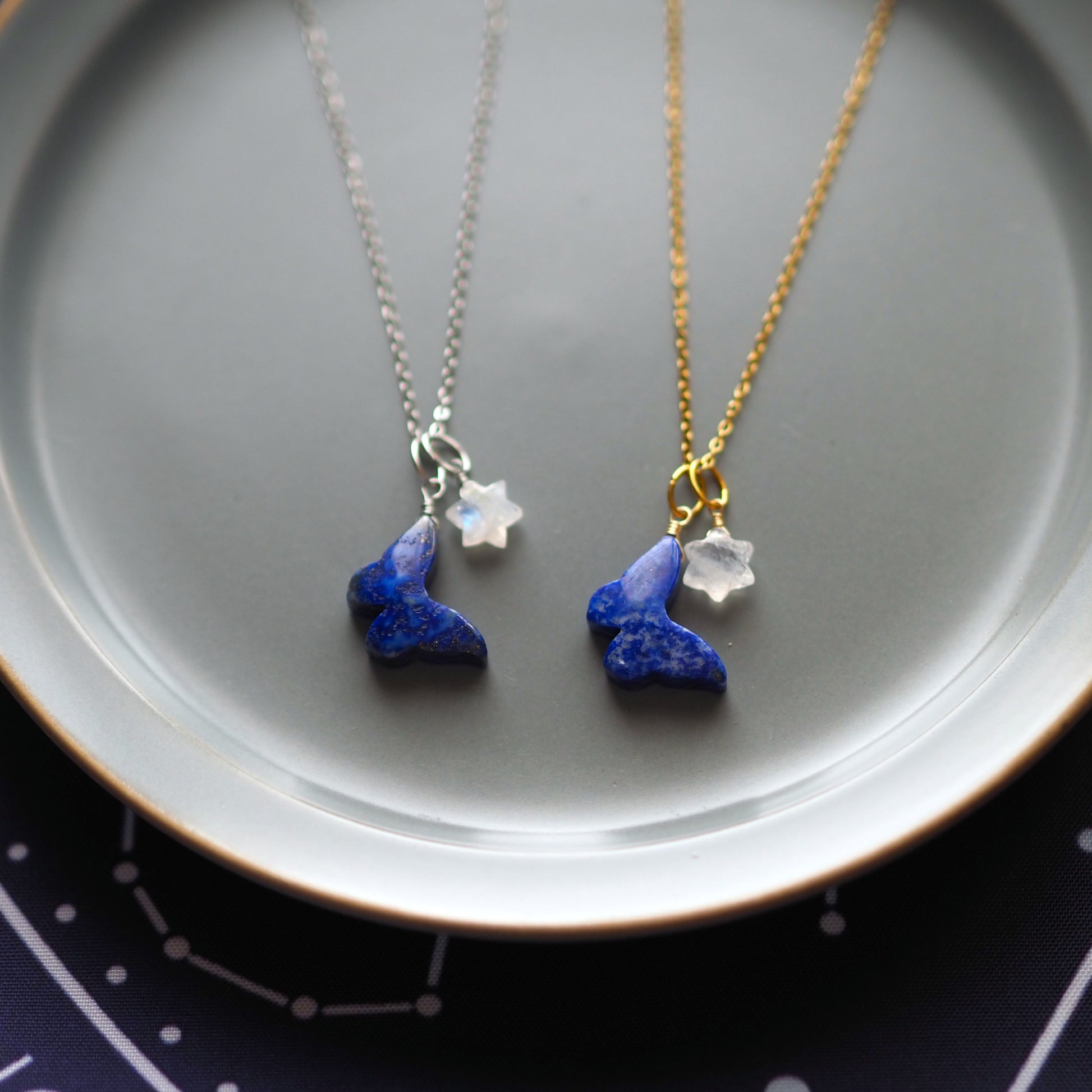 夜空を切り取ったようなまだら模様が美しいラピスラズリの蝶を組み合わせたペンダント