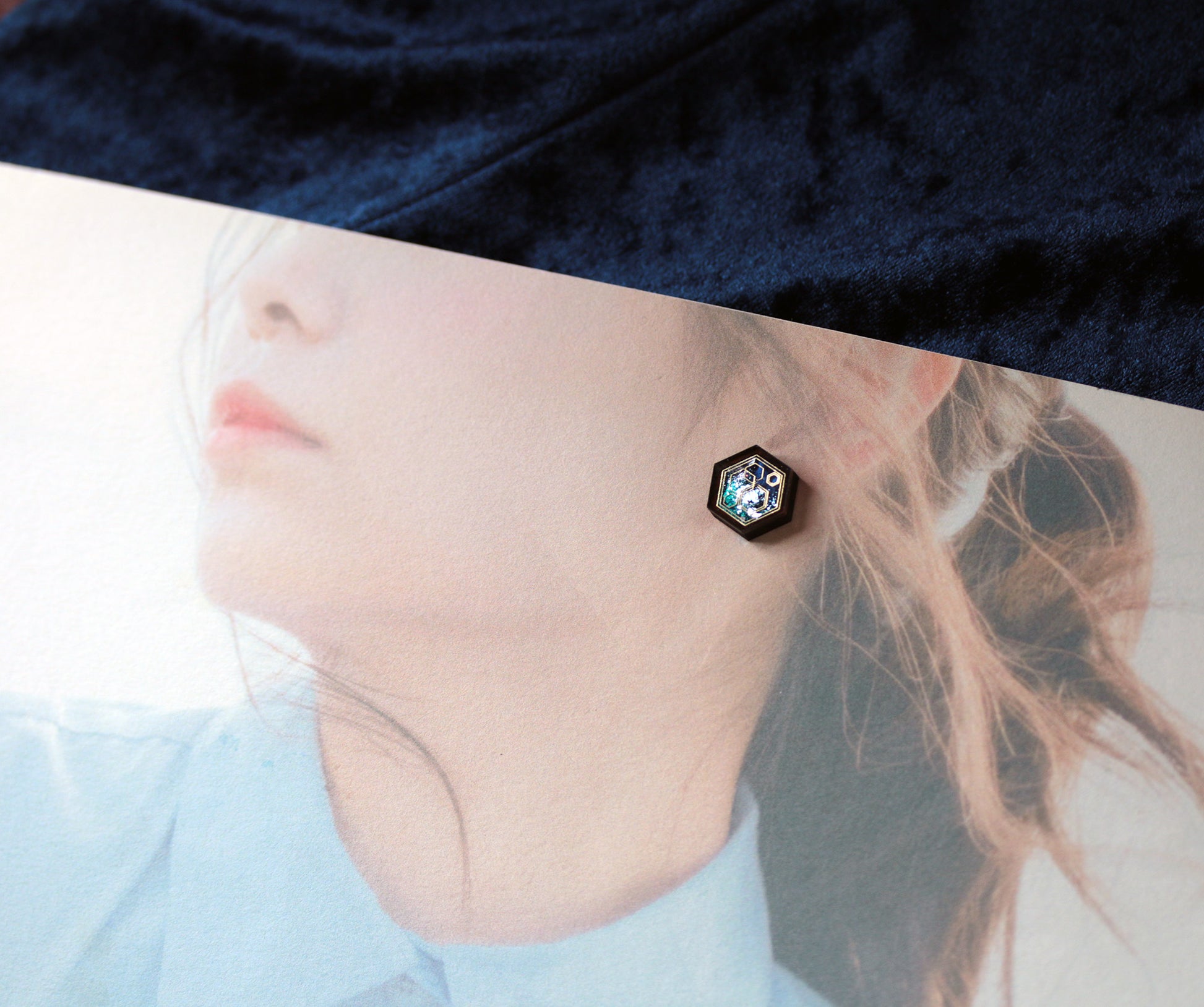 美しい宇宙模様をウォルナットの木目と色味で閉じ込め、幾何学模様のモチーフで閉じ込めました。HEXとは六角形、アクセサリーの形をさしています。
