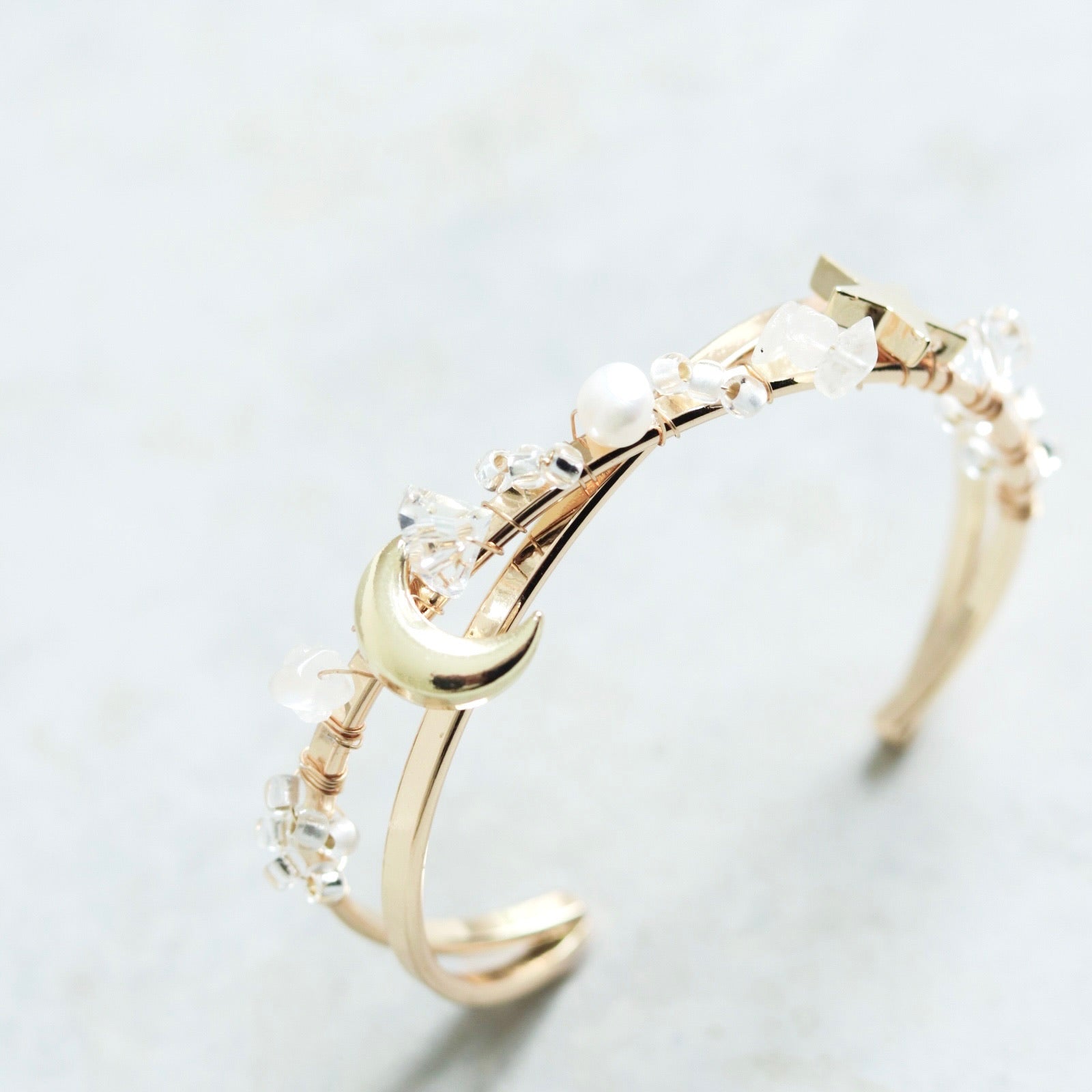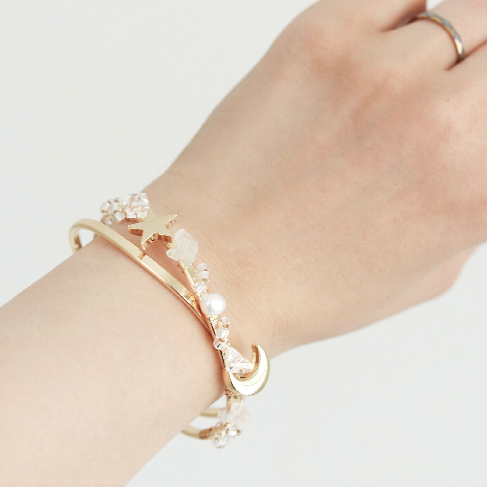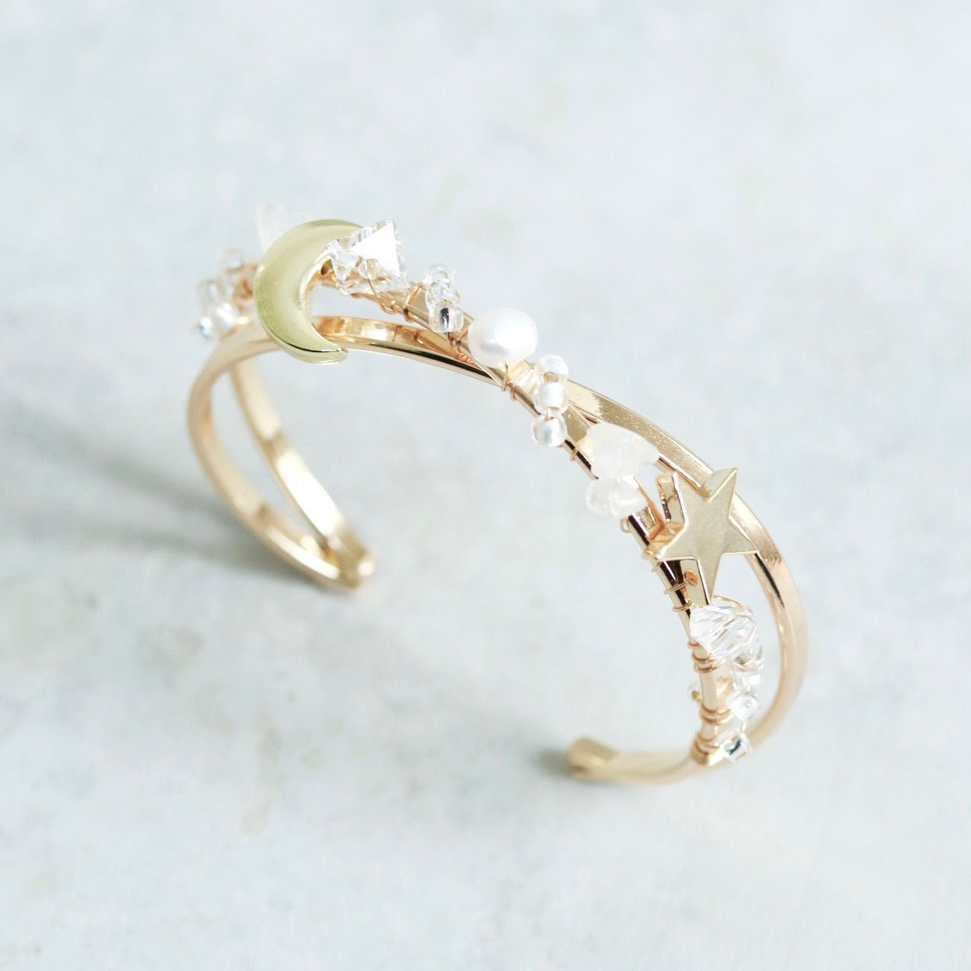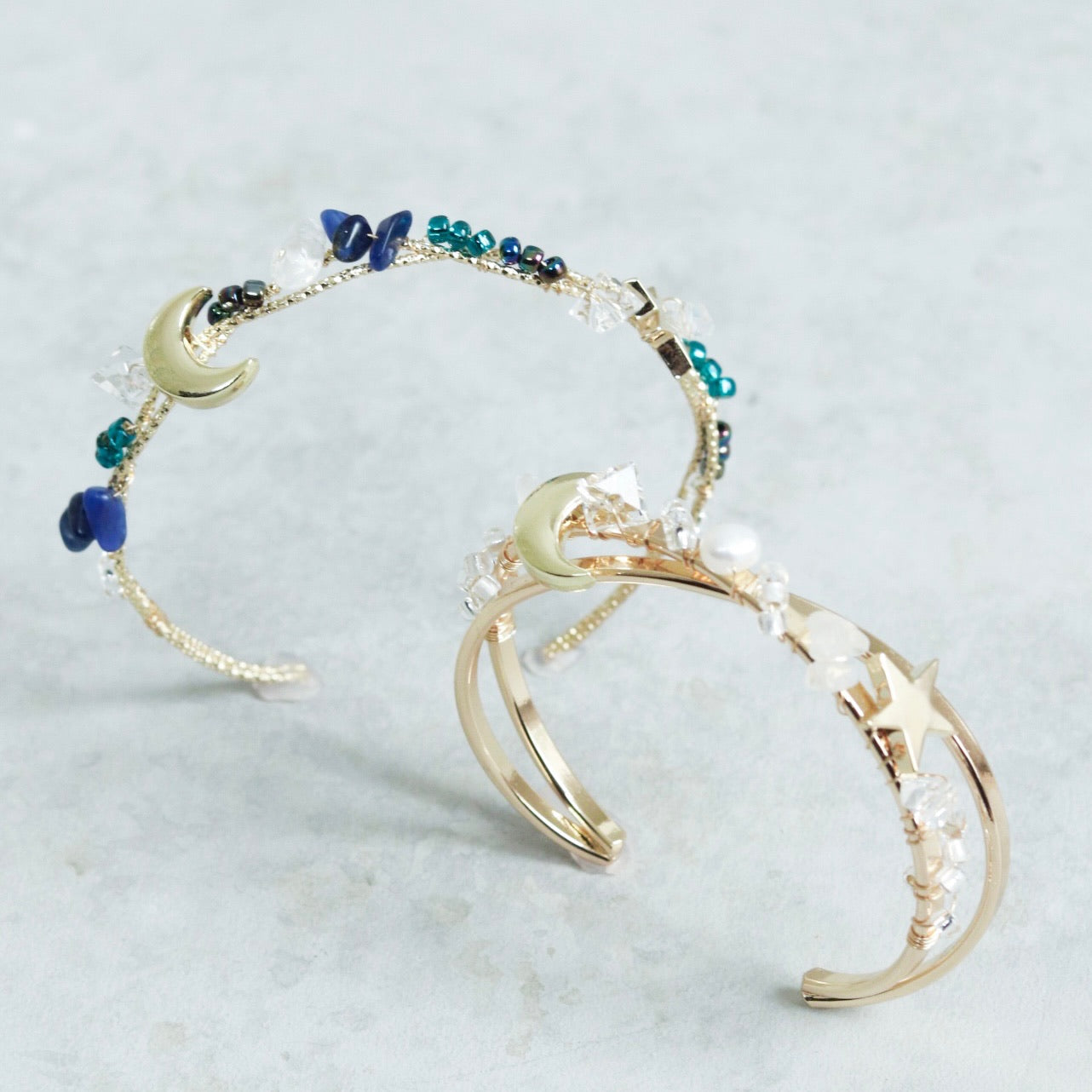 バングル金具に月や星のメタルパーツと天然石やビーズをワイヤーで丁寧に紡ぎました。