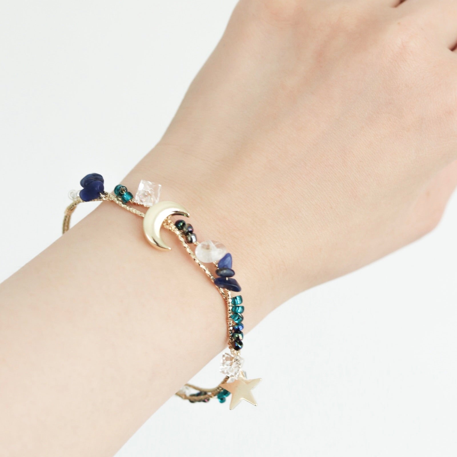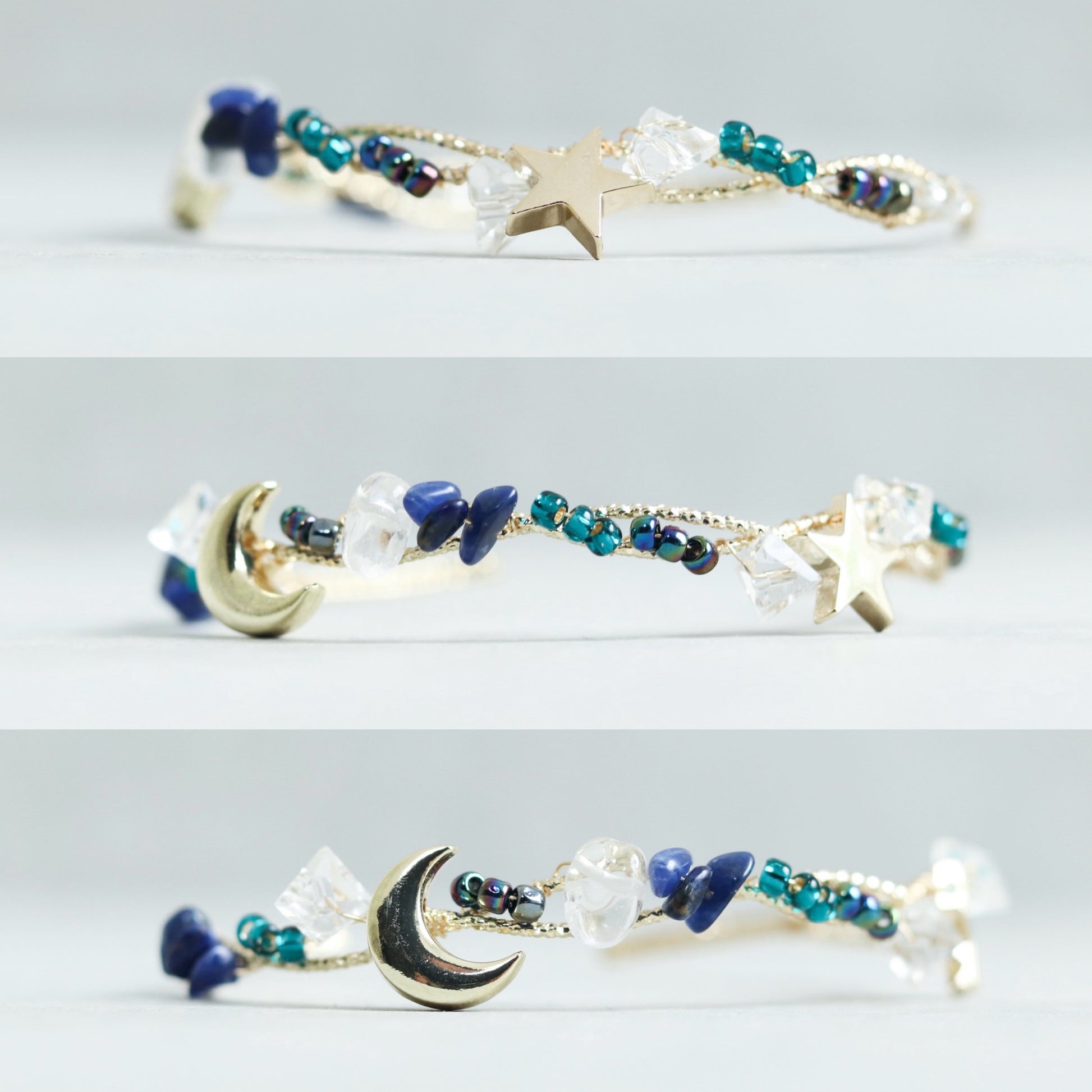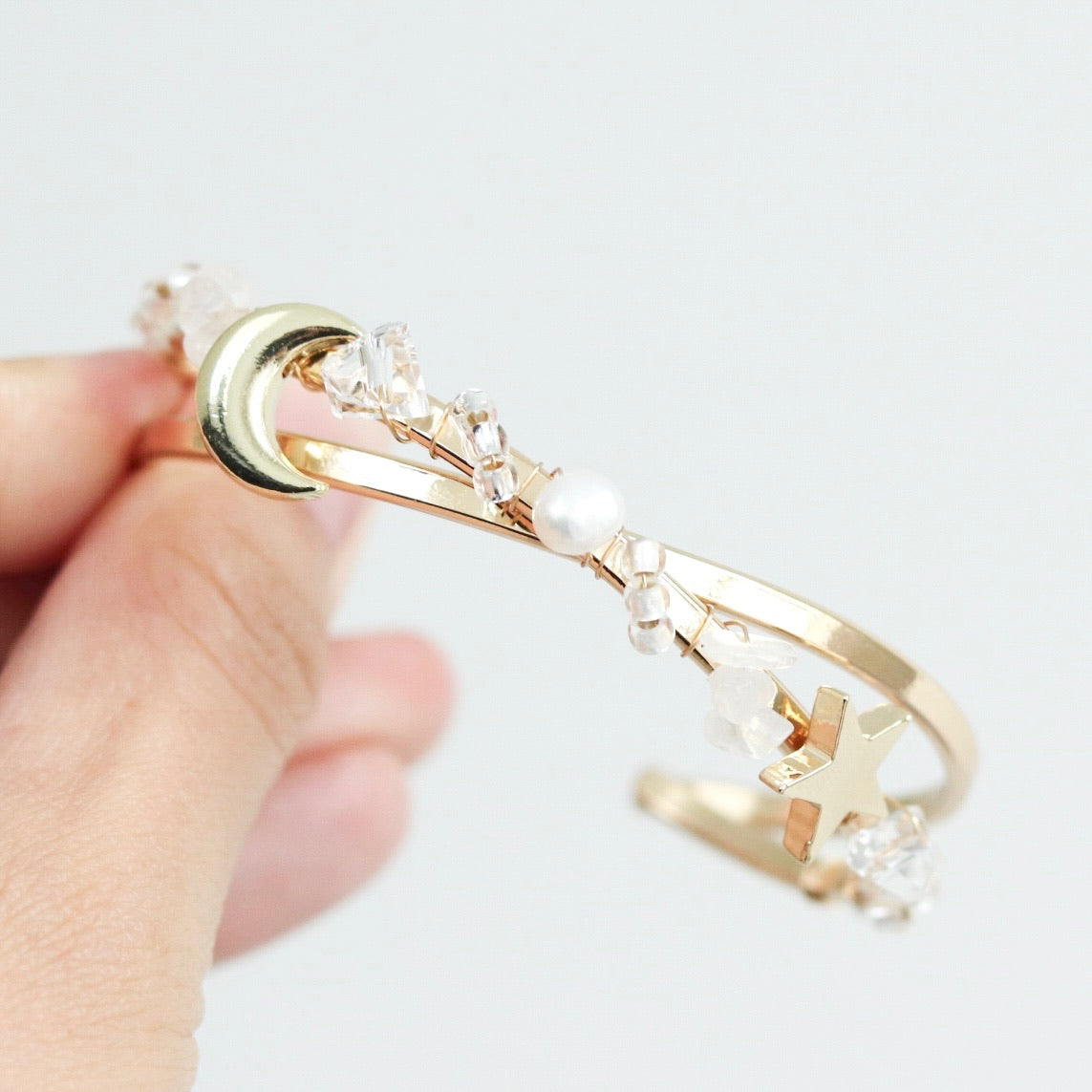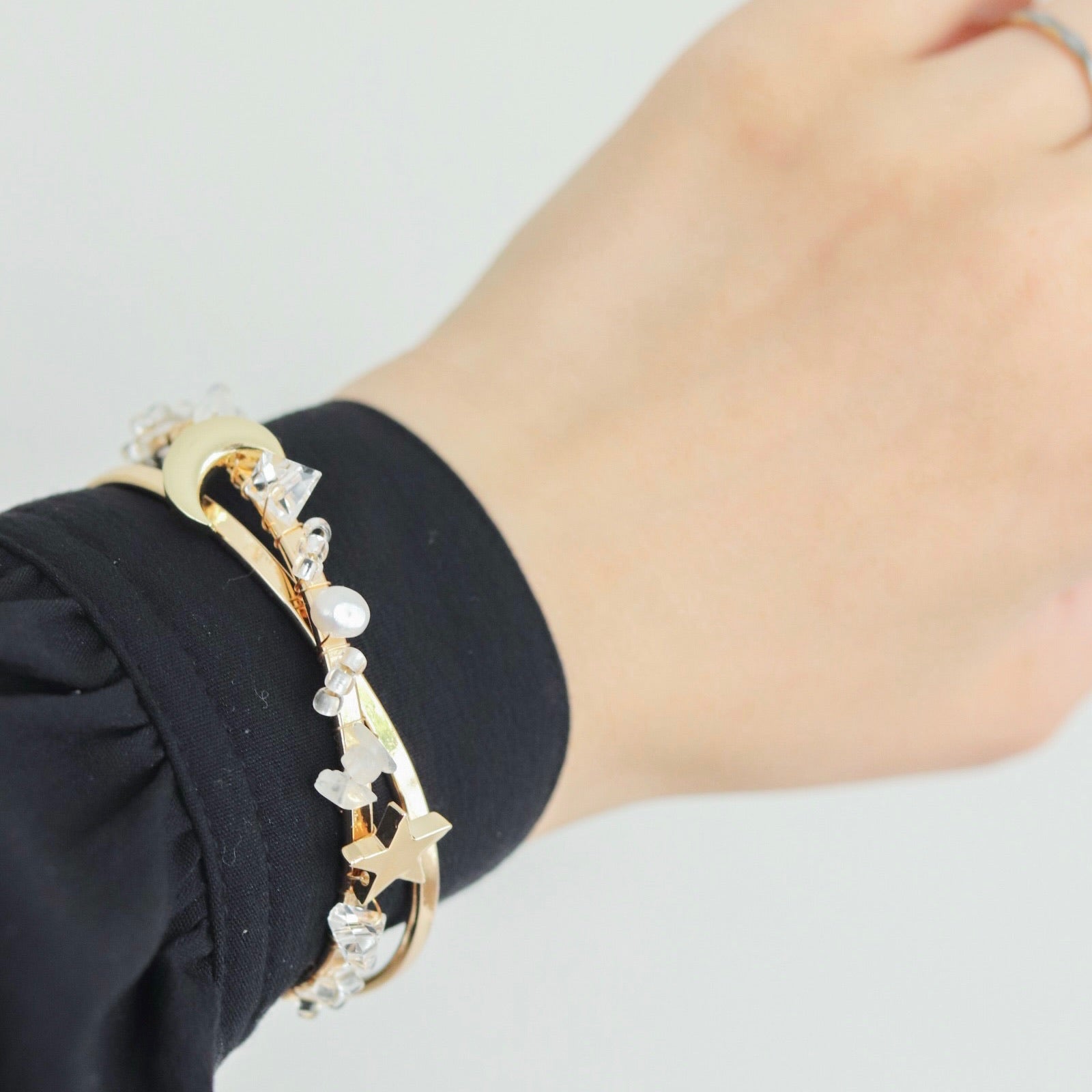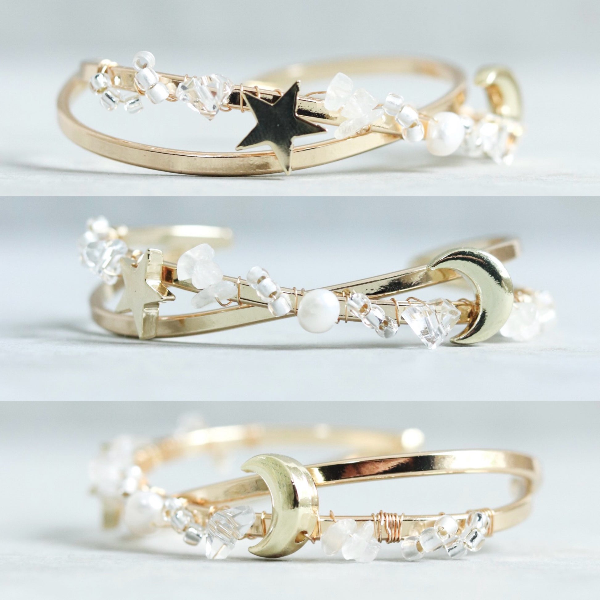バングル金具に月や星のメタルパーツと天然石やビーズをワイヤーで丁寧に紡ぎました。