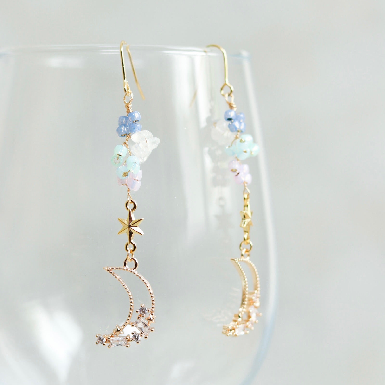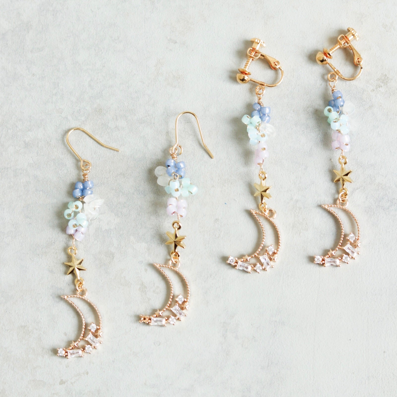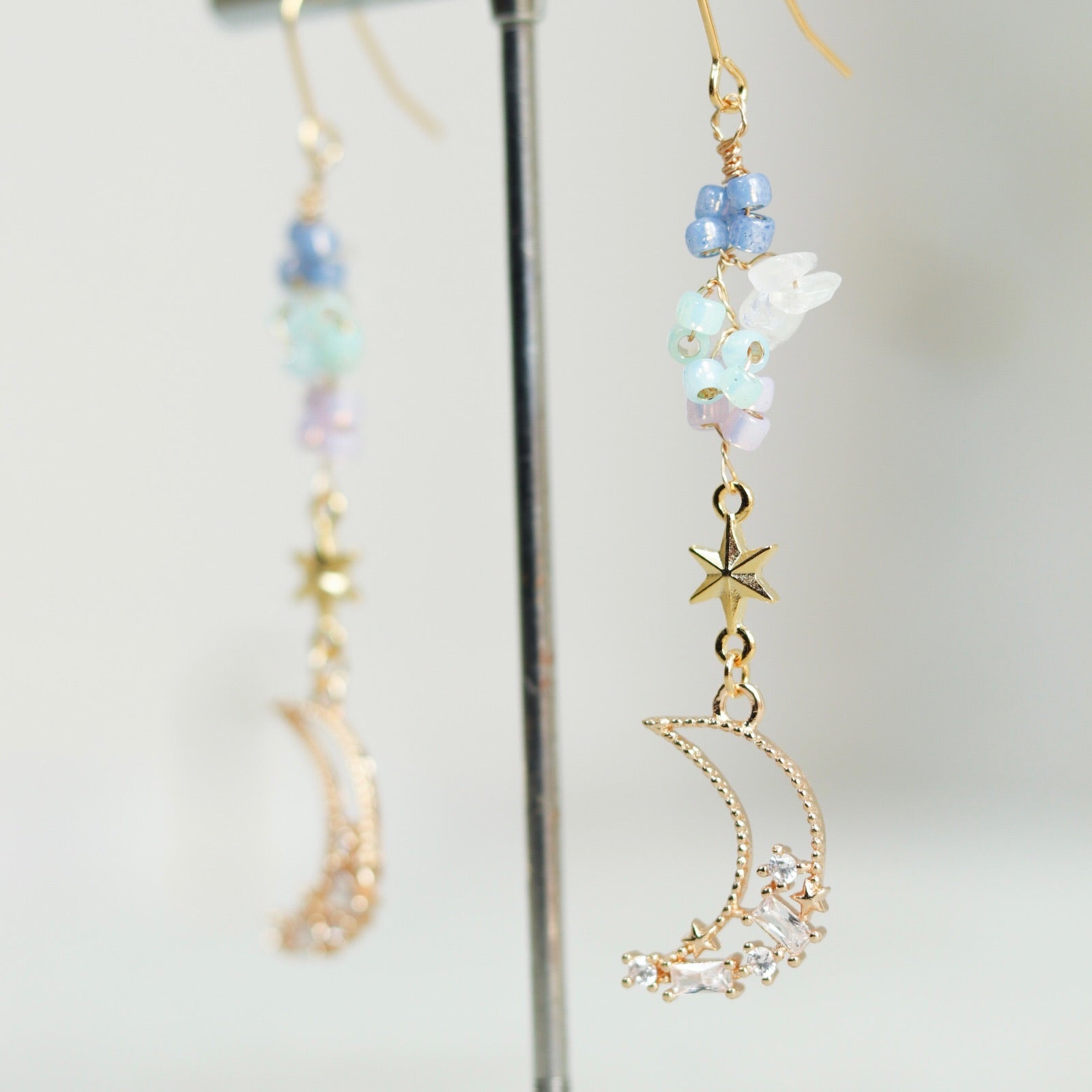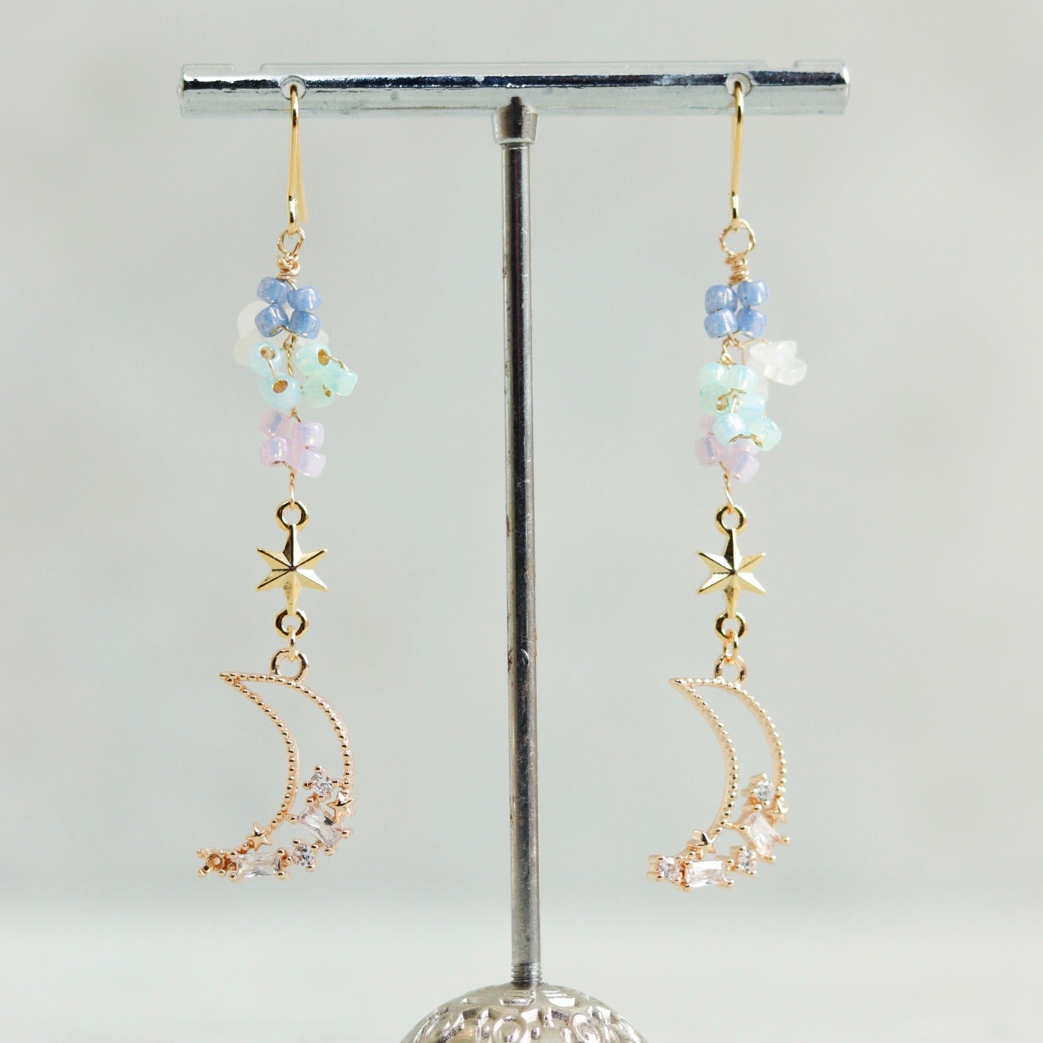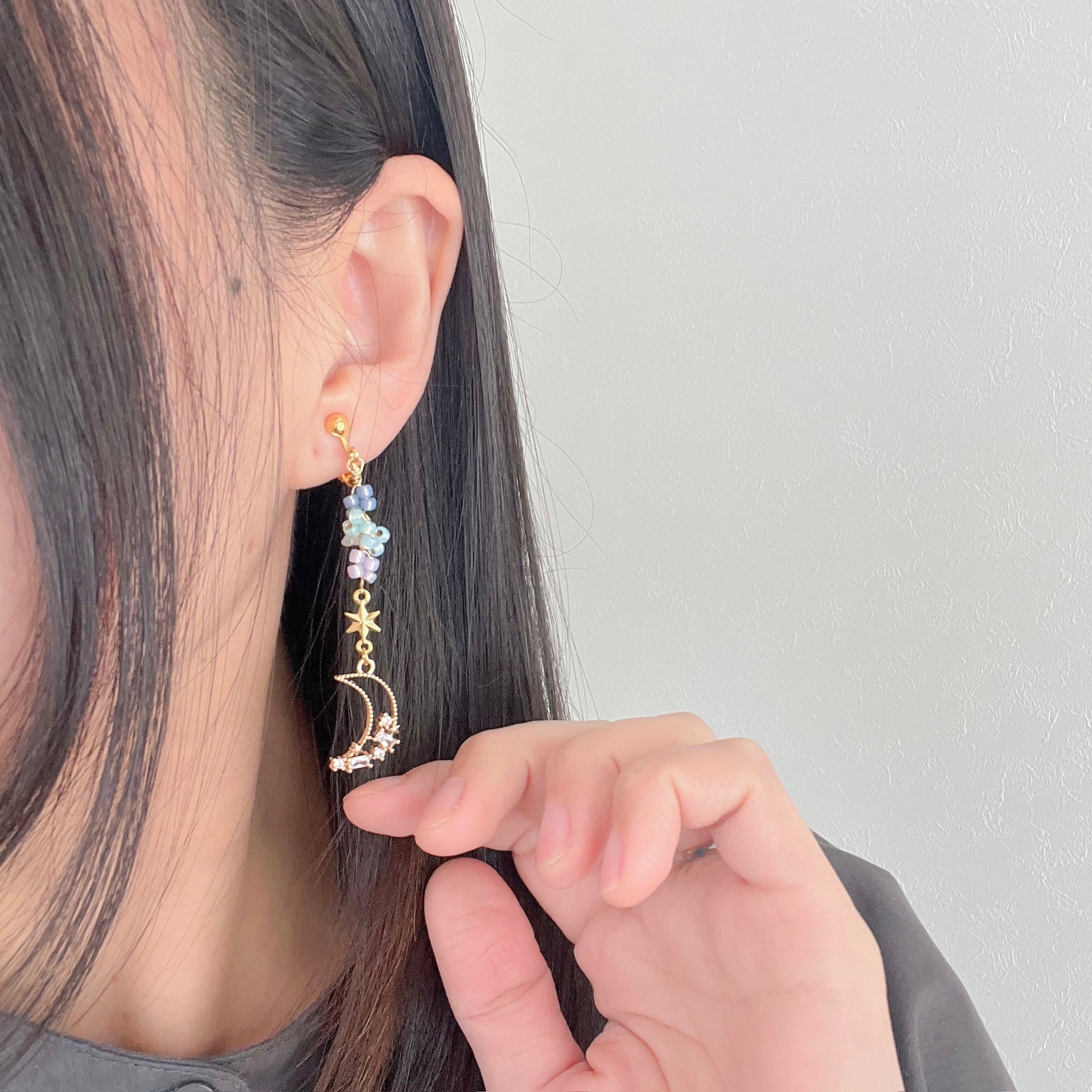 お月様にはジルコニアがきらりと光る、揺れるタイプの耳飾りです。