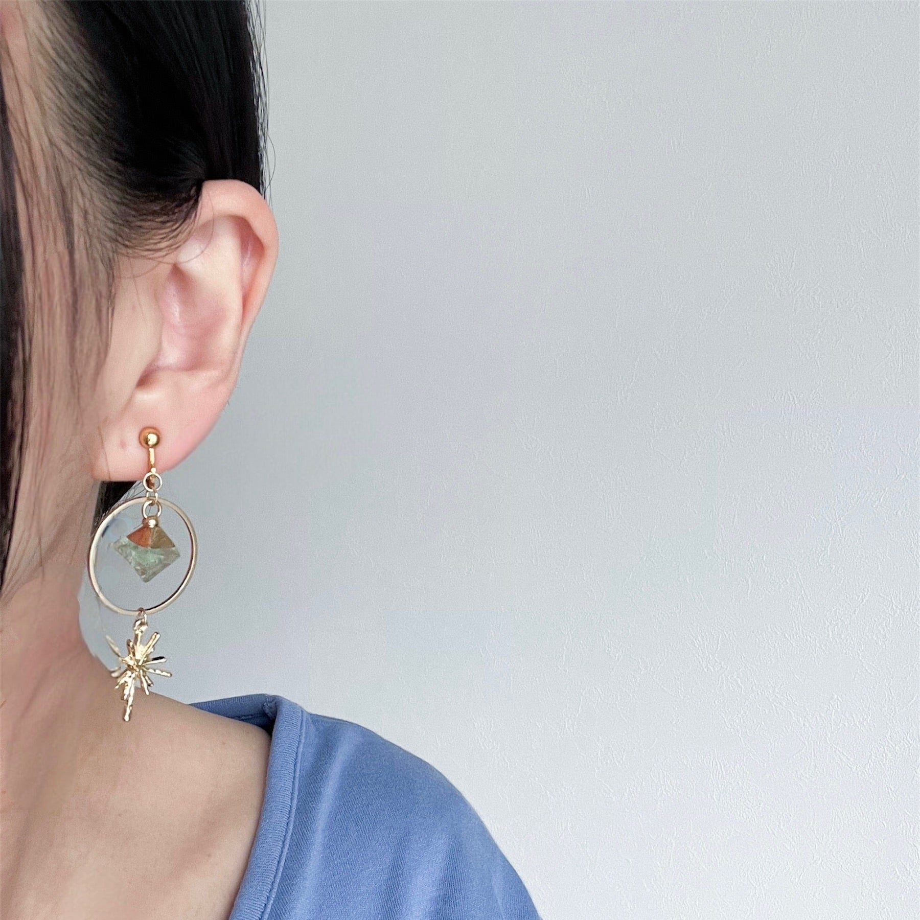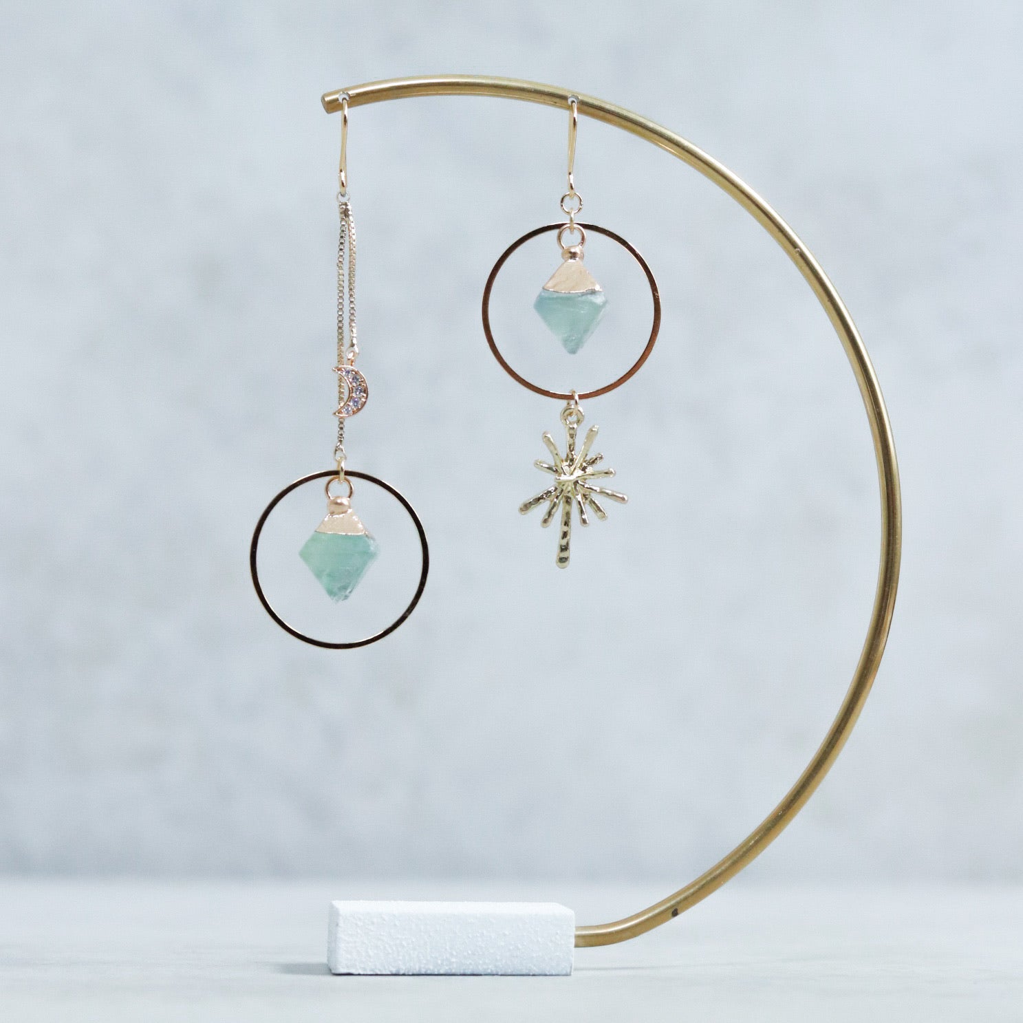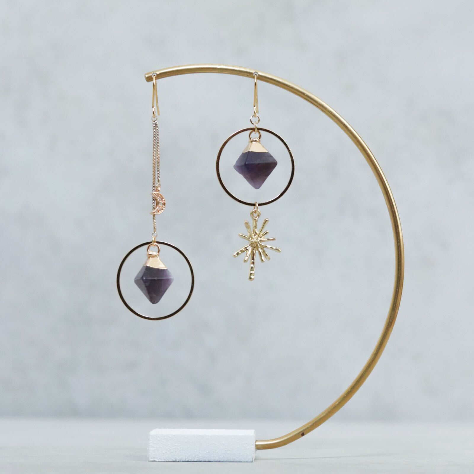月と太陽のチャームの他に、天体をイメージした2.5cmのフープと八面体の天然石を使用しました。