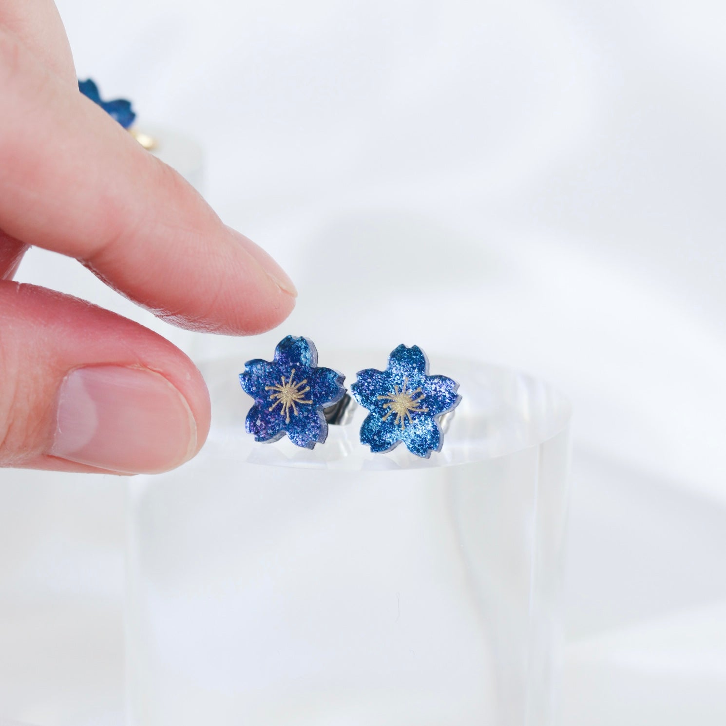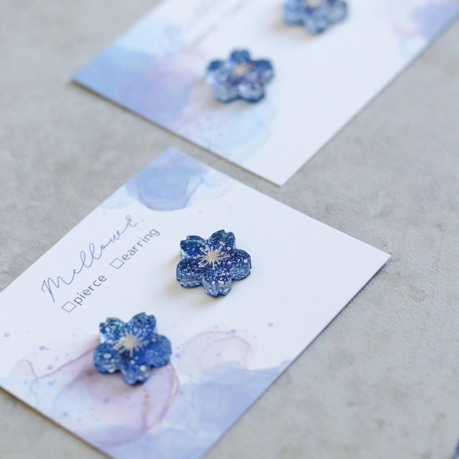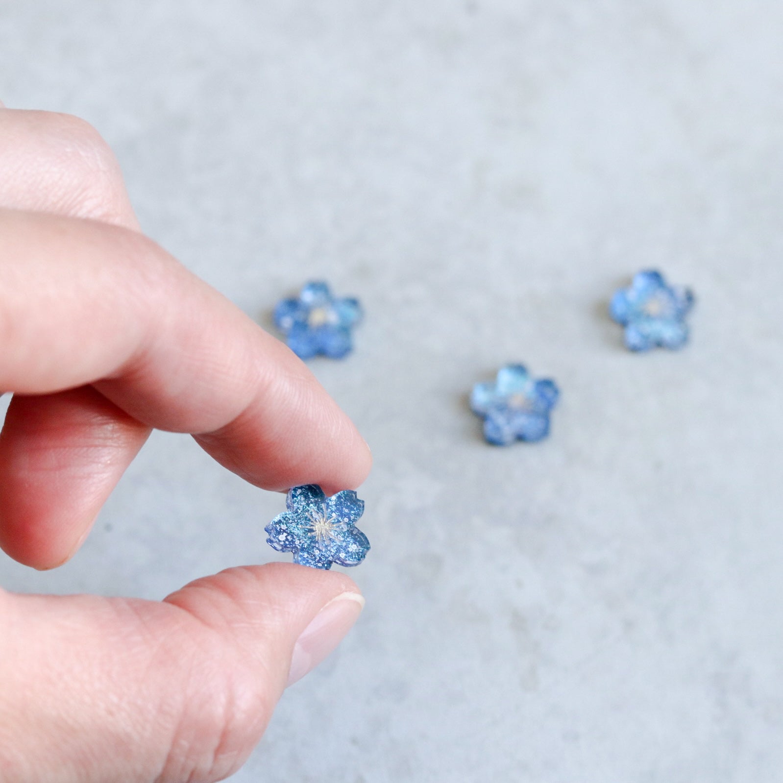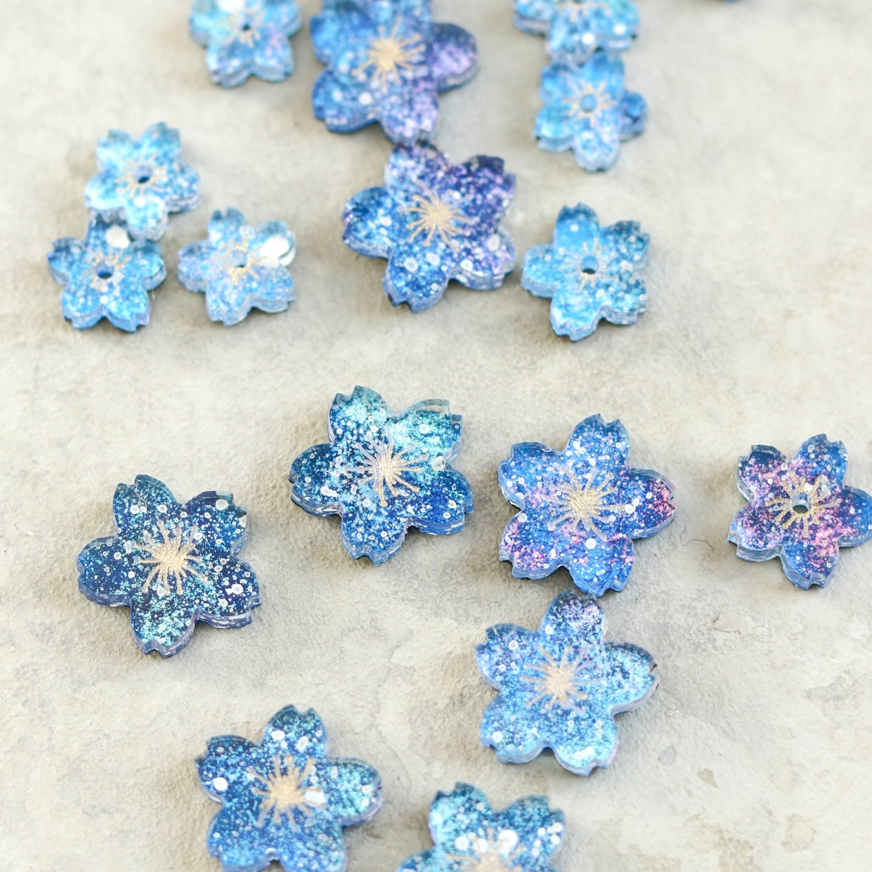 あの日見た、沖縄の満天の星。記憶を辿りながら、桜の形のアクリルパーツに5層ほど絵の具を重ね、うっとりするような星いっぱいの小さな夜空を描きました。