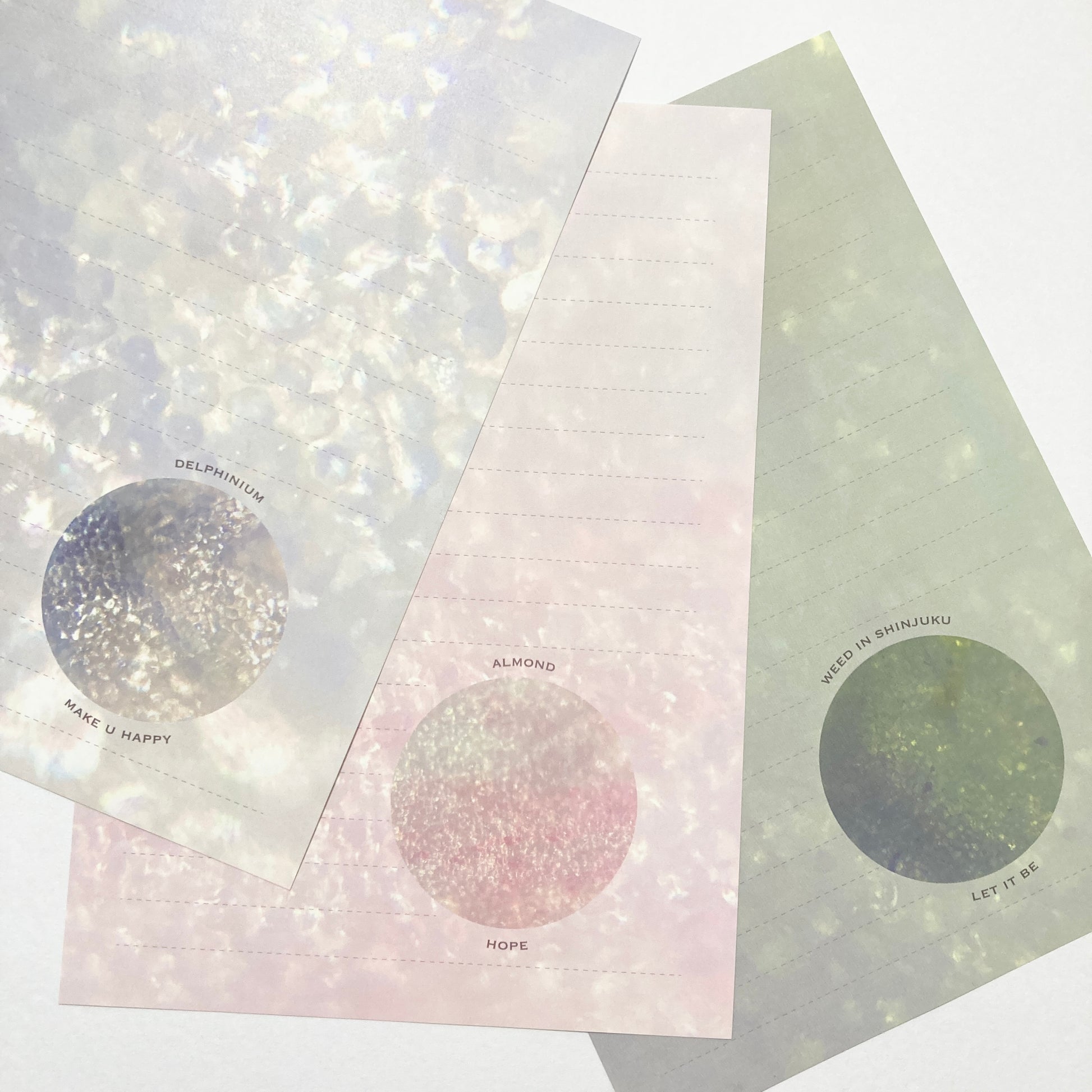 便箋は,花びらのmicroplanetsに,その花にまつわる花言葉を添えたデザインで、3種類の人気柄がラインナップ。