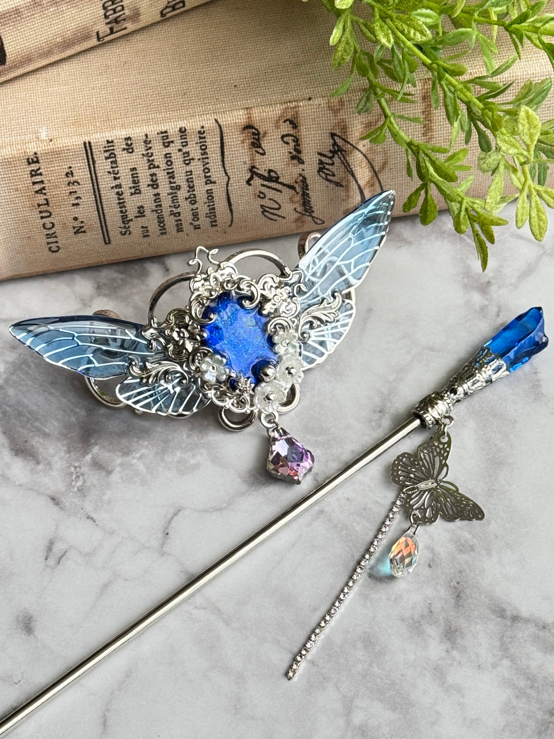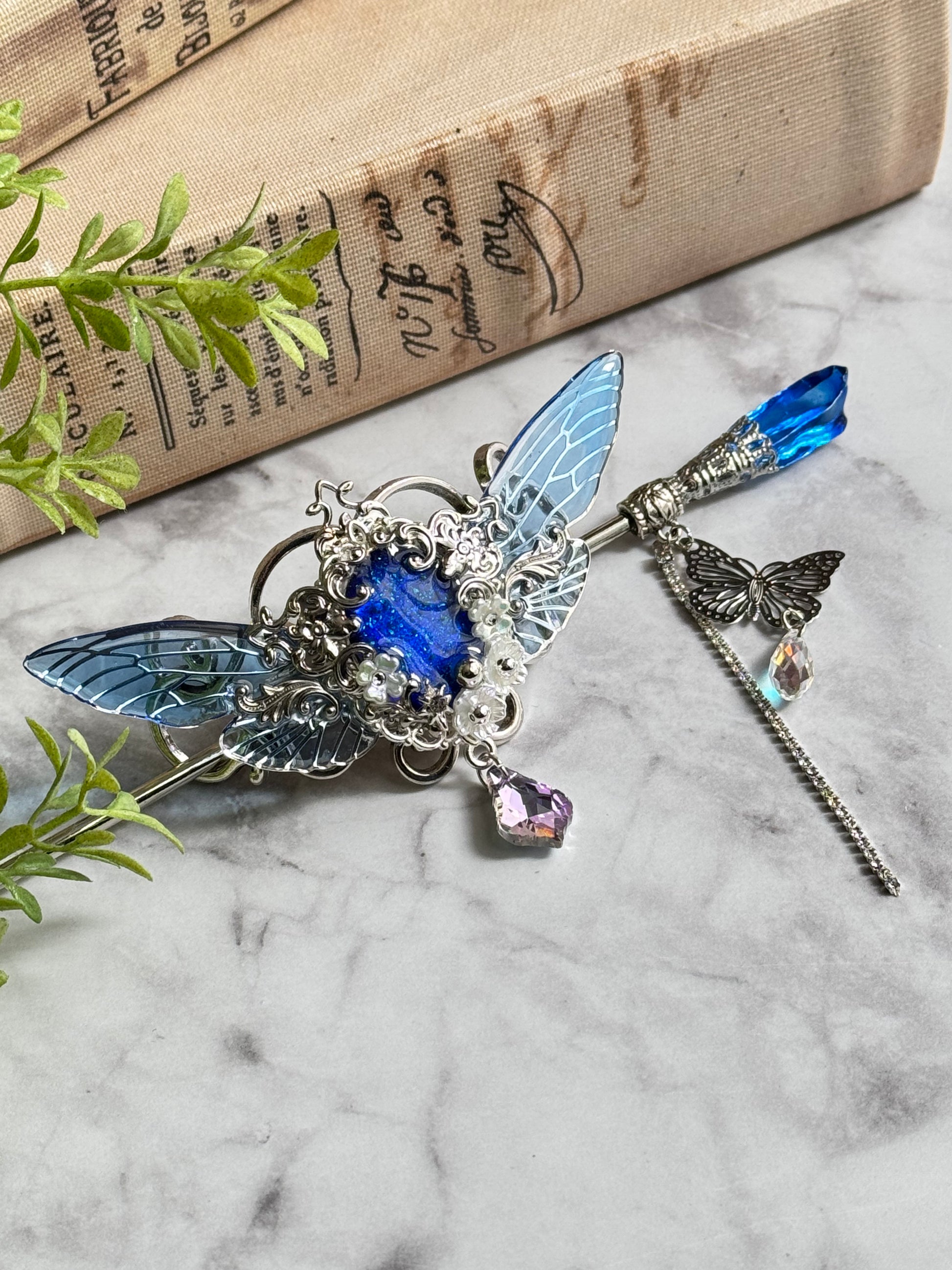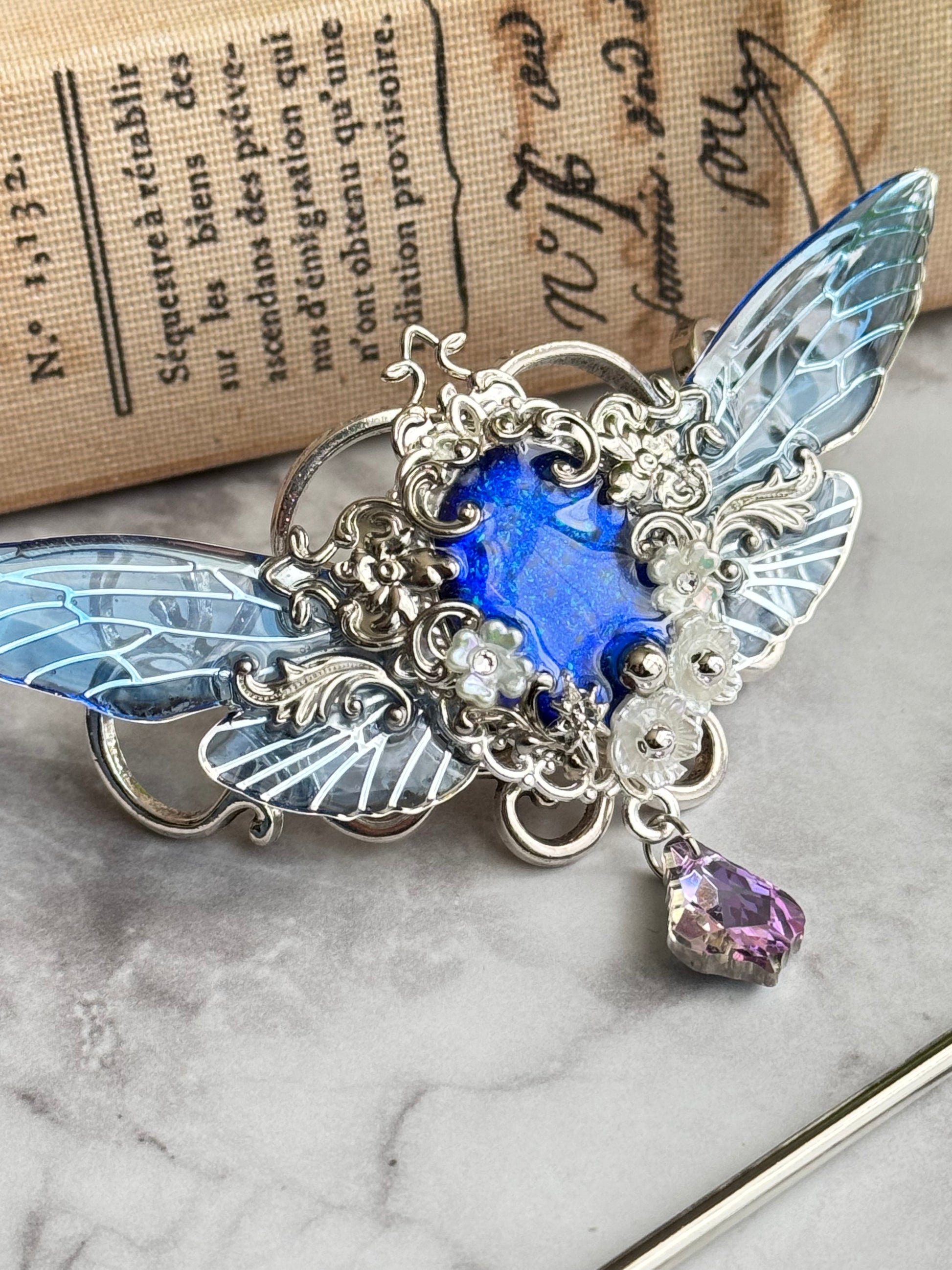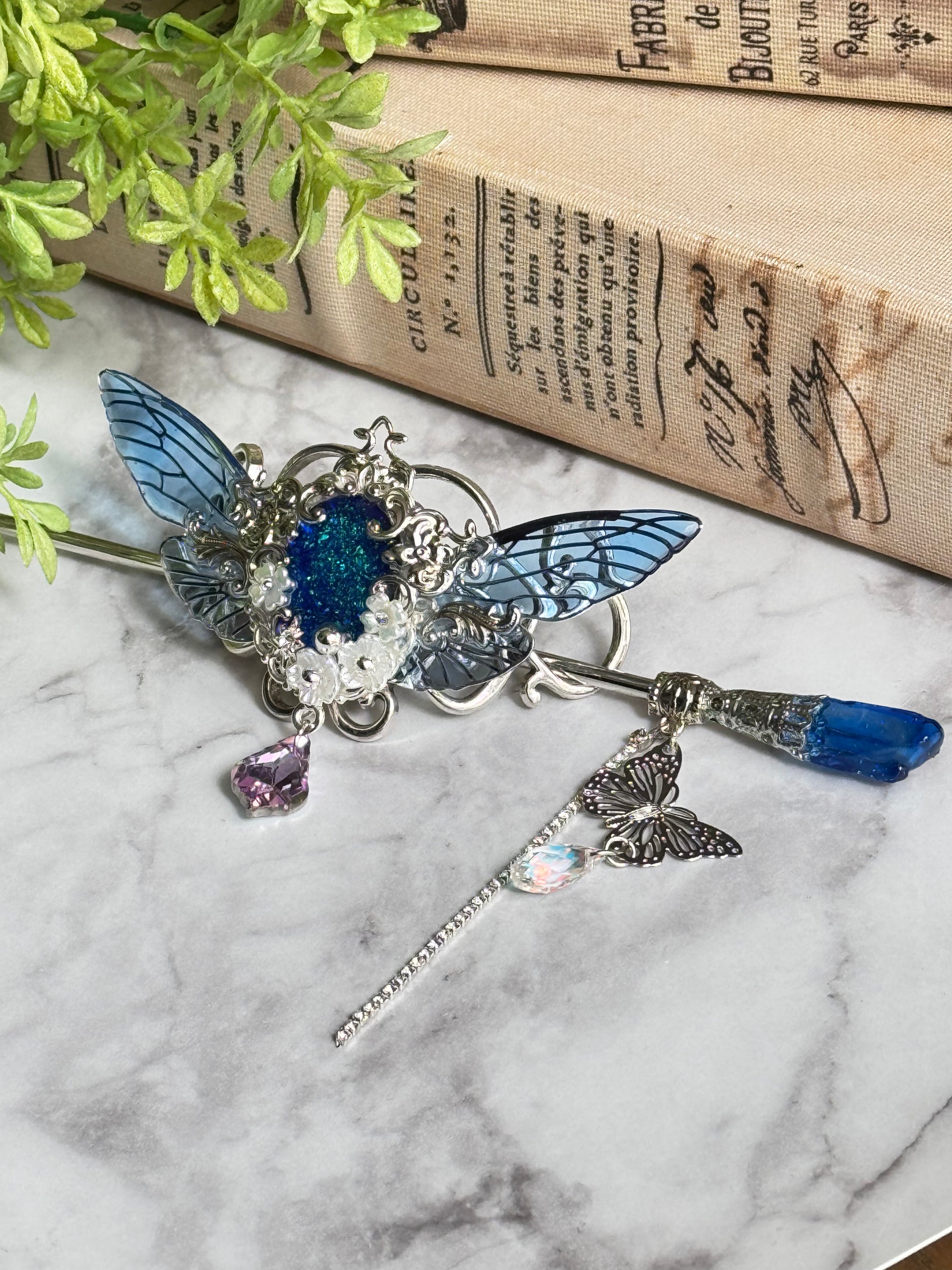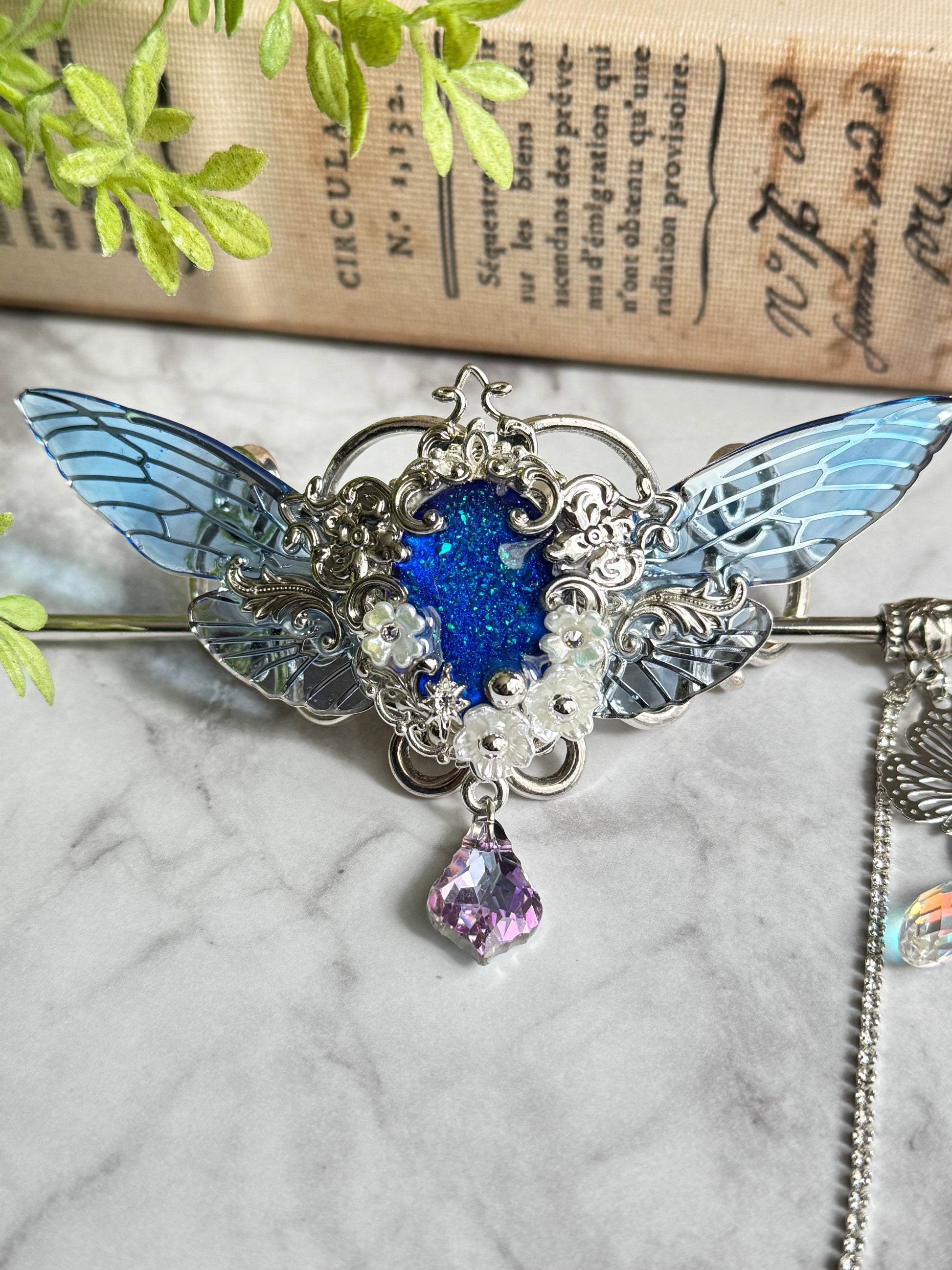 翅のカラーはレジンで着色されており、透き通る美しい青が印象的です。