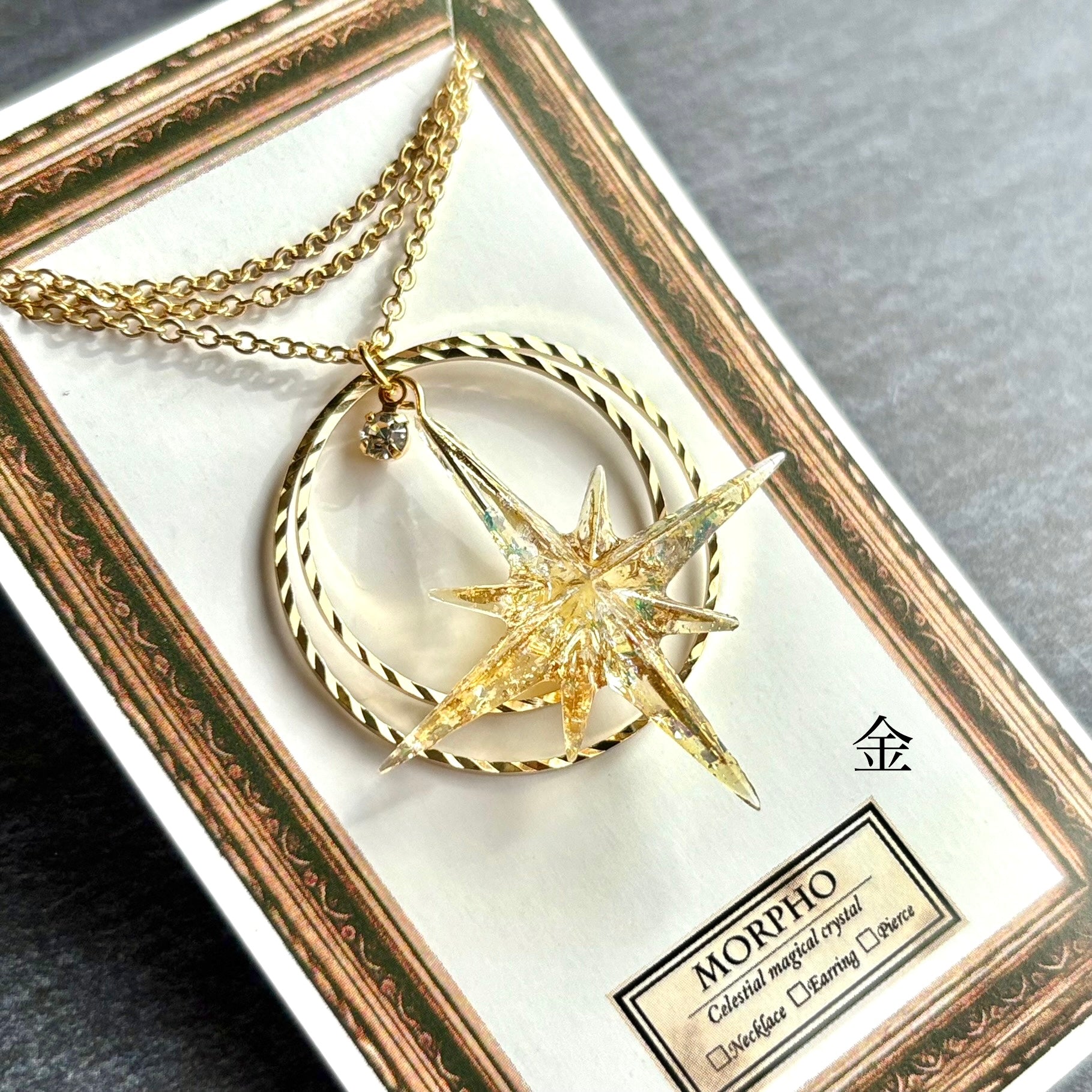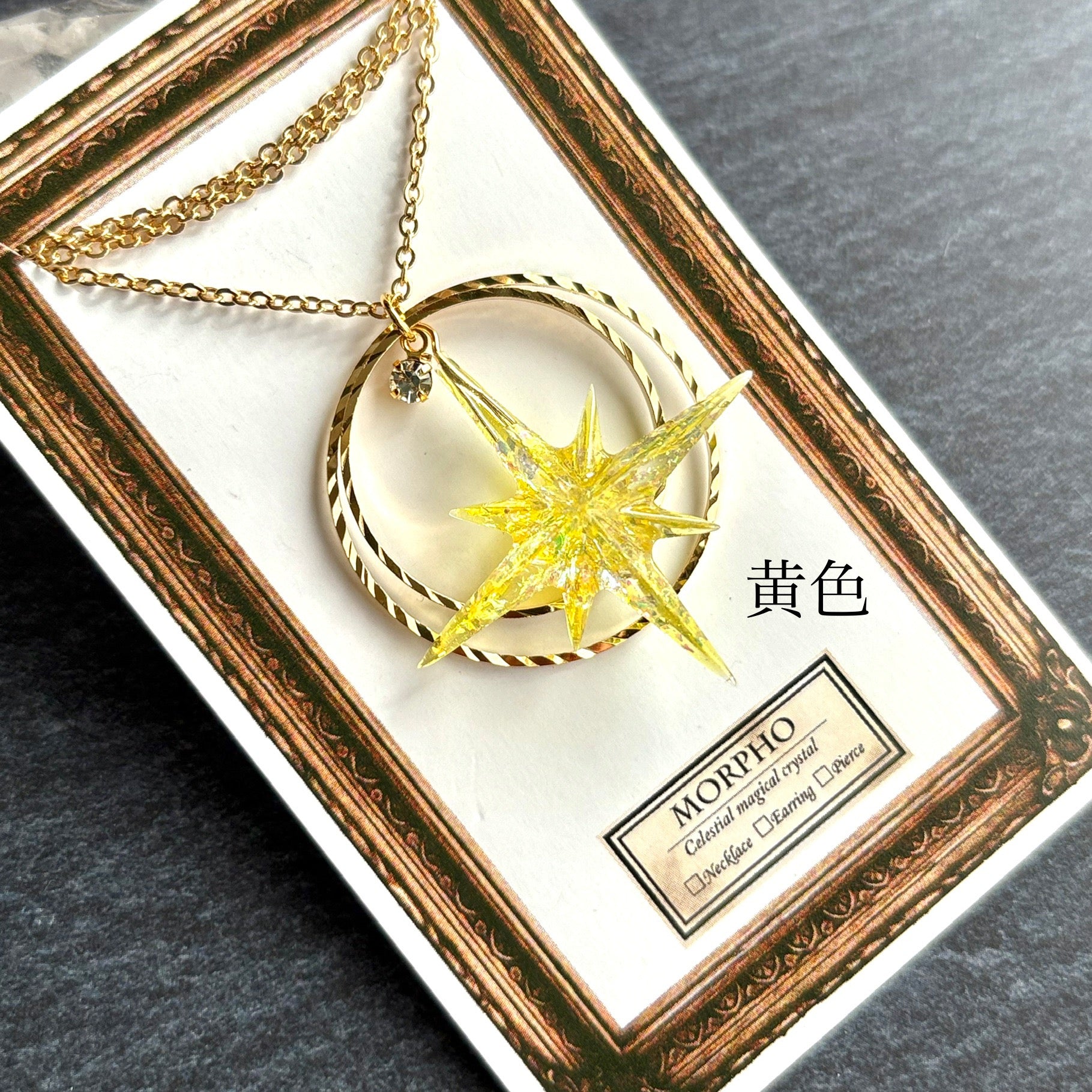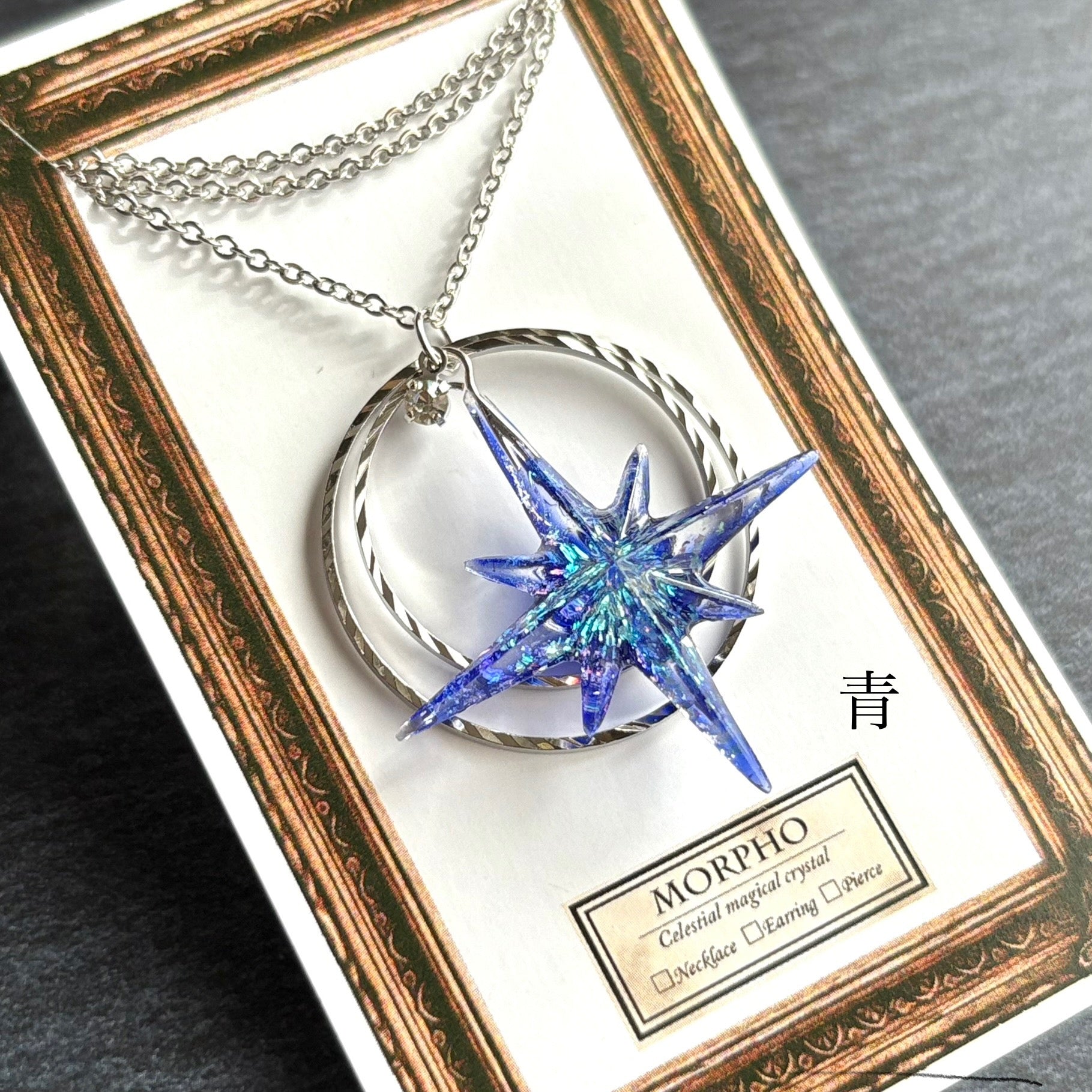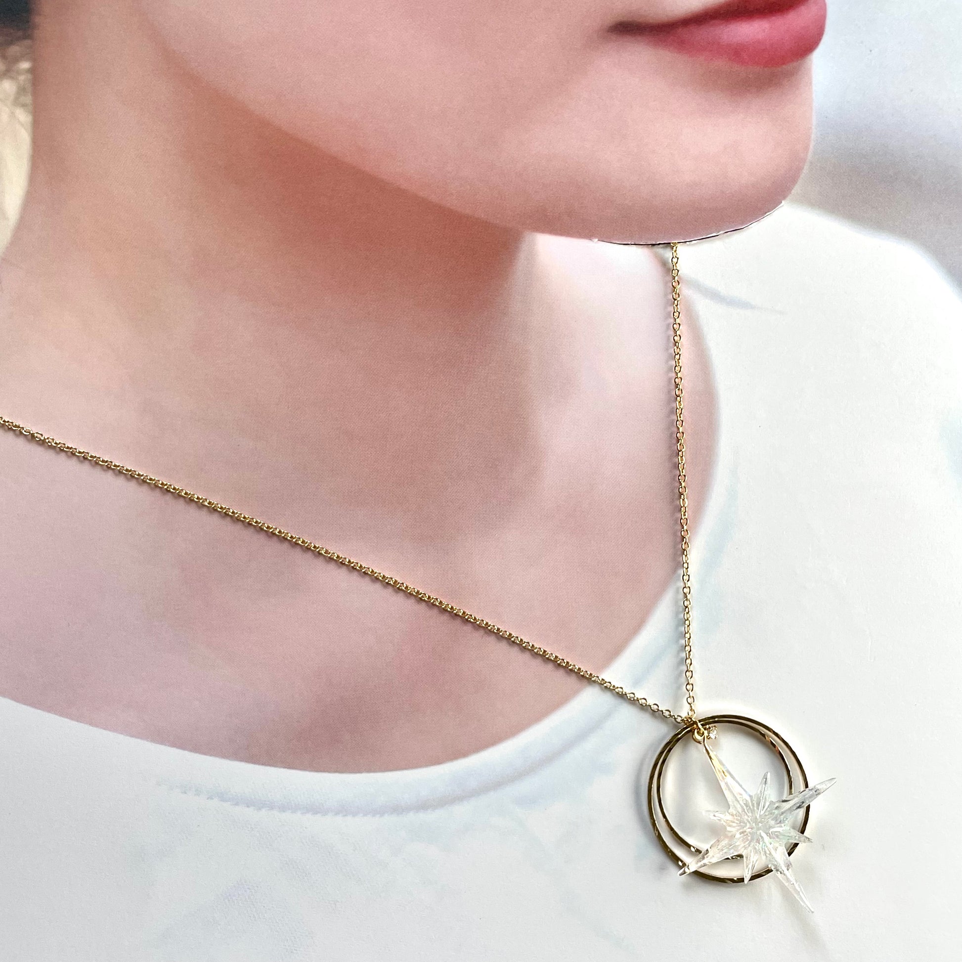 たくさんのきらめきを閉じ込めたシャープな形の星に、きらきらと輝くリングを組み合わせたネックレスです。胸元に大好きな色を飾れるように、カラーバリエーションを豊富に用意しました。あなたの推し色、見つけてください!