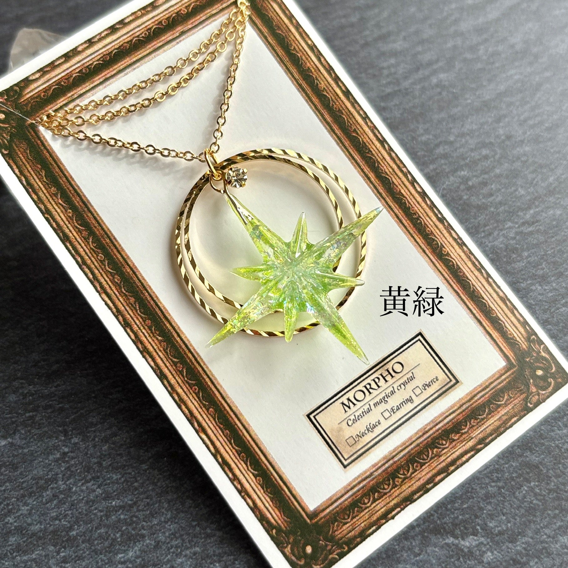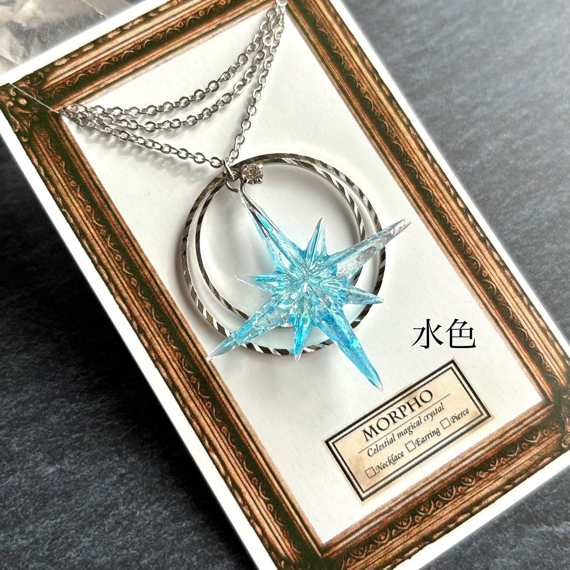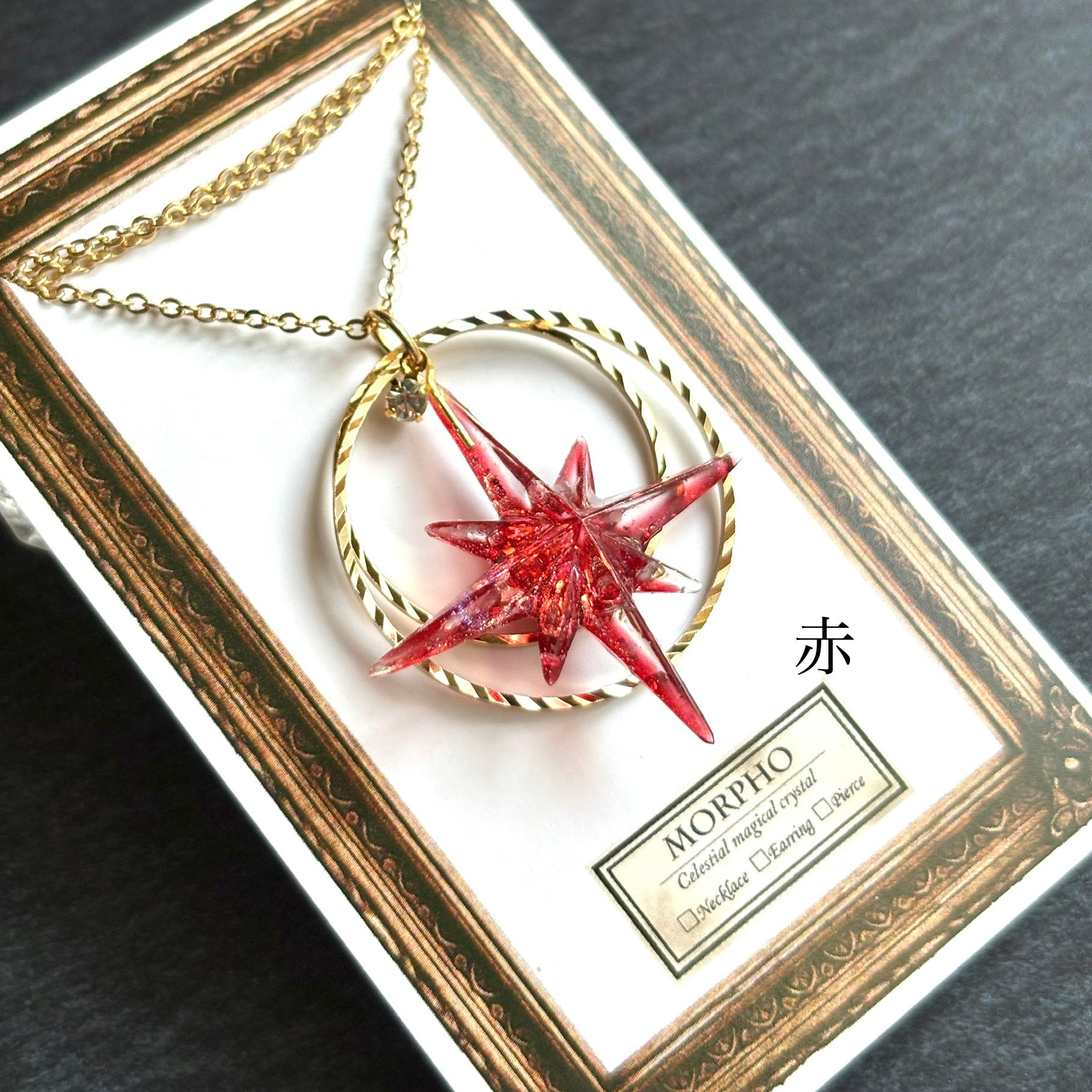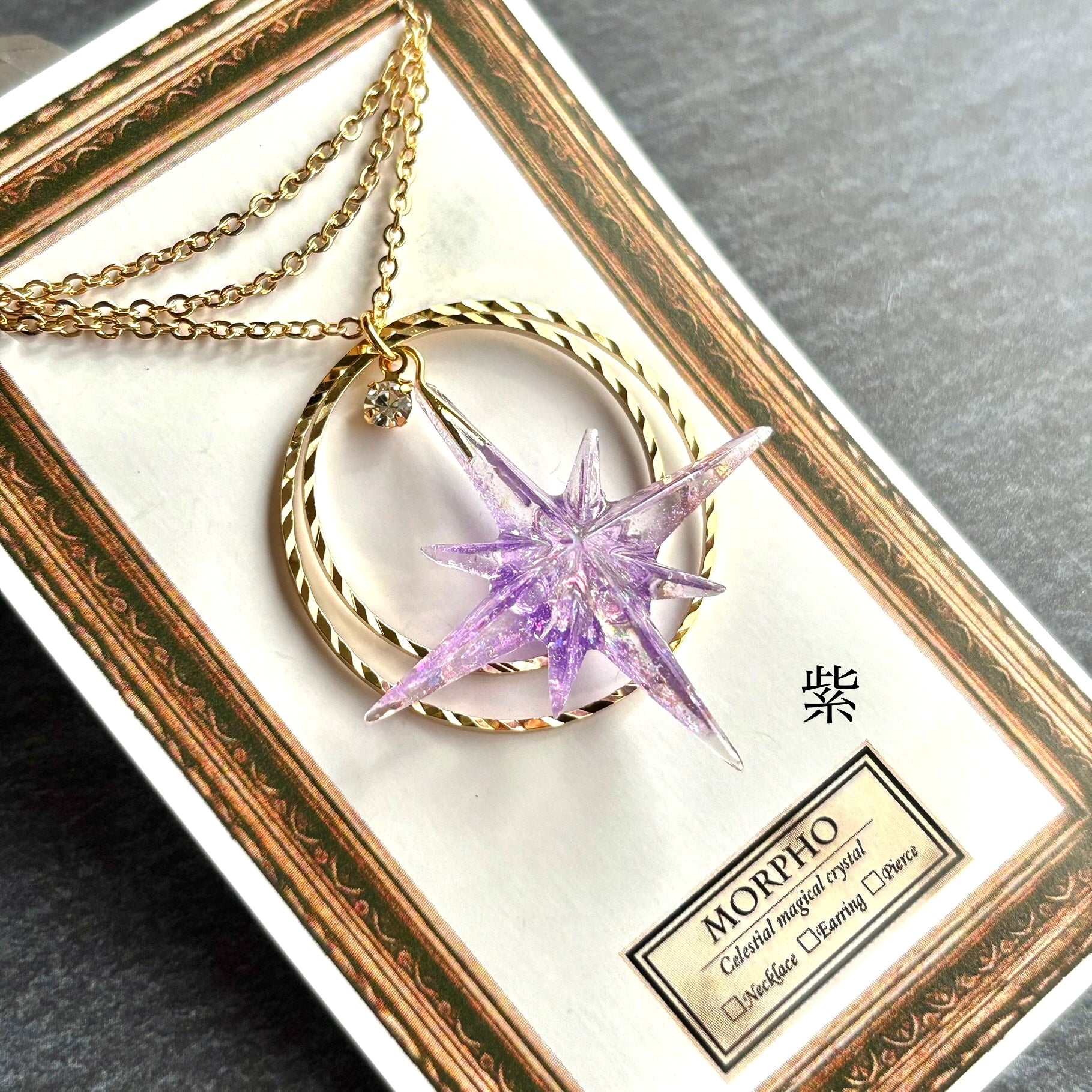 たくさんのきらめきを閉じ込めたシャープな形の星に、きらきらと輝くリングを組み合わせたネックレスです。胸元に大好きな色を飾れるように、カラーバリエーションを豊富に用意しました。あなたの推し色、見つけてください!
