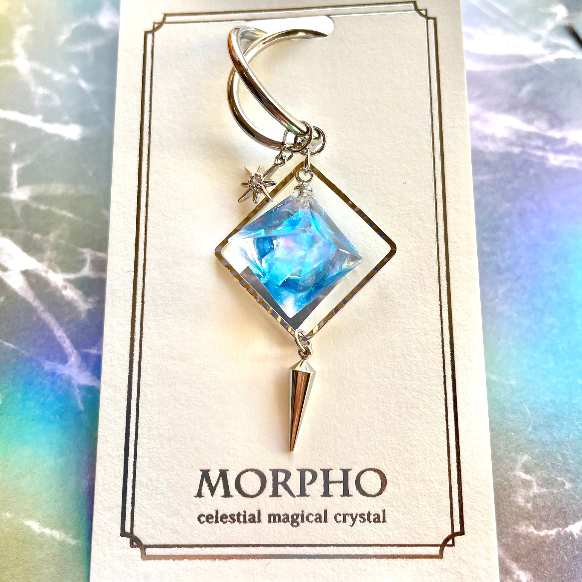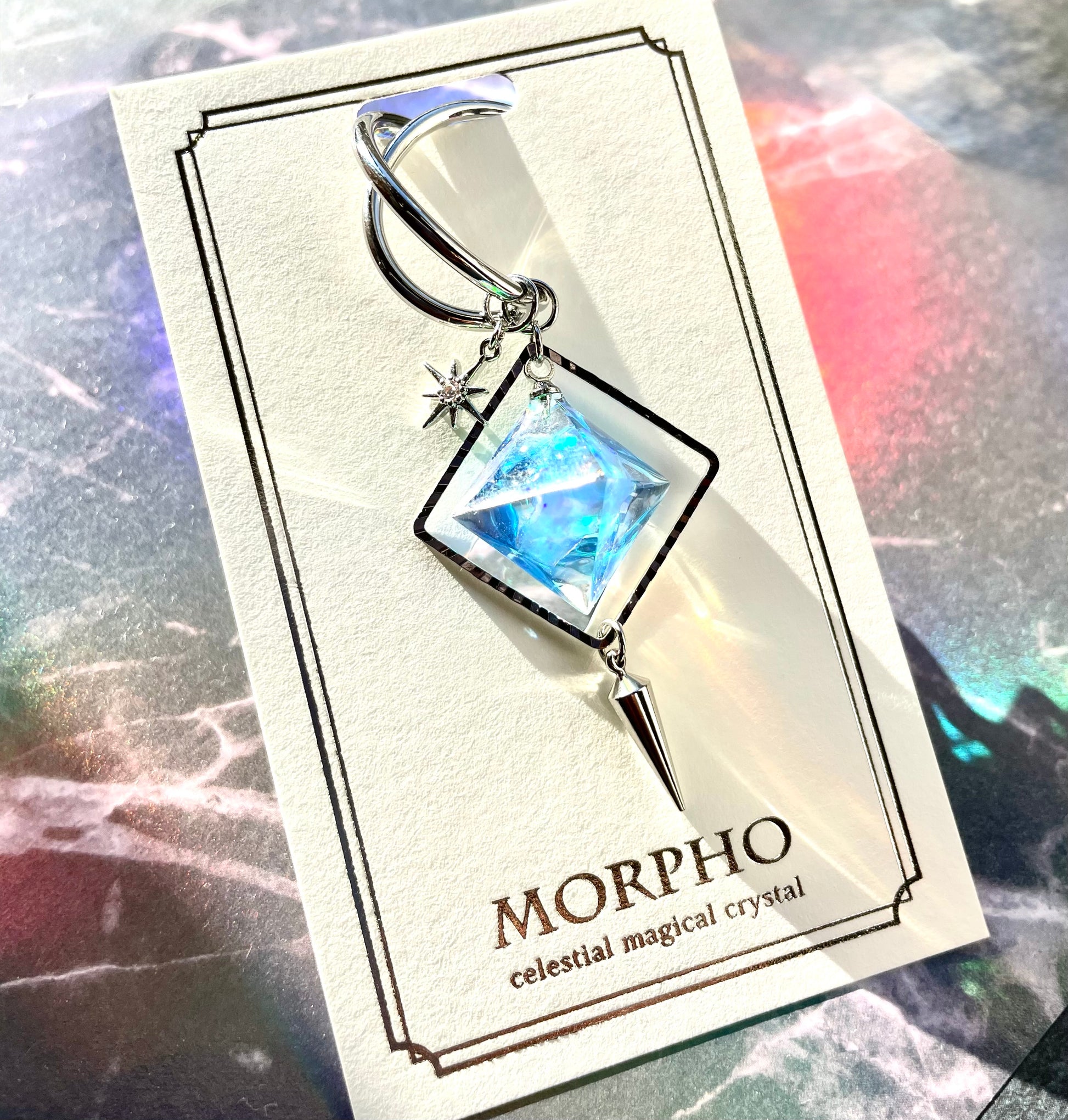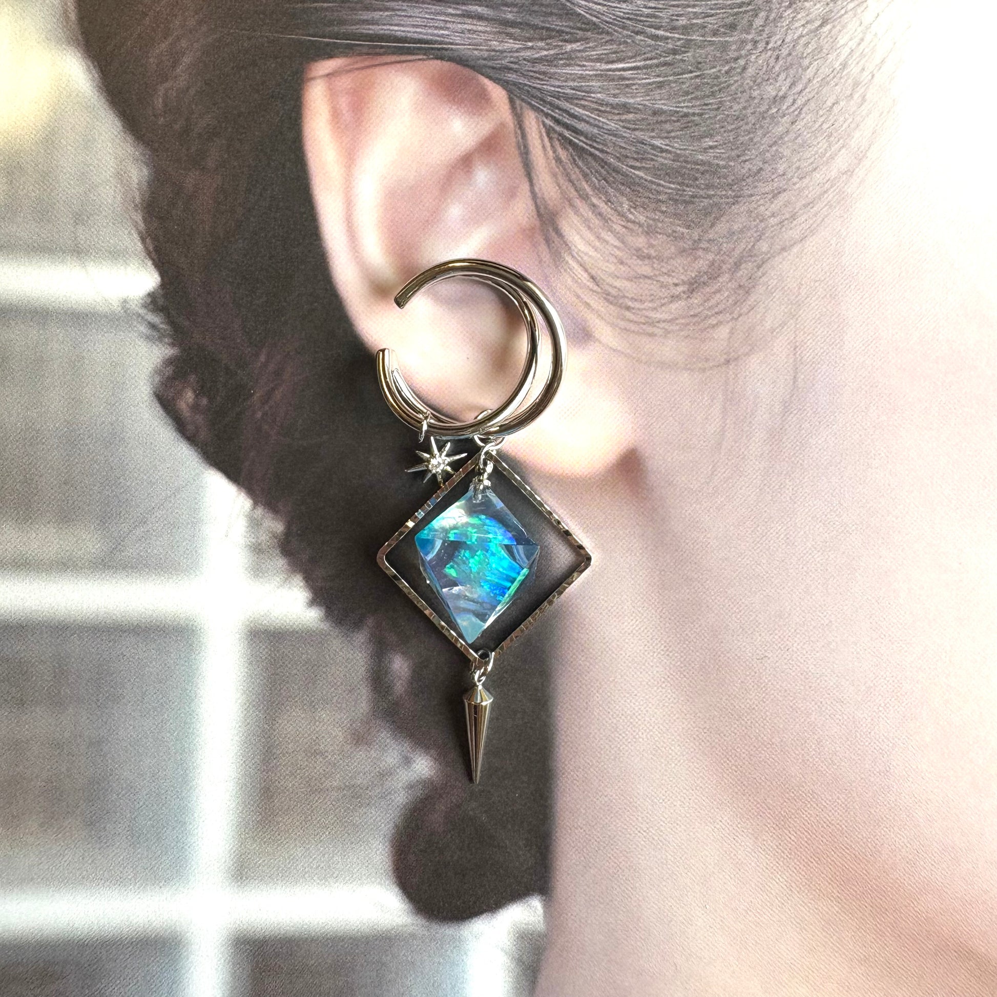 魔法の力が込められているように、内部から鮮やかな輝きを放つ八面体の形のレジン鉱石は、一つ一つ形の違う人工オパールを詰め込んで制作しています。