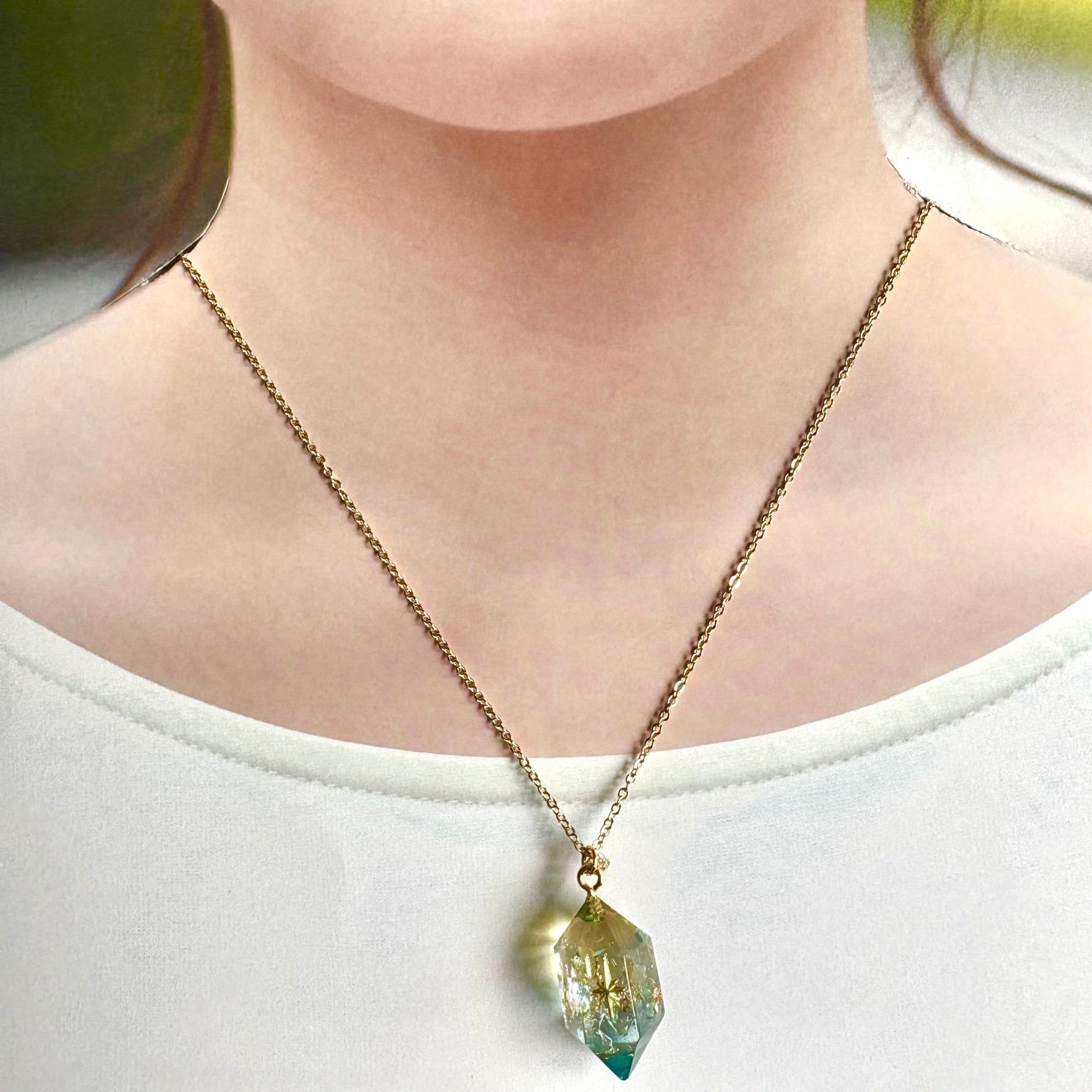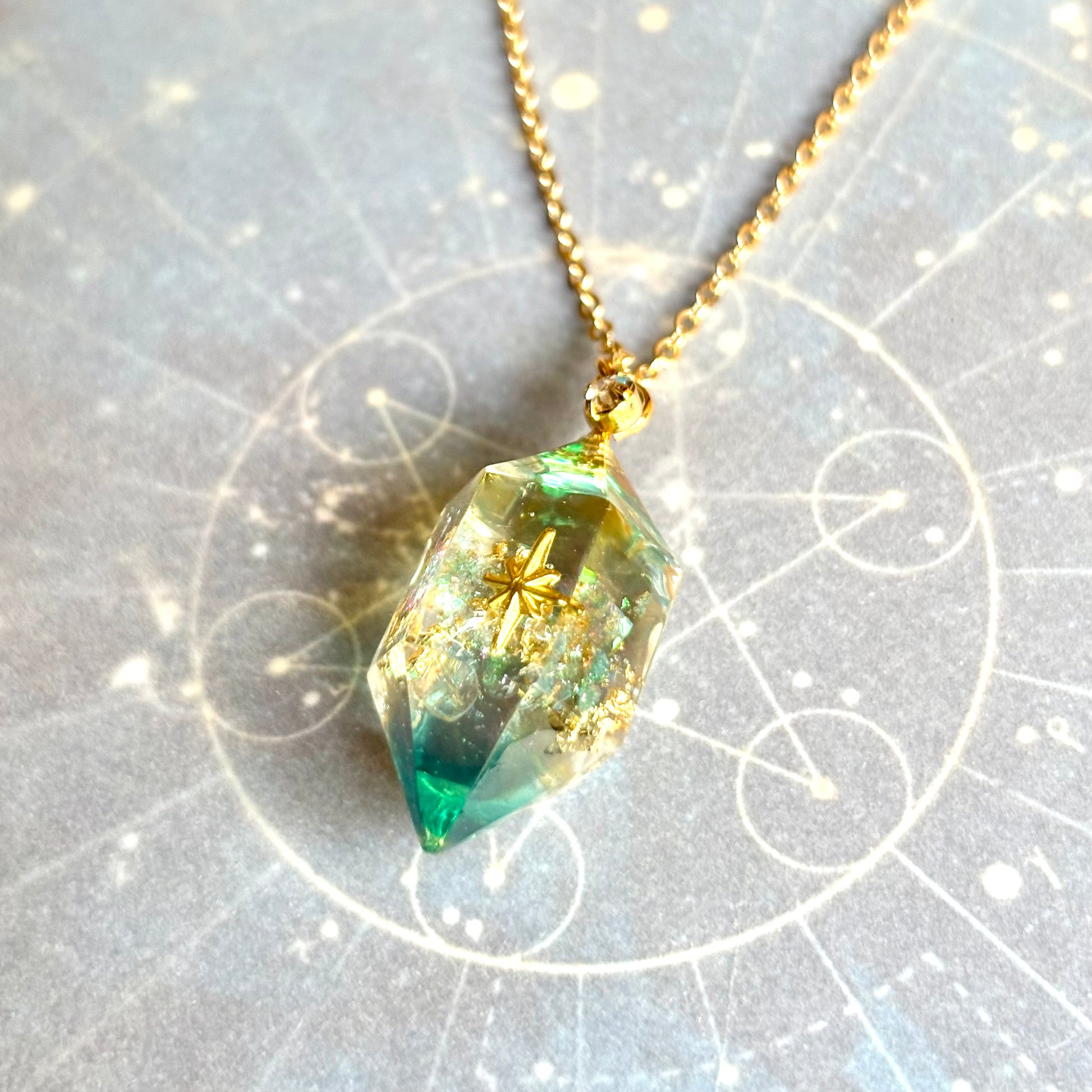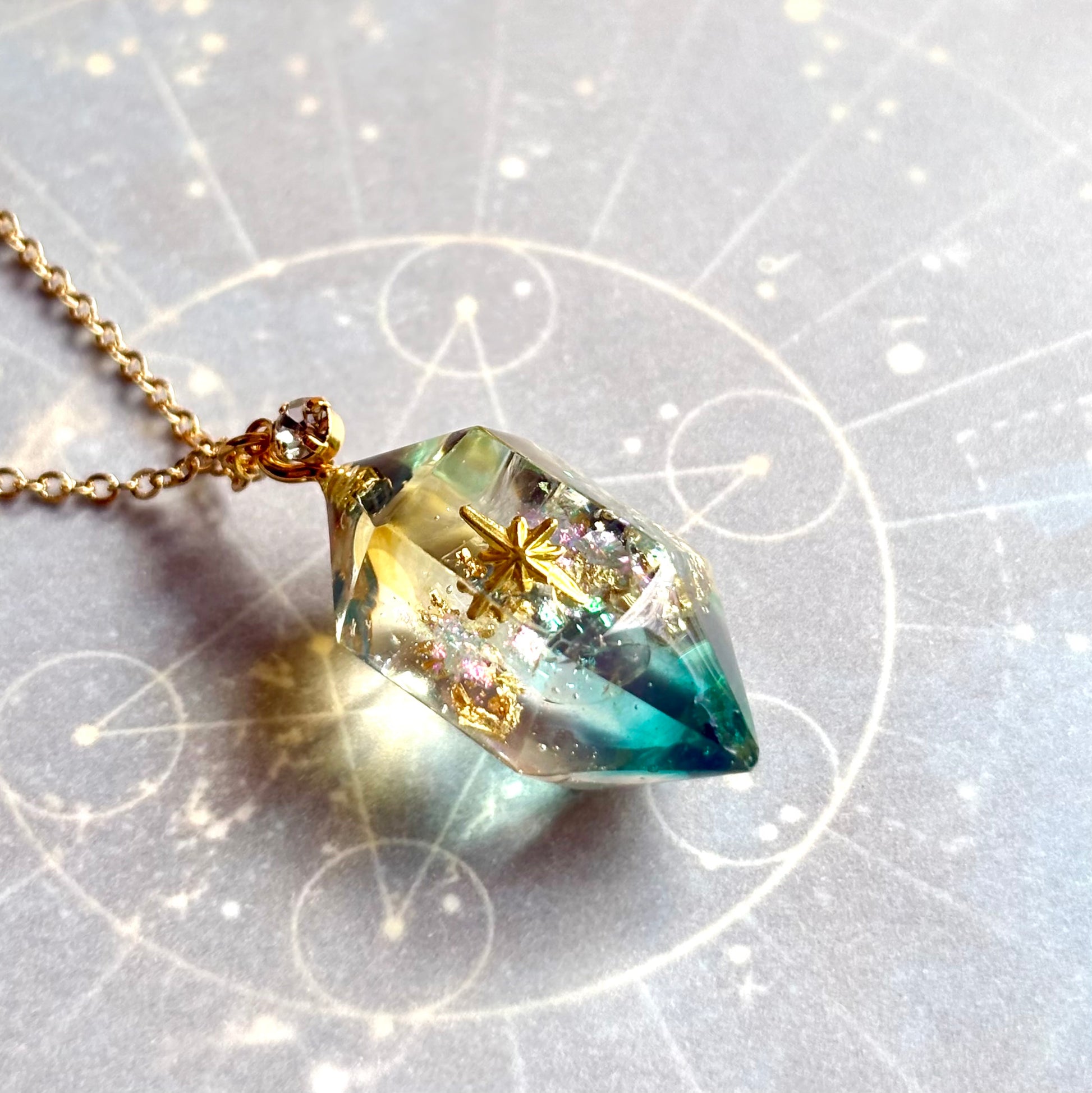 夜空を見上げた時に導いてくれるように輝く星を、小さな鉱石の中に閉じ込めました。柔らかな琥珀色からグリーンのグラデーションカラーは優しく心を癒してくれるような、穏やかな輝きを放ちます。金箔やホログラムを閉じ込めており、色々な角度から覗いても楽しい作品となっております。