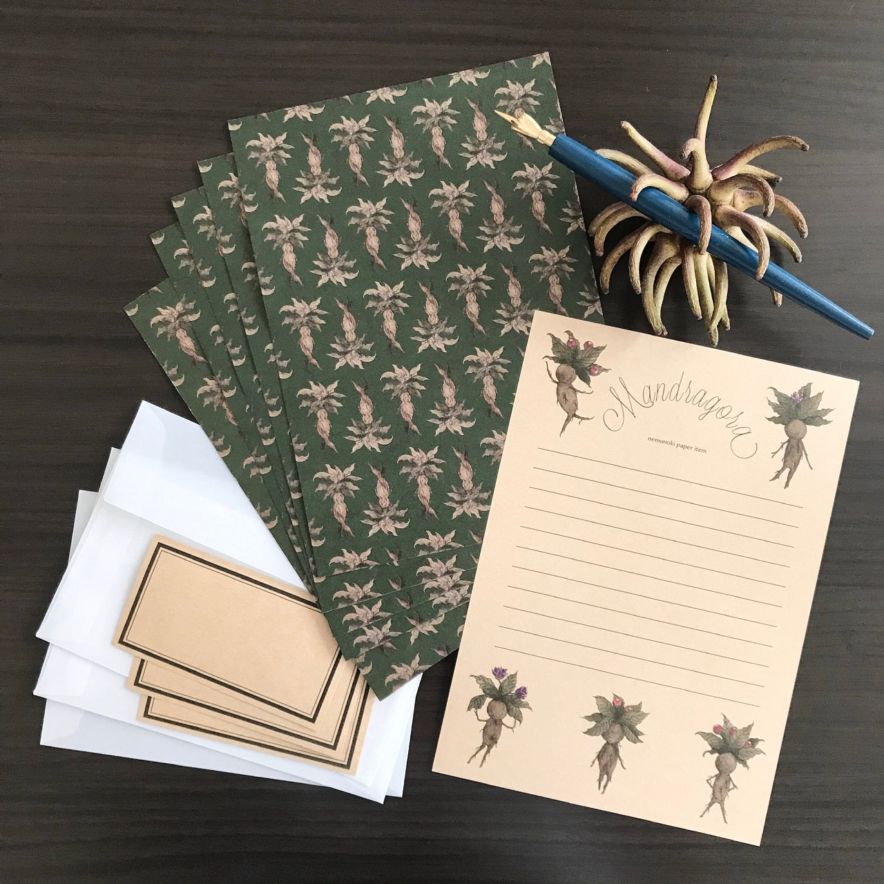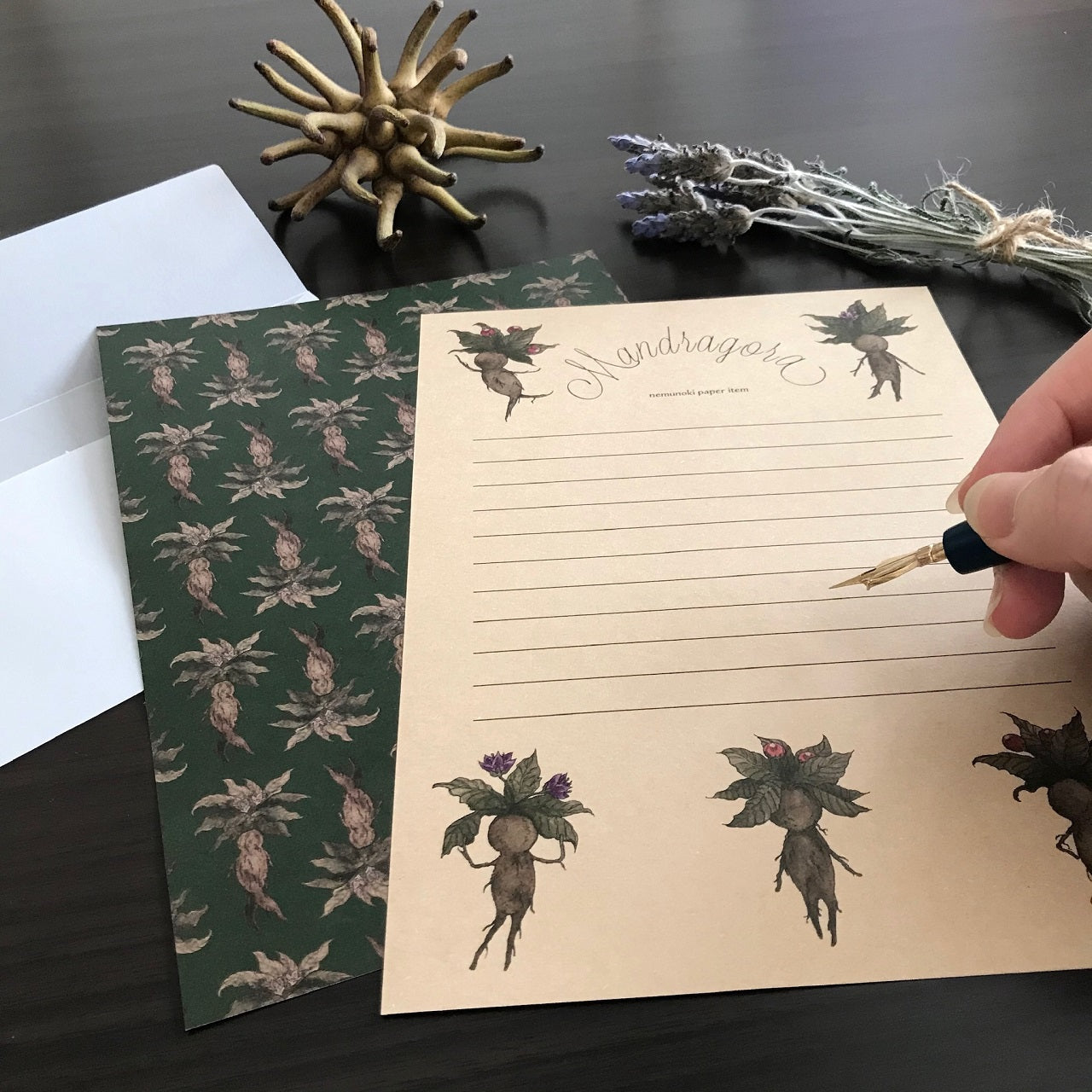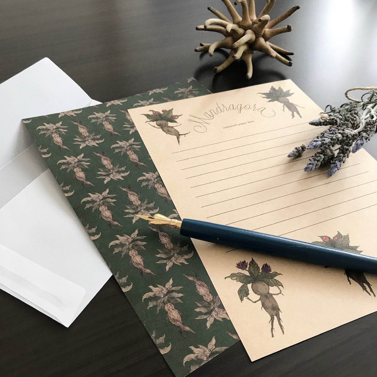 濃い色が特徴の未晒クラフトを使用したレターセットは、初代マンドラゴラの柄を表にプリント。トレーシング封筒から透けるグリーンが、不思議な魅力を醸し出しています。