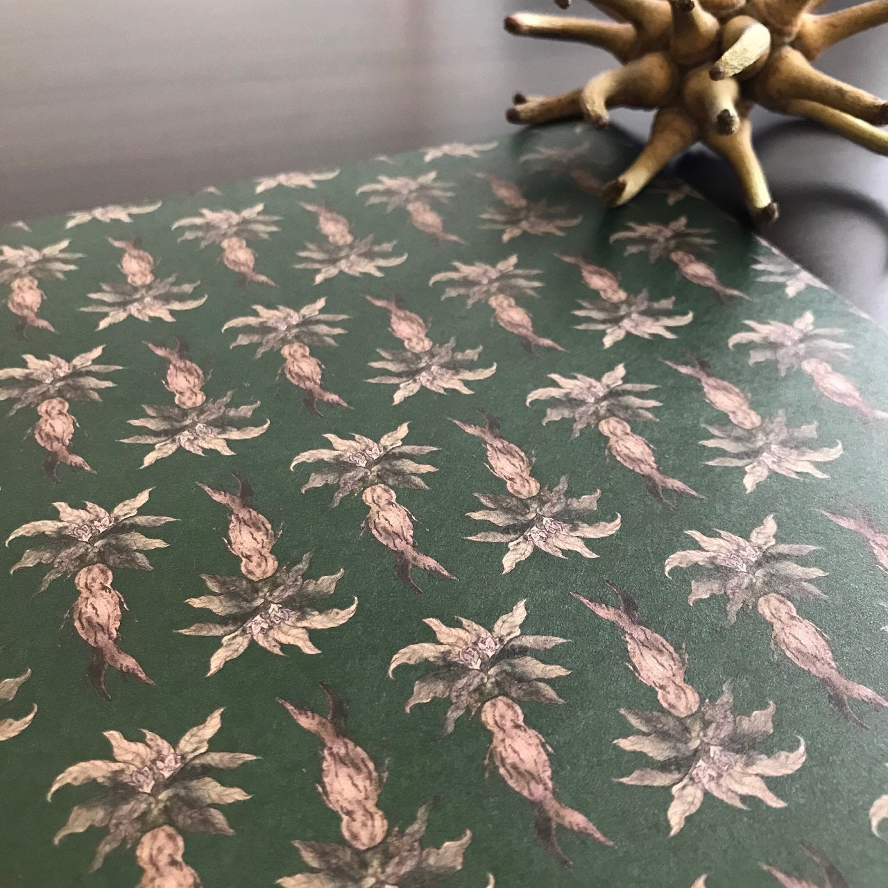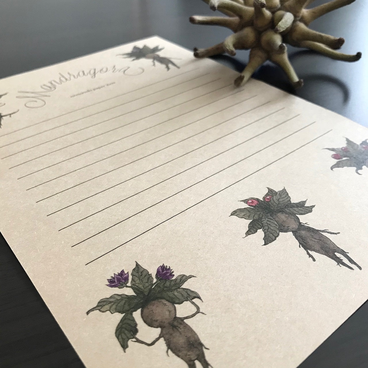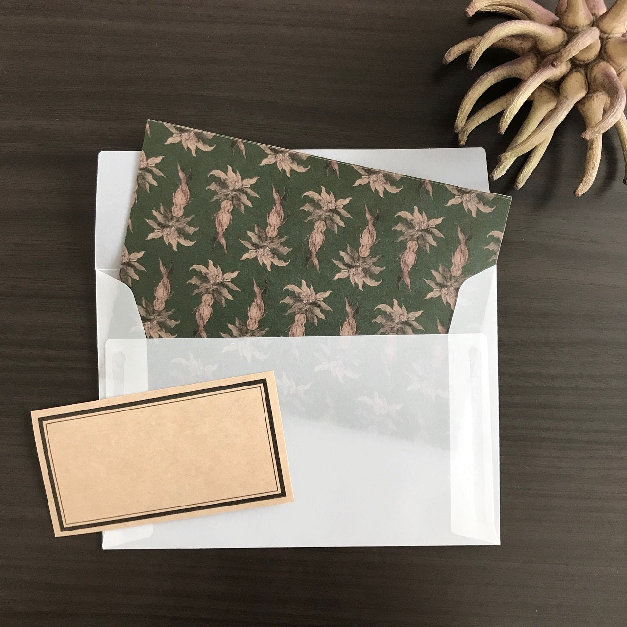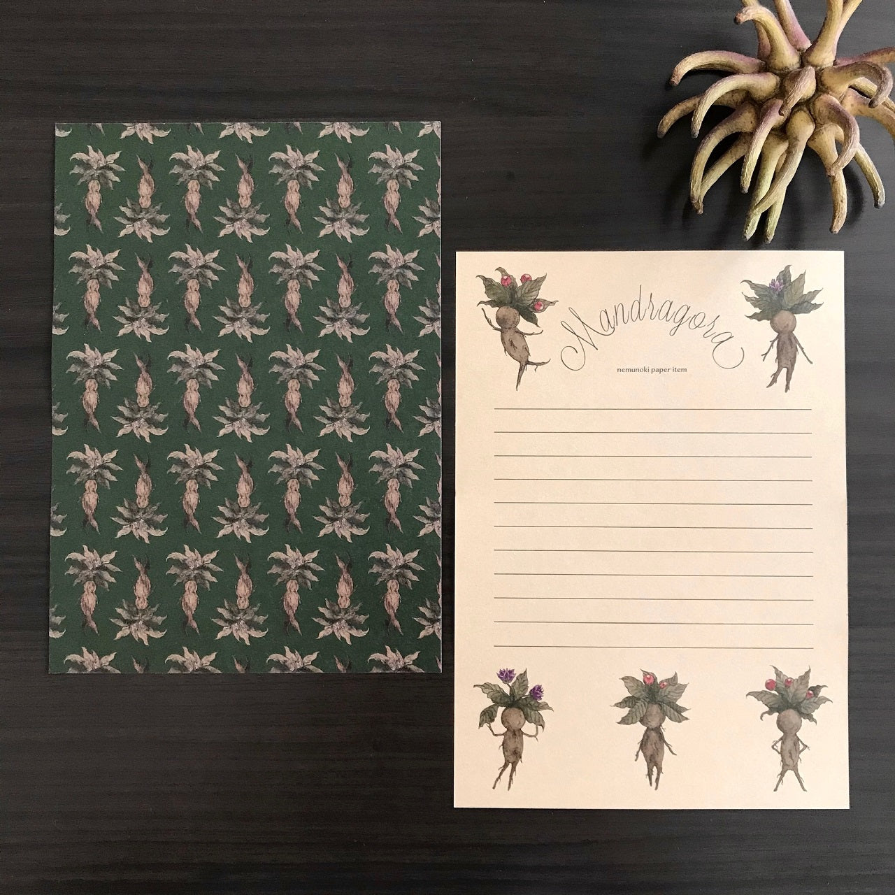 濃い色が特徴の未晒クラフトを使用したレターセットは、初代マンドラゴラの柄を表にプリント。トレーシング封筒から透けるグリーンが、不思議な魅力を醸し出しています。