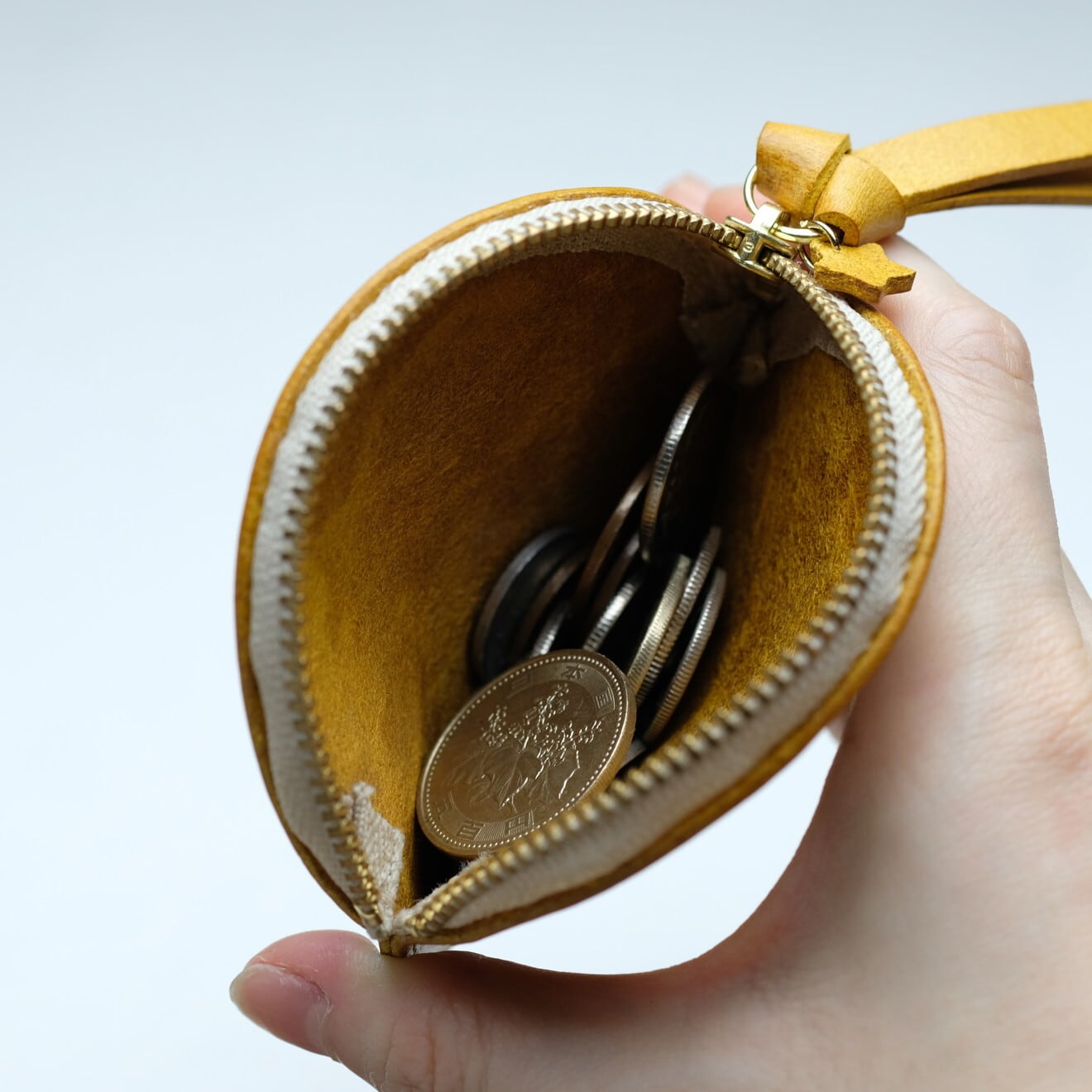 満月のようなイエローのレザーはロウ引き加工が施されており、お使いいただくうちに深みのあるブラウンへと変化し、ツヤも増していきます。