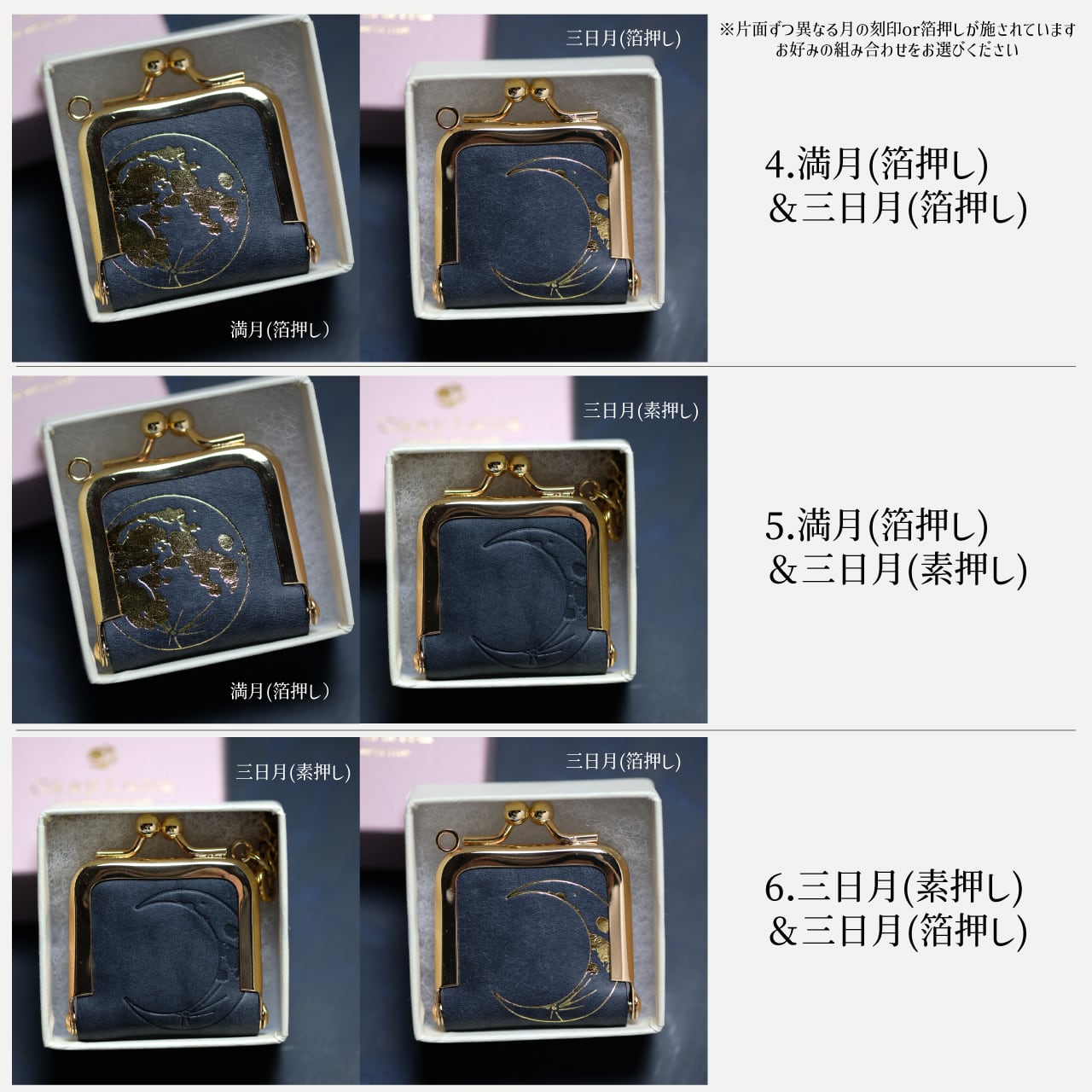 新月(素押し刻印)・満月(箔押し)・三日月(素押し刻印)・三日月(箔押し)を組み合わせた6種類のデザインからお選びいただけます。